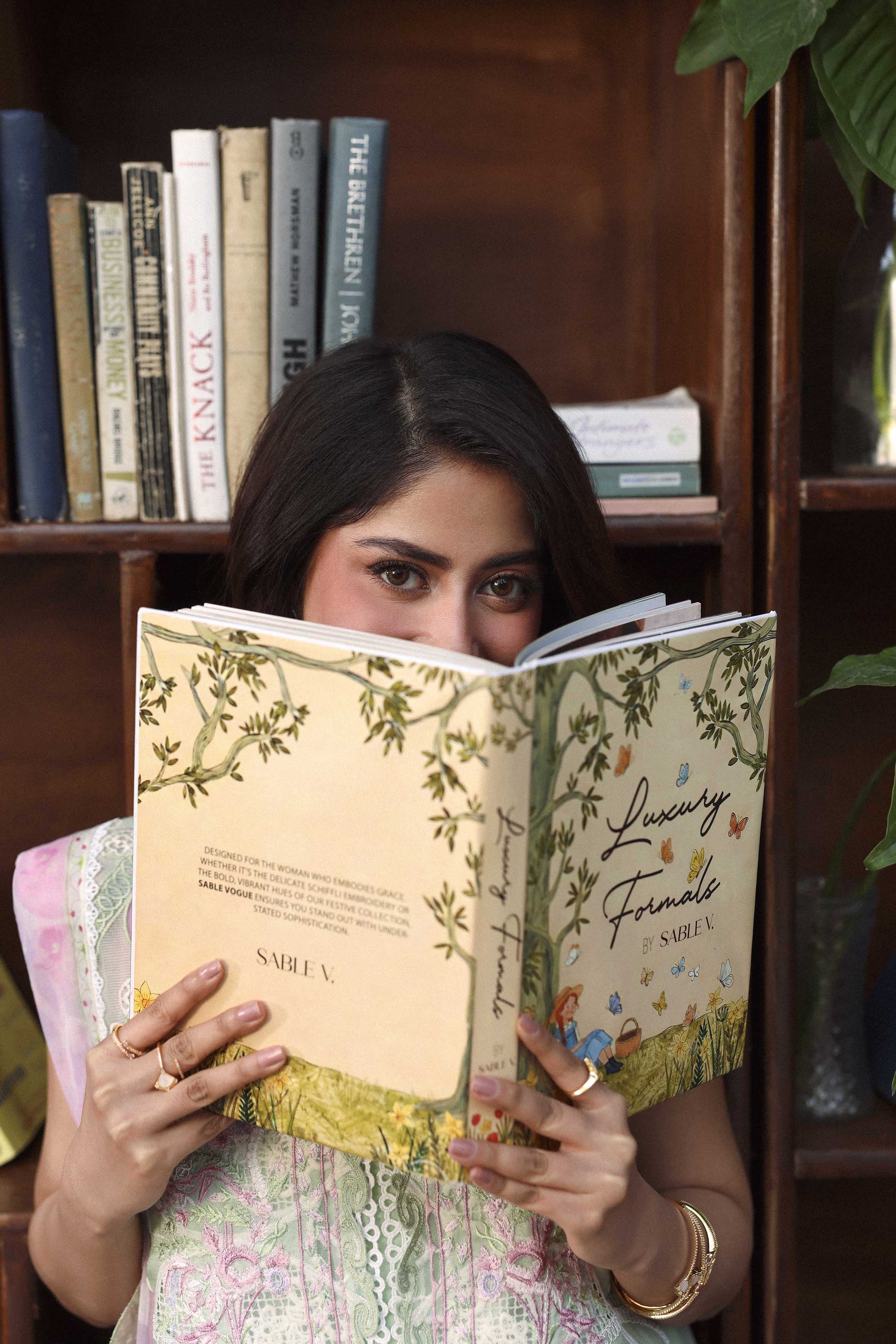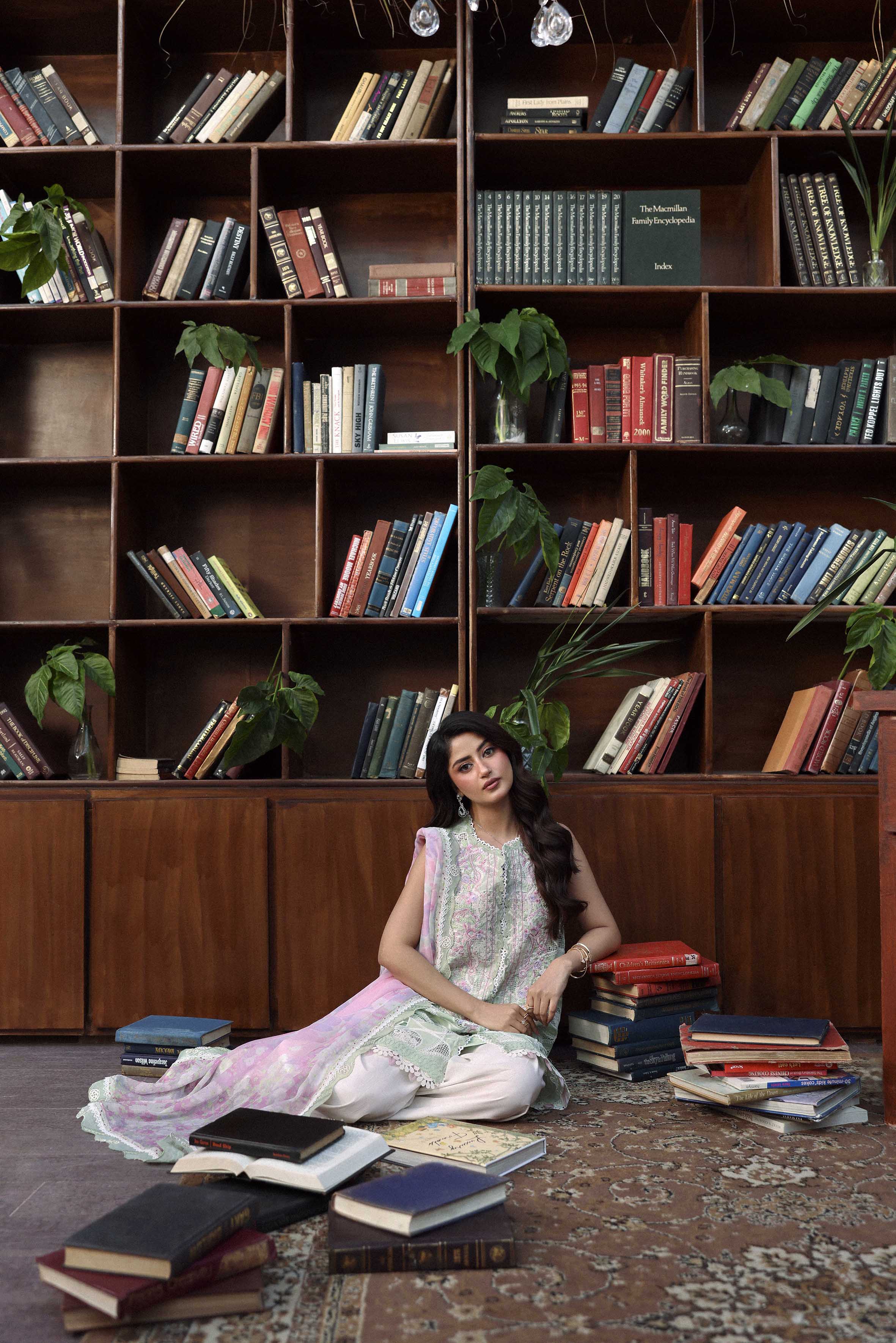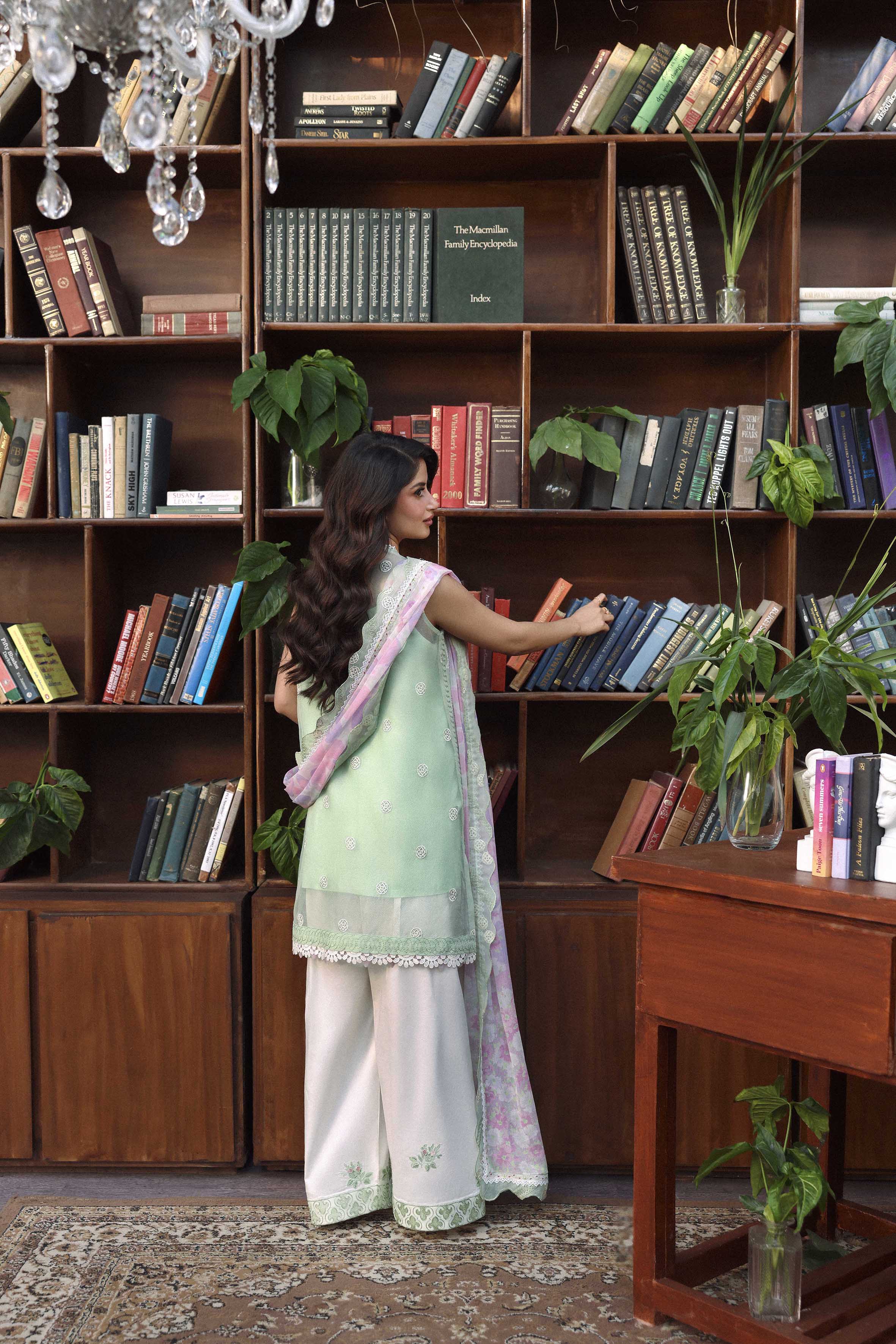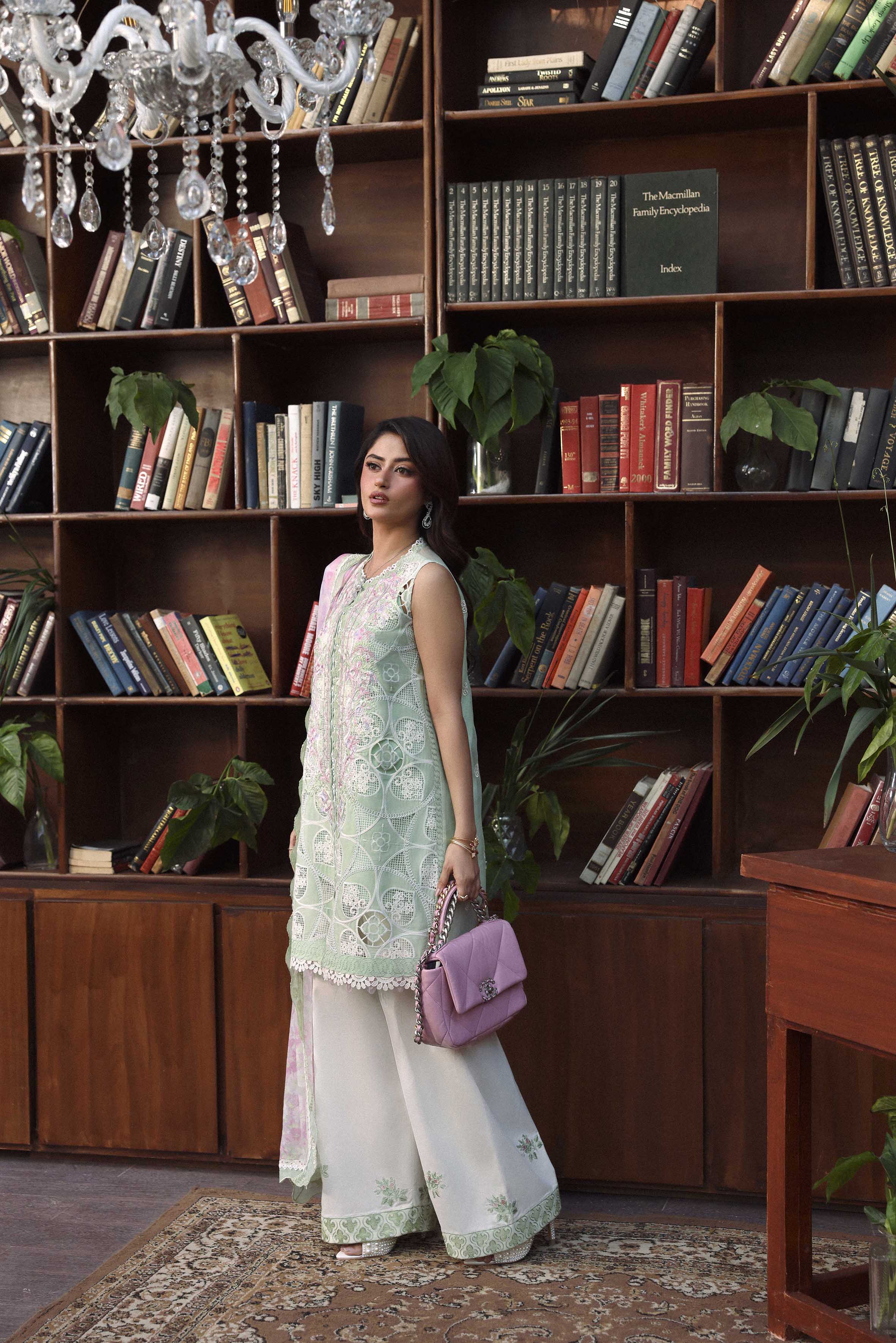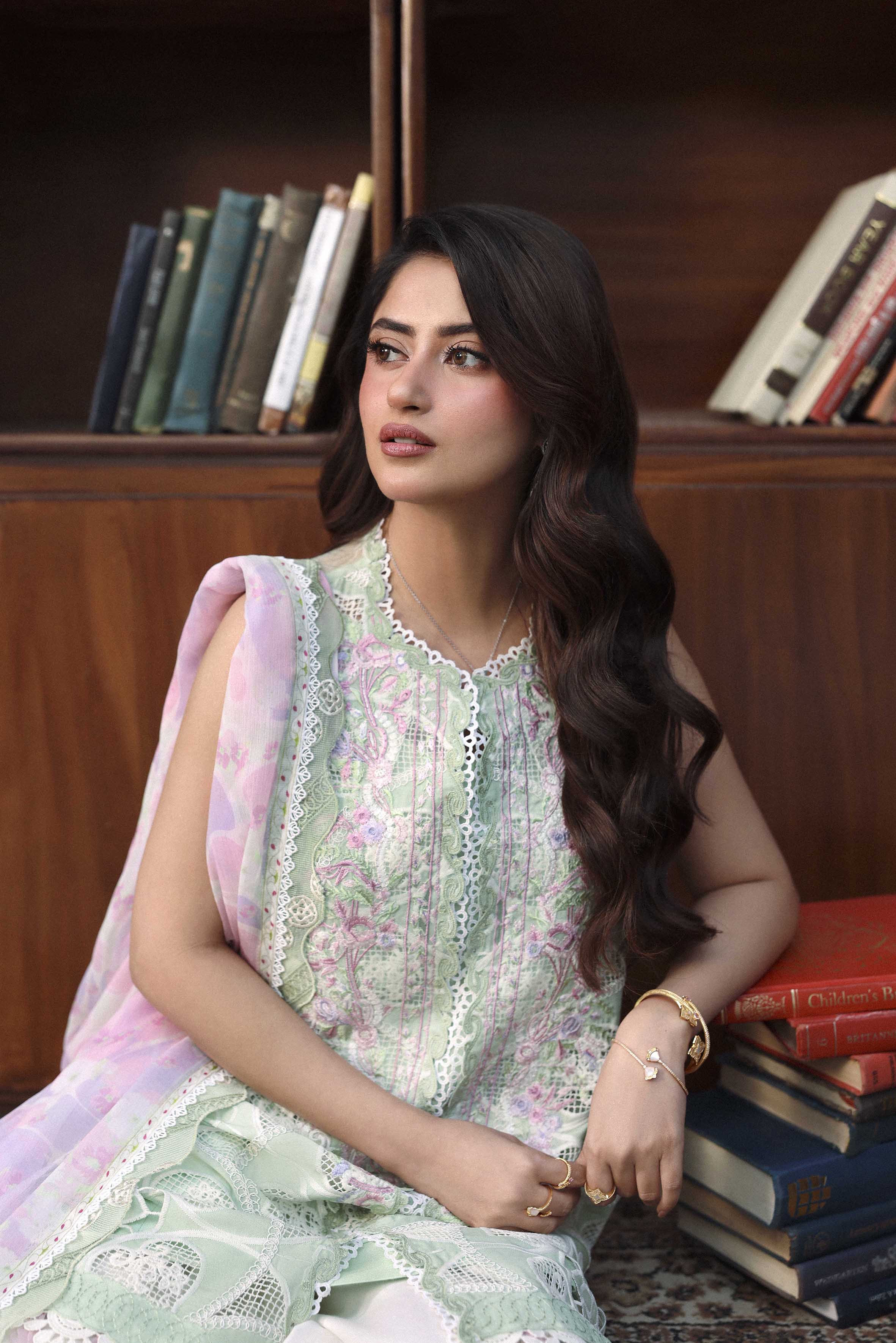 Summary: Radiate elegance in this exquisite Green Pakistani suit worn by the stunning Sajal Aly. Part of the Sable Vogue Luxury Formals collection, this ensemble features a meticulously crafted shirt adorned with intricate Schiffli embroidery and boring cutwork on Swiss Voile, creating a breathtaking visual texture. The pastel green hue is perfectly complemented by delicate pink floral accents, evoking the freshness of Spring/Summer. Paired with a digital printed Chiffon dupatta in soft lavender and pink tones, this unstitched dress material is the epitome of sophistication. Ideal for festive occasions, Eid celebrations, or Mehndi functions, this luxury outfit promises a regal look. Shop this authentic Pakistani dress online to elevate your party wear wardrobe.