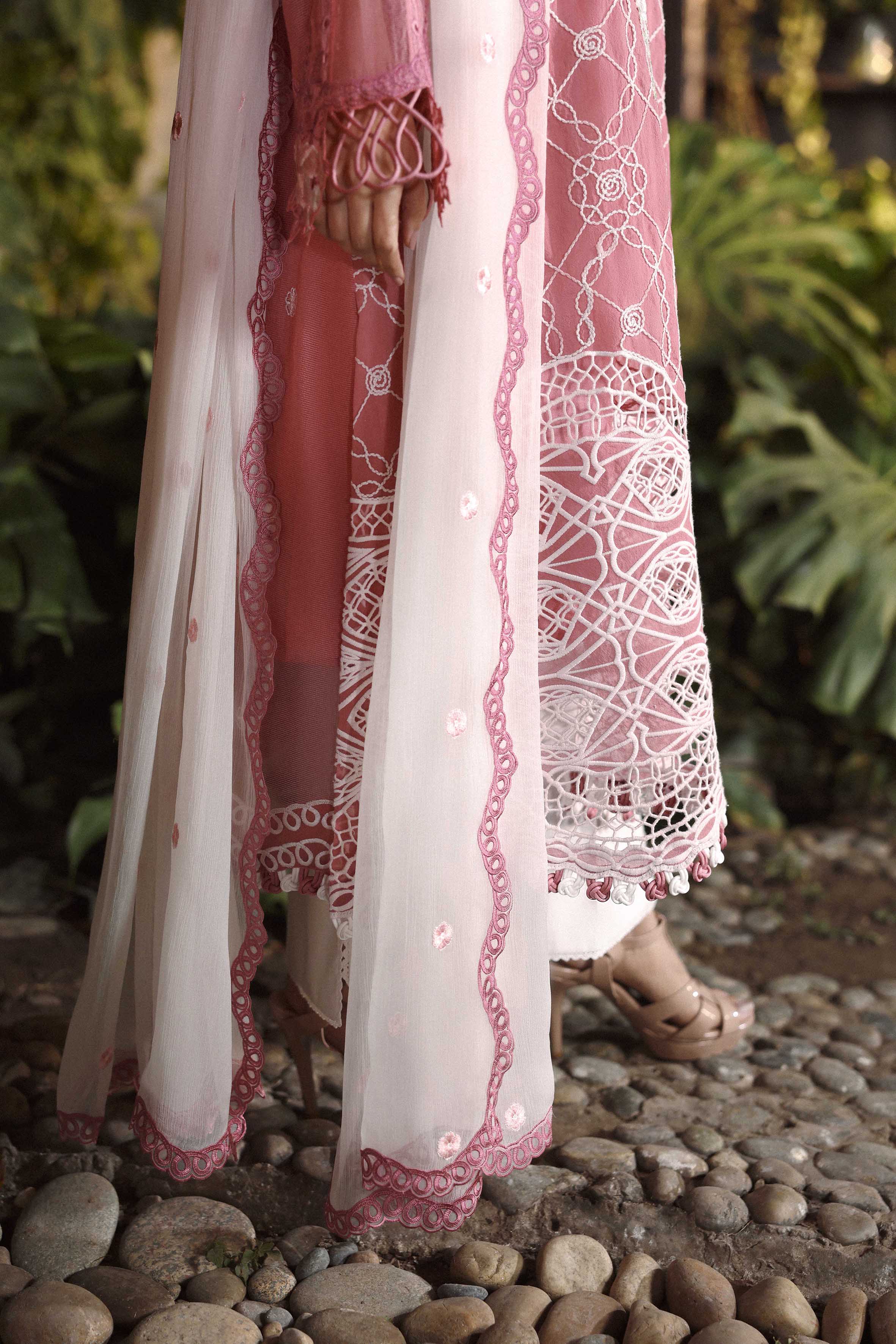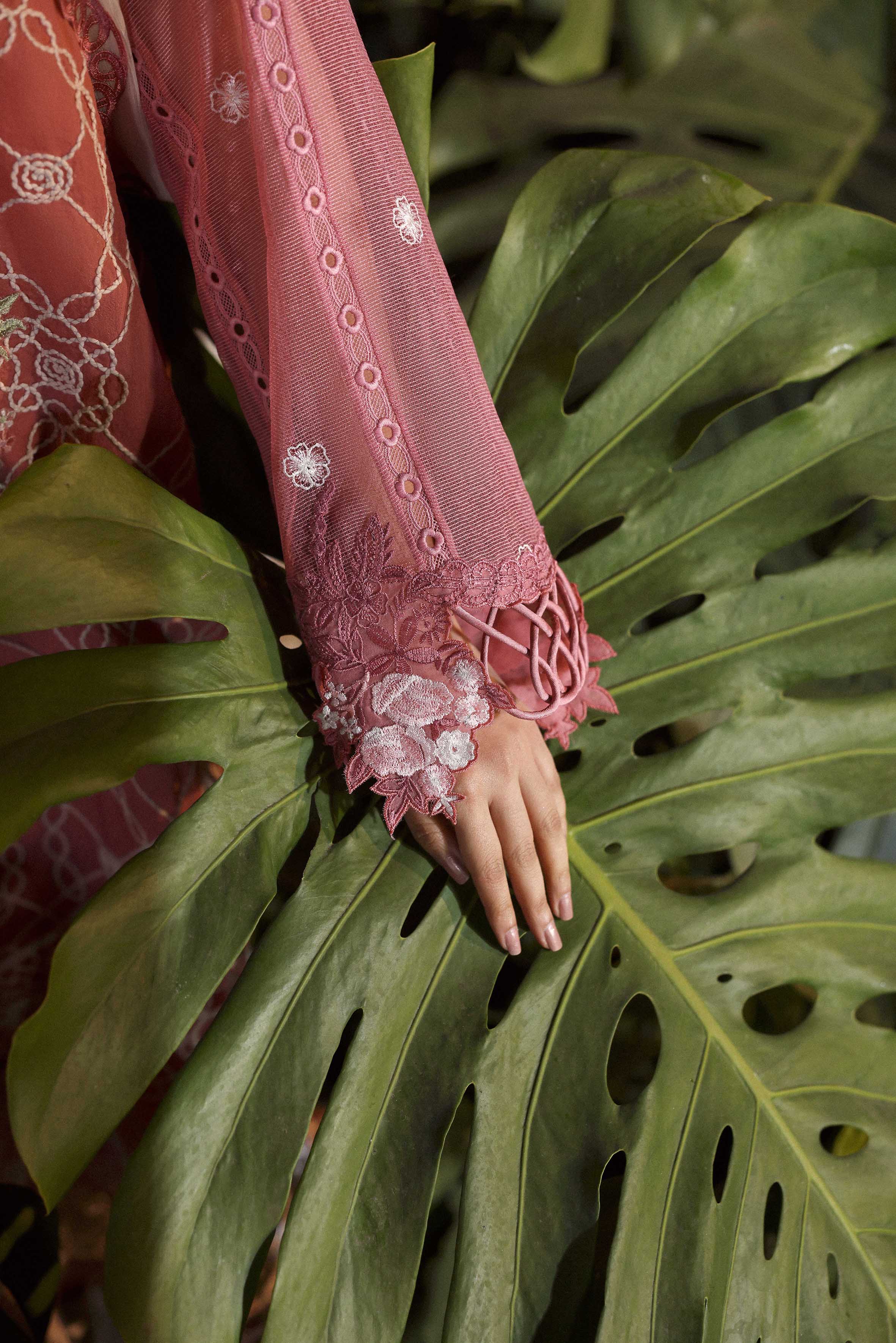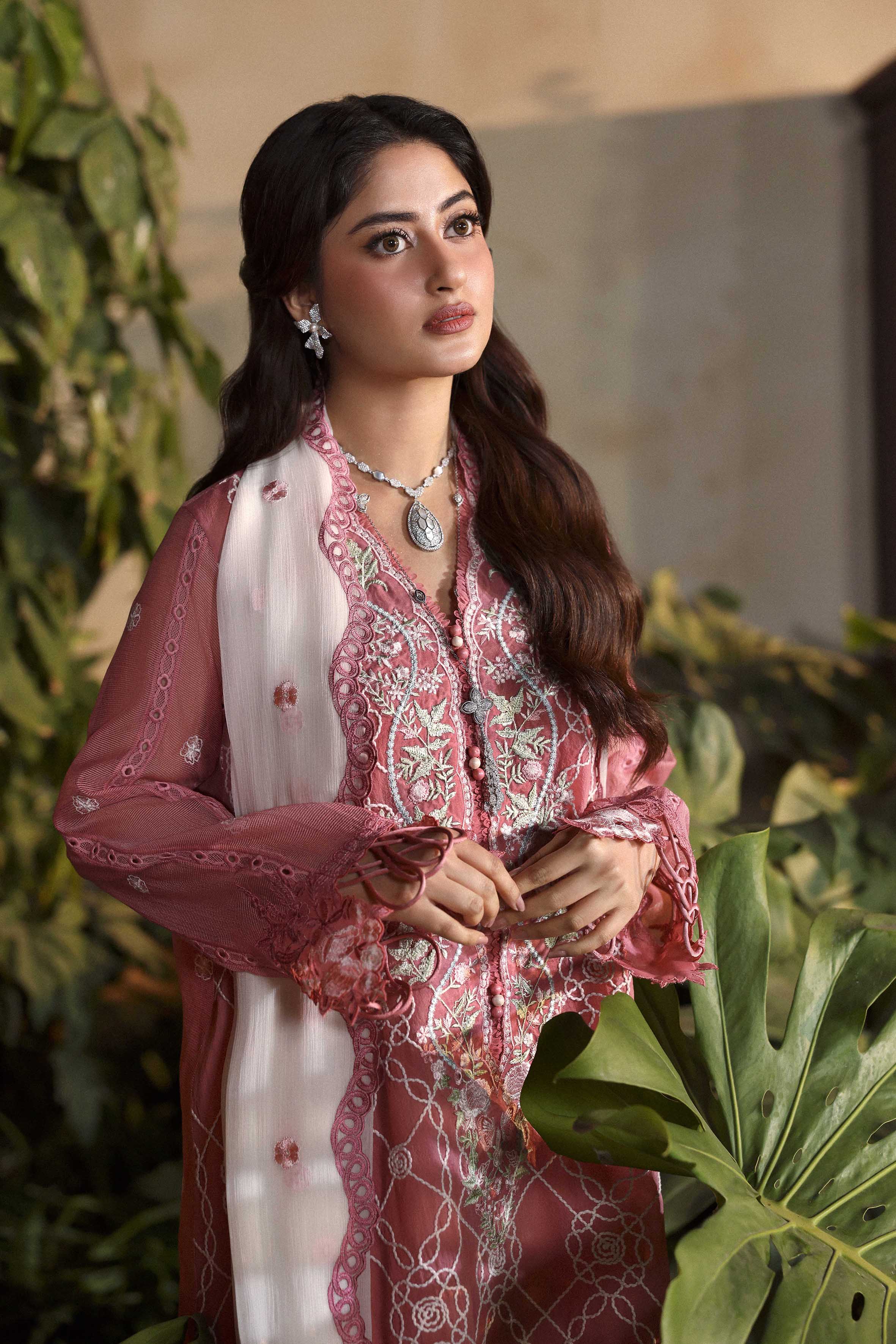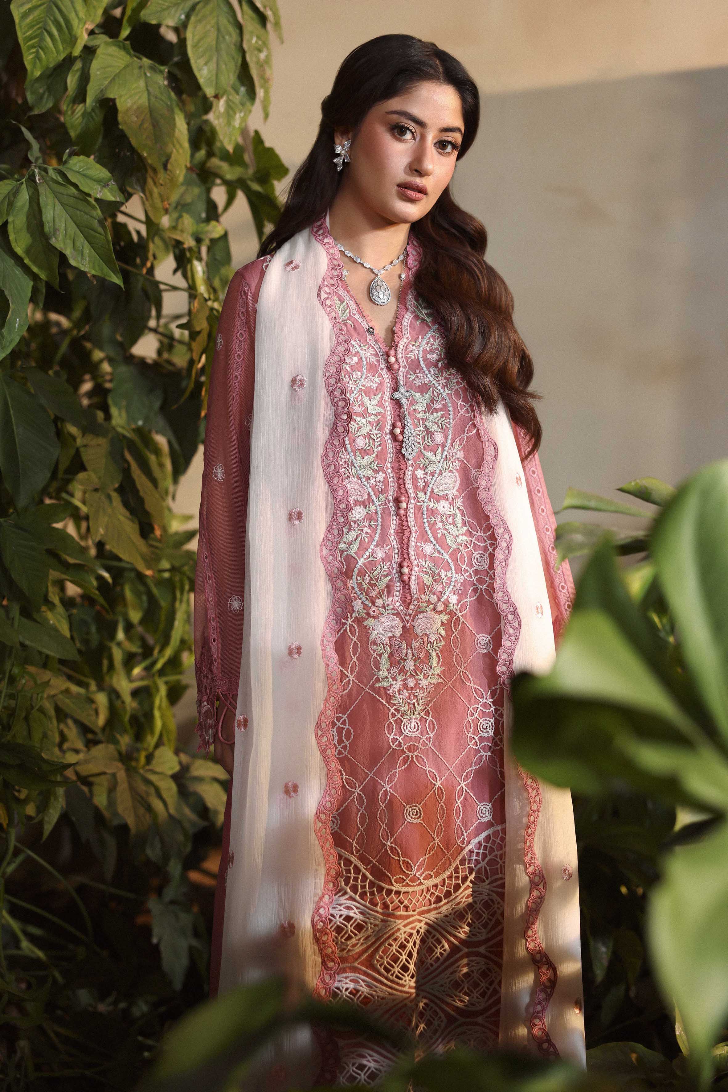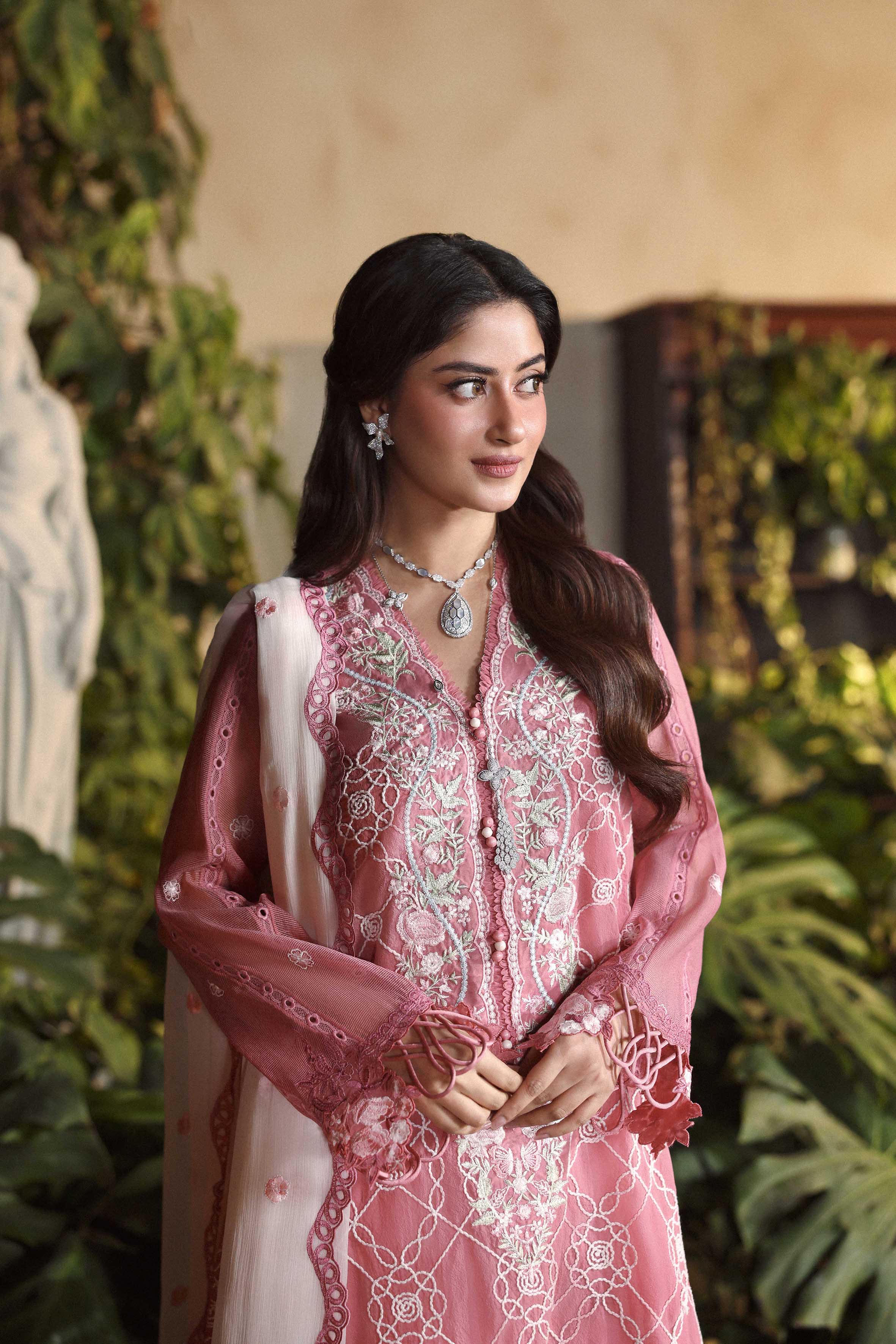Summary: Radiate grace in the Sable Vogue SL-08, a captivating Pink Pakistani Suit worn by Sajal Aly. This Luxury Formal outfit features a Swiss Voile Organza front with intricate Schiffli embroidery, paired with sheer Net sleeves and back. Its dusty pink tone and delicate floral work make it a perfect choice for Spring/Summer weddings and Eid festivities. The set includes a flowy dyed Chiffon dupatta with embroidered borders and classic white cotton trousers. This unstitched dress material offers a customizable fit for ultimate elegance. Ideal for formal parties or daytime events, this ethnic ensemble embodies sophisticated fashion. Shop this authentic designer festive wear online to elevate your style.