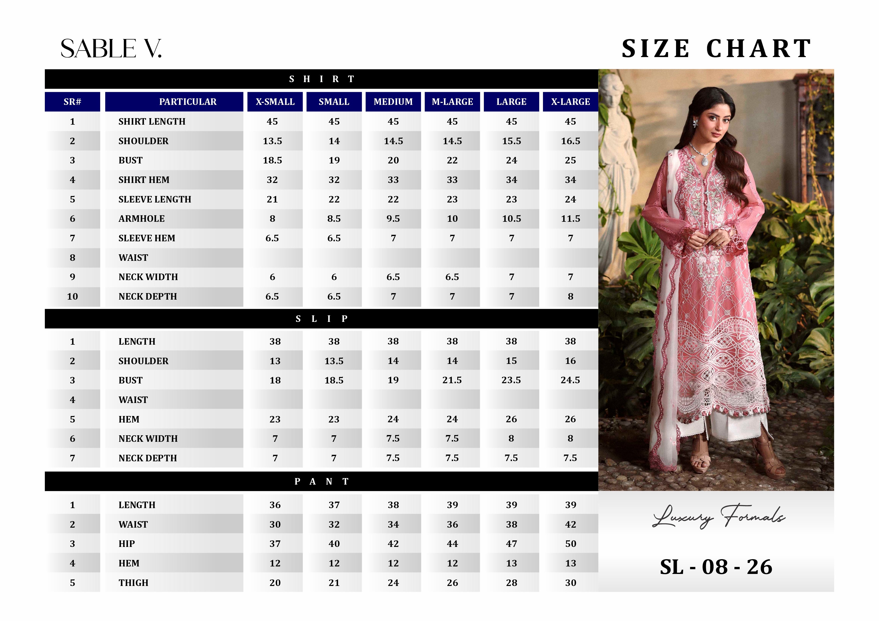 Fabric: Luxury Formals Stitched & Unstitched Collection-26 SL-08-26 1. EMBROIDERED NECKLINE ON ORGANZA 1.5M 01 2. FRONT ON SCHIFFLI, BORING SWISS VOIL ORGANZA WIDTH W-34"" X L-47"" 01 3. EMBROIDERED BACK ON NET FABRIC L-47"" 01 4. BACK EMBROIDERED DAMAN BORDER ON ORGANZA 1Y 01 5. EMBROIDERED SLEEVES ON NET FABRIC L-26""01 6. EMBROIDERED SLEEVES BORDER ON ORGANZA 1M 01 7. WHITE PAK-SILK SLIP 88"" 01 8. EMBROIDERED DUPATTA ON DYED CHIFFON 2.5-M 01 9. EMBROIDERED DUPATTA PALU BORDER ON ORGANZA 2M 01 10. PANT ON WHITE COTTON FABRIC 2.5M 01 Note: Dry Clean Only |
