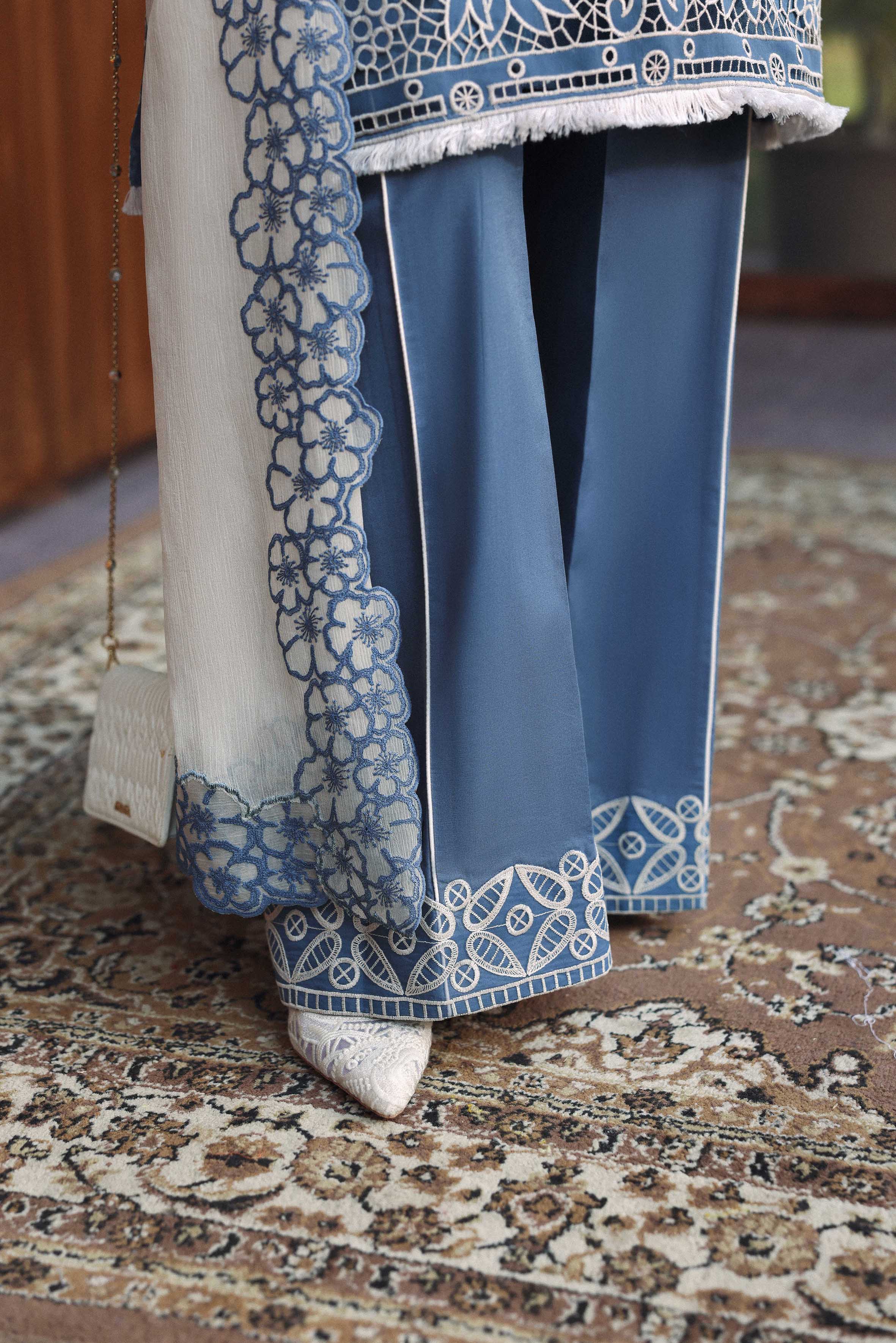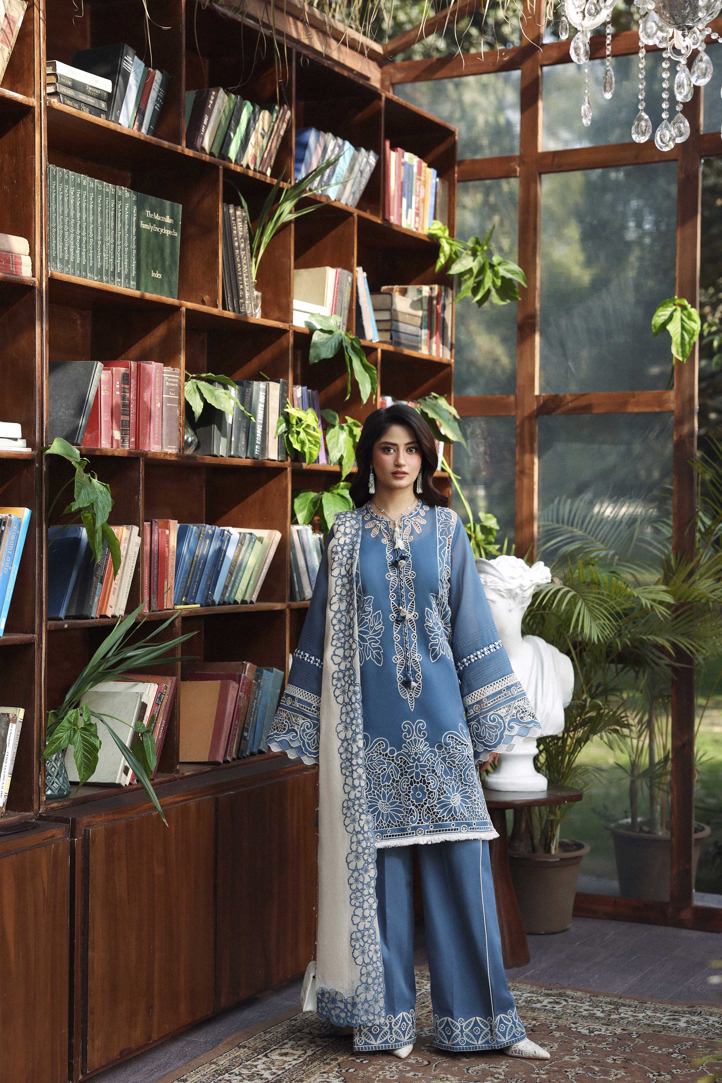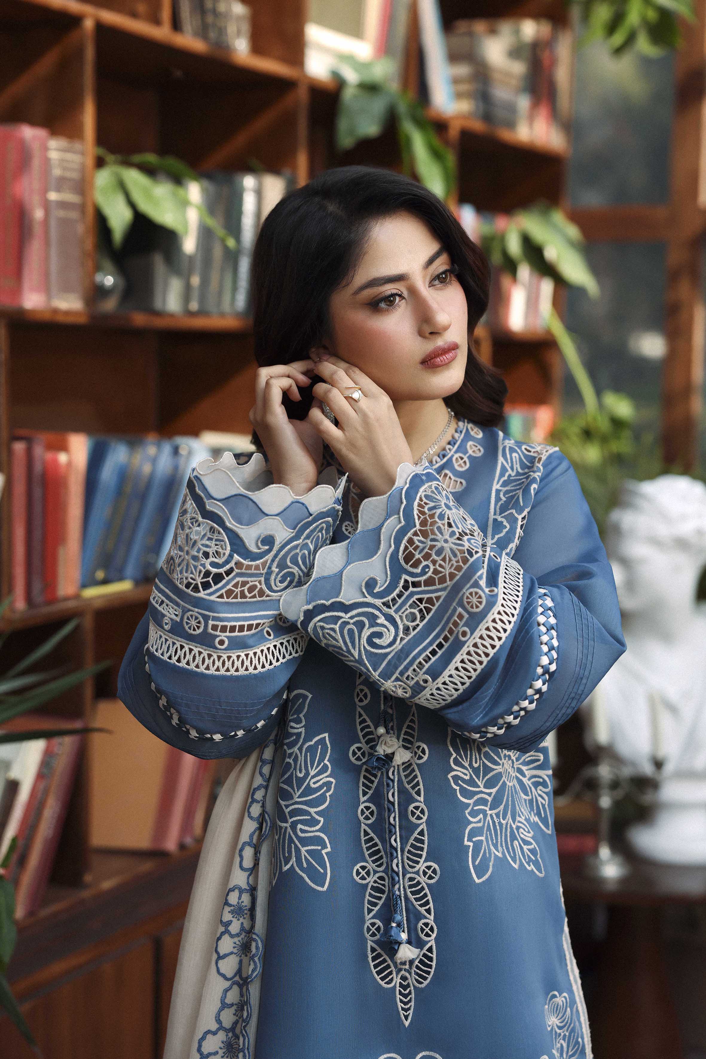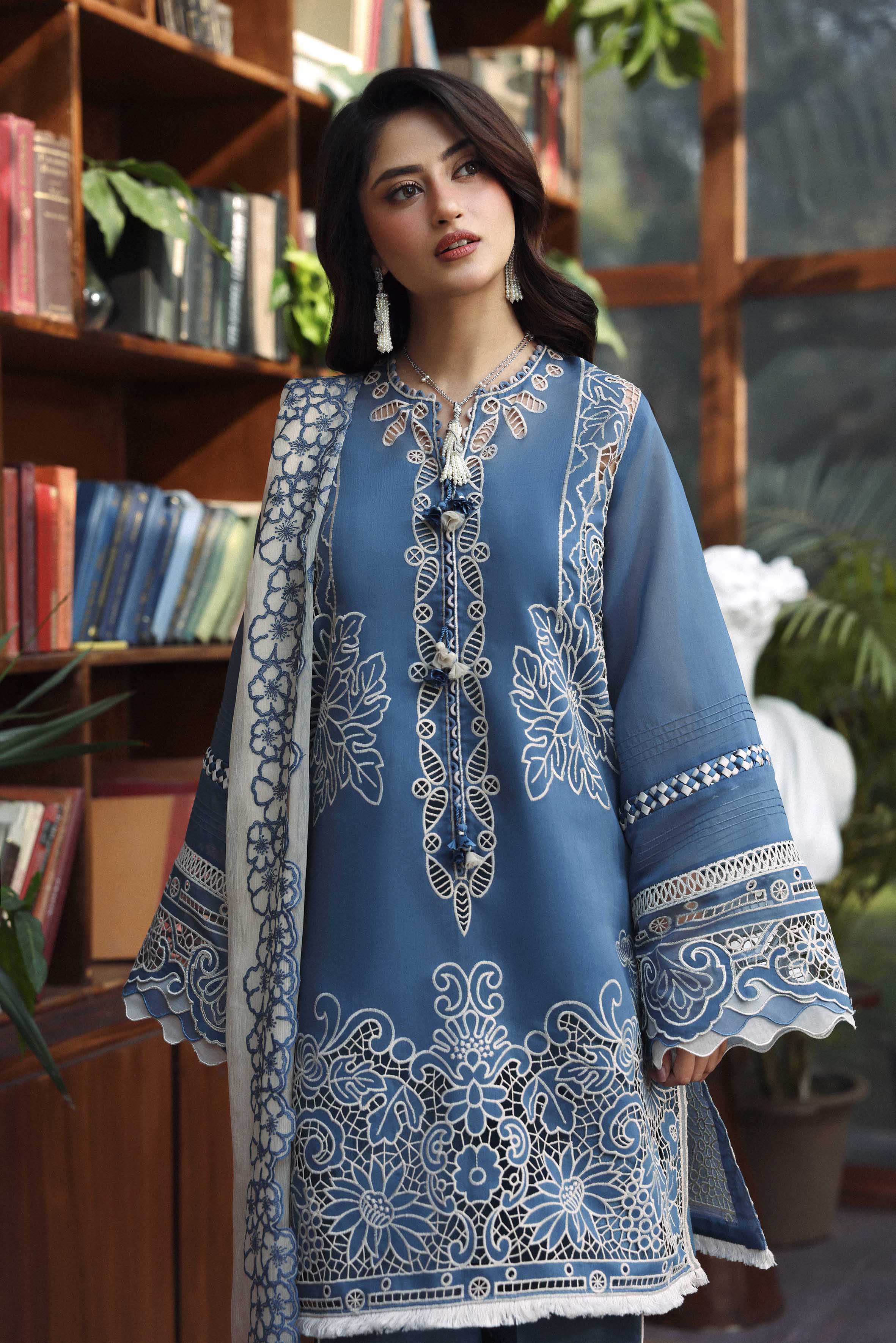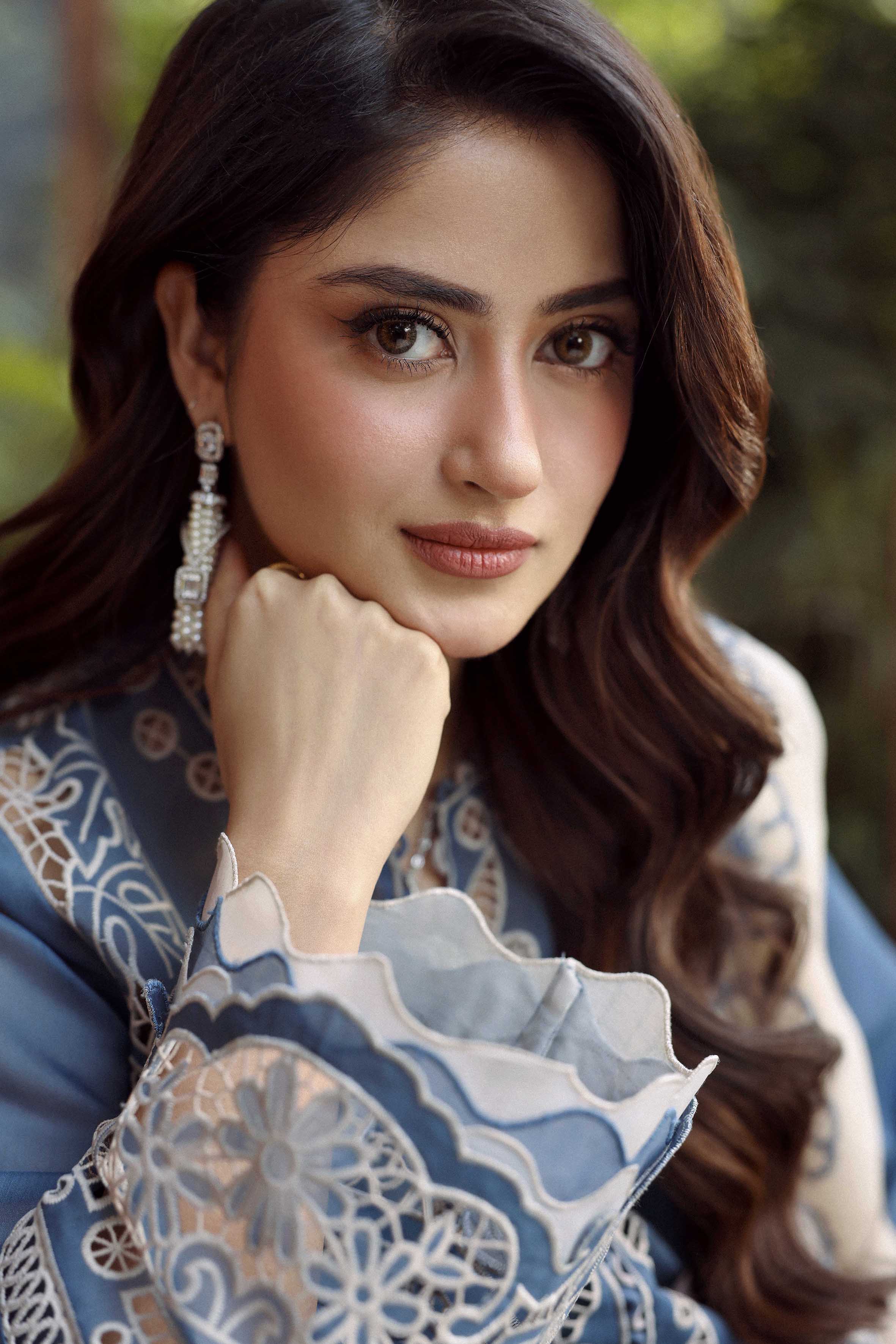 Summary: Embrace timeless elegance with this breathtaking Blue Pakistani Suit modeled by the stunning Sajal Aly. Part of the Sable Vogue Luxury Formals collection, this exquisite ensemble features a shirt crafted from sheer Swiss Voile Organza and Net, highlighted by intricate white Schiffli embroidery and delicate lace borders. The cool blue hue makes it a refreshing choice for Spring/Summer evening events, while the lightweight Chiffon embroidered dupatta adds a touch of grace. Designed for the modern woman, this unstitched dress material is perfect for wedding receptions, formal dinners, or Eid celebrations. Step into luxury with this authentic Pakistani dress that defines sophisticated festive wear. Shop online to own this masterpiece.