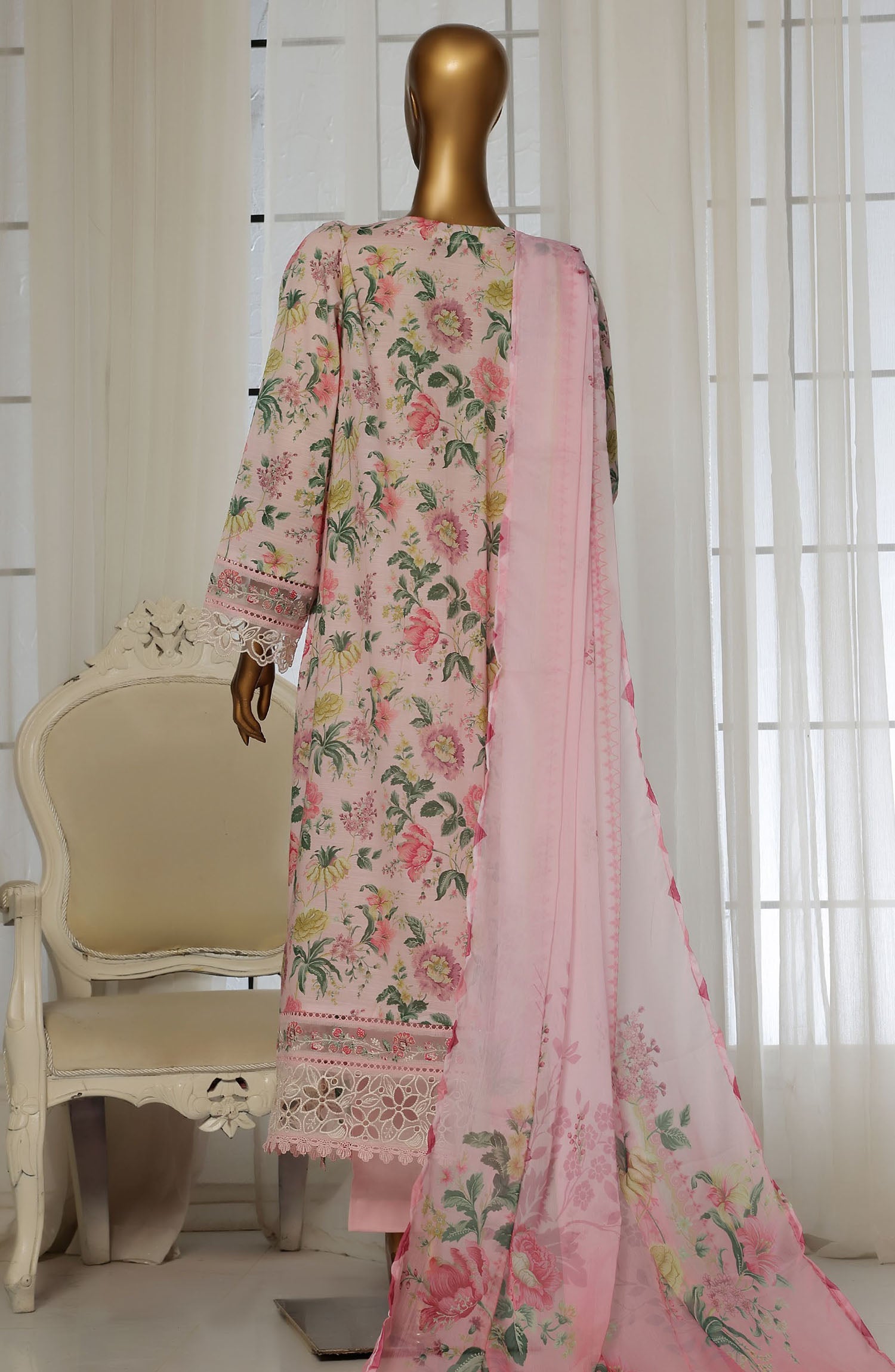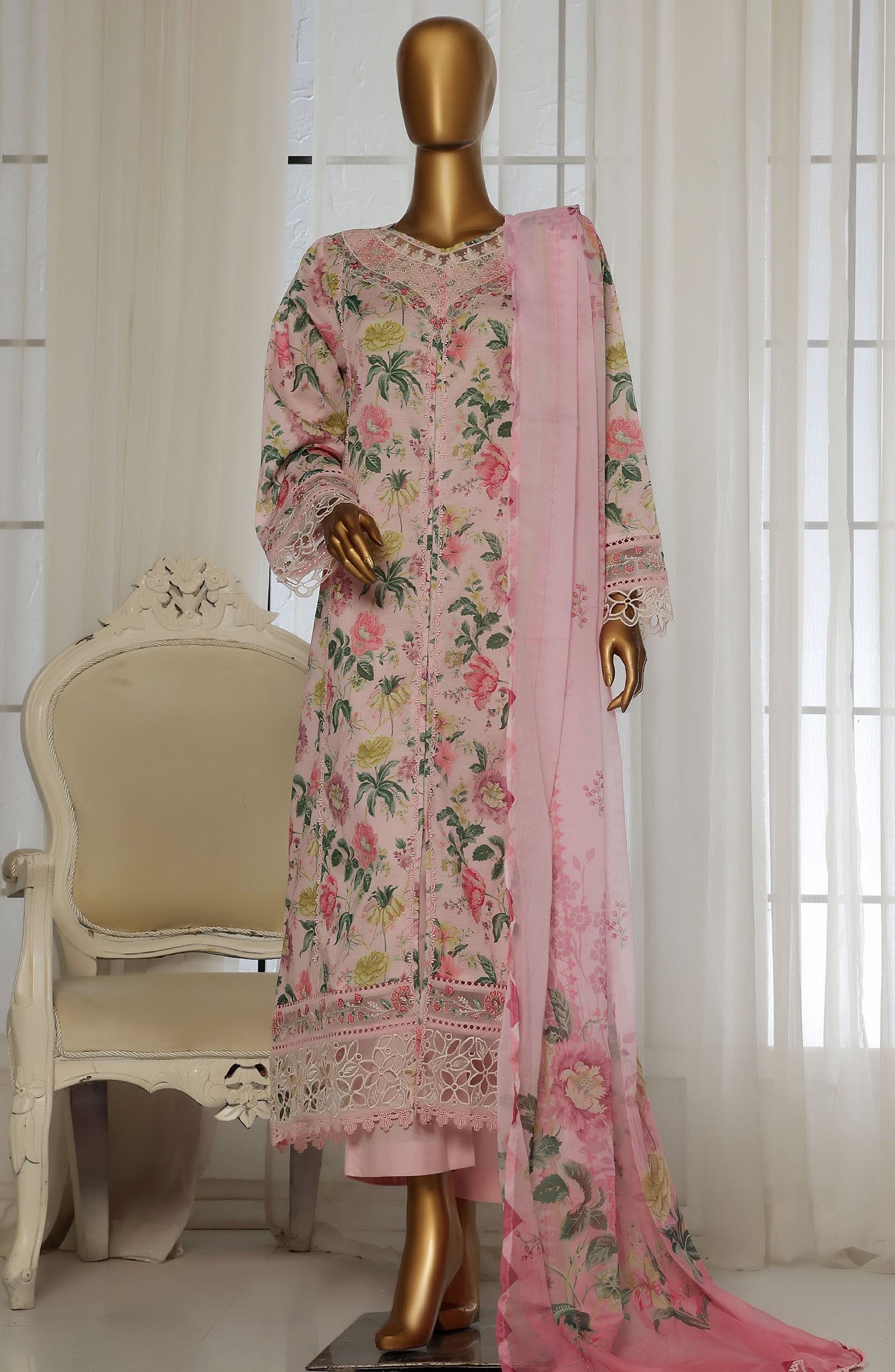 Summary: The Sadabahar D-02 is a stunning three-piece Pakistani suit, perfect for adding a touch of elegance to your festive wardrobe. This ready-to-wear ensemble features a beautifully embroidered pink lawn shirt. The intricate embroidery adds a touch of sophistication, making it ideal for parties and celebrations. The soft, breathable lawn fabric ensures comfort, while the delicate pink hue adds a touch of femininity. The suit includes a stitched shirt, stitched trousers, and a matching dupatta, offering a complete and stylish look. The Sadabahar D-02 is a testament to the brand's commitment to quality and design, making it a must-have for any fashion-conscious woman. The light and airy lawn fabric makes it perfect for the spring/summer season, allowing you to stay cool and comfortable while looking your best. This embroidered lawn suit is not just an outfit; it's a statement of style and grace. Whether you're attending a wedding, a festive gathering, or a special occasion, this suit will make you stand out from the crowd. Invest in this timeless piece and elevate your ethnic wear collection.