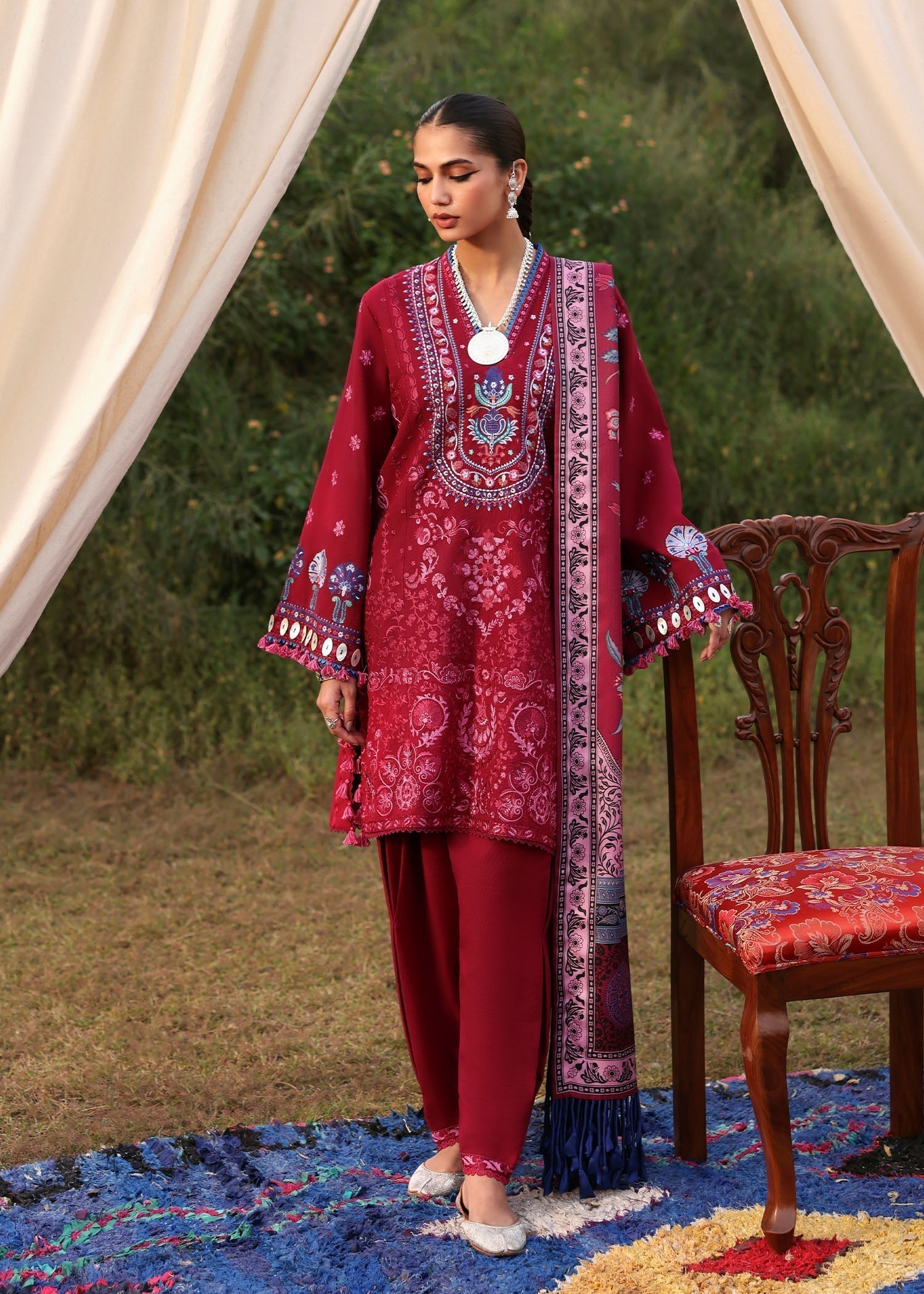 Fabric: Set against a striking cranberry khaddar base, the Turkish-inspired embroidery lends character, colour and dimension. A standout winter look that celebrates detail, heritage, and confident style. Paired with matching trousers and a double sided printed shawl showcasing an exquisite tree or life motif , this statement winter look balances tradition and modern elegance. Details of Fabric: Embroidered Front Centre Panel on Khaddar 1 Pcs Embroidered Front Left Panel on Khaddar 1 Pcs Embroidered Front Right Panel on Khaddar 1 Pcs Embroidered Back on Khaddar 1 Yard Embroidered Sleeve on Khaddar 0.72 Yard Embroidered Daman Border on Silk 2 Yards Embroidered Neck Patti on Organza 1 Yard Double sided printed shawl on Herringbone 2.7 Yards Dyed trouser on Khaddar 2.15 Yards |