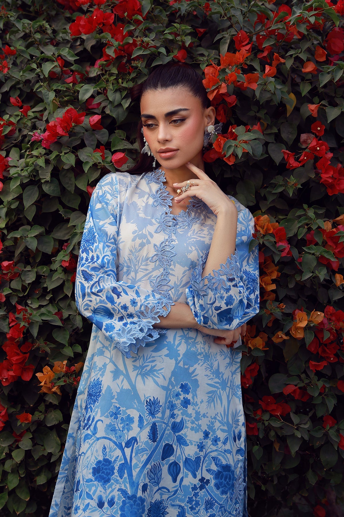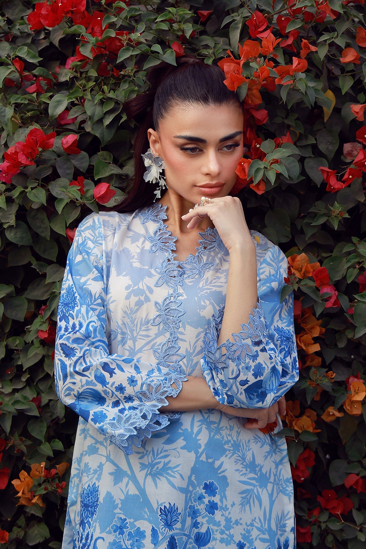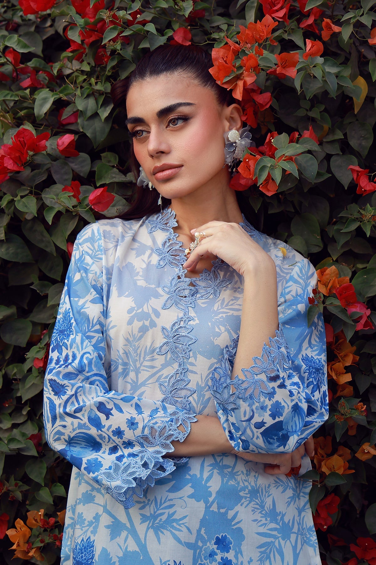Fabric: Powder blue meets porcelain whites in a serene botanical story. Flowing florals and soft contrasts lend this print a breezy, almost ethereal quality. A refreshing palette made for light, elegant dressing. 1-Digital PRINTED SHIRT (CAMBRIC) -3M 2-Digital PRINTED TROUSER (CAMBRIC) -2.50M |