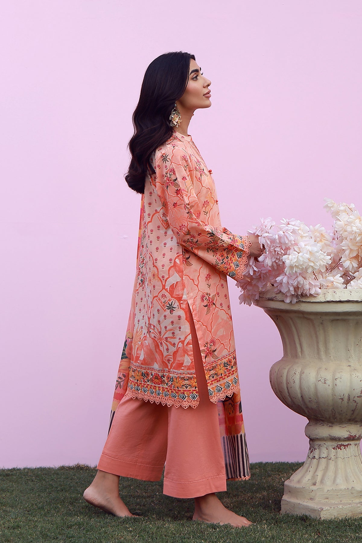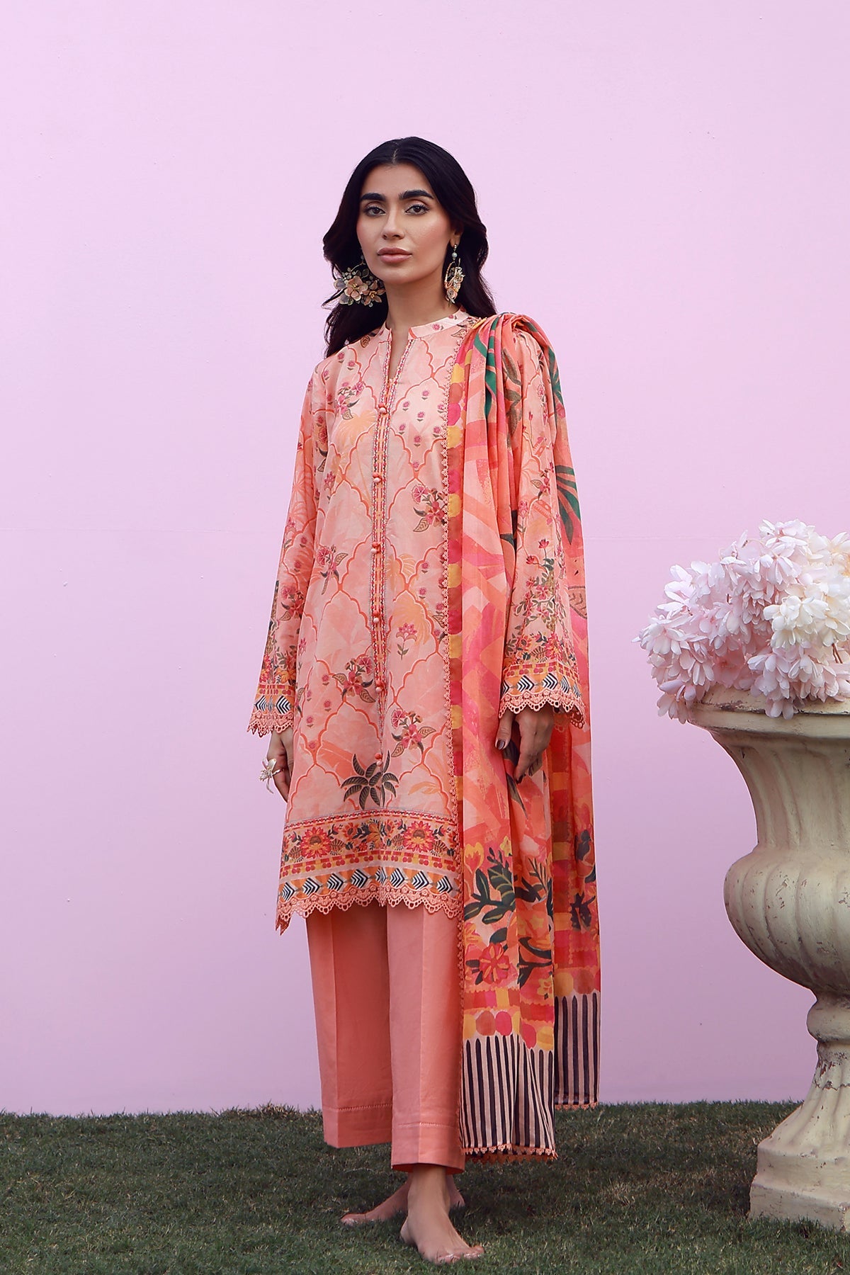 Fabric: Warm coral and peach hues layered with oversized tropical florals for a sun-kissed feel. The flowing dupatta echoes the print’s vibrancy, paired with subtle pants for balance. Joyful, expressive, and summer-ready. 1-Digital Printed SHIRT (LAWN) -3M 2-Digital Printed DUPATTA (LAWN) -2.5M 3-DYED TROUSER (CAMBRIC) -2.5M |