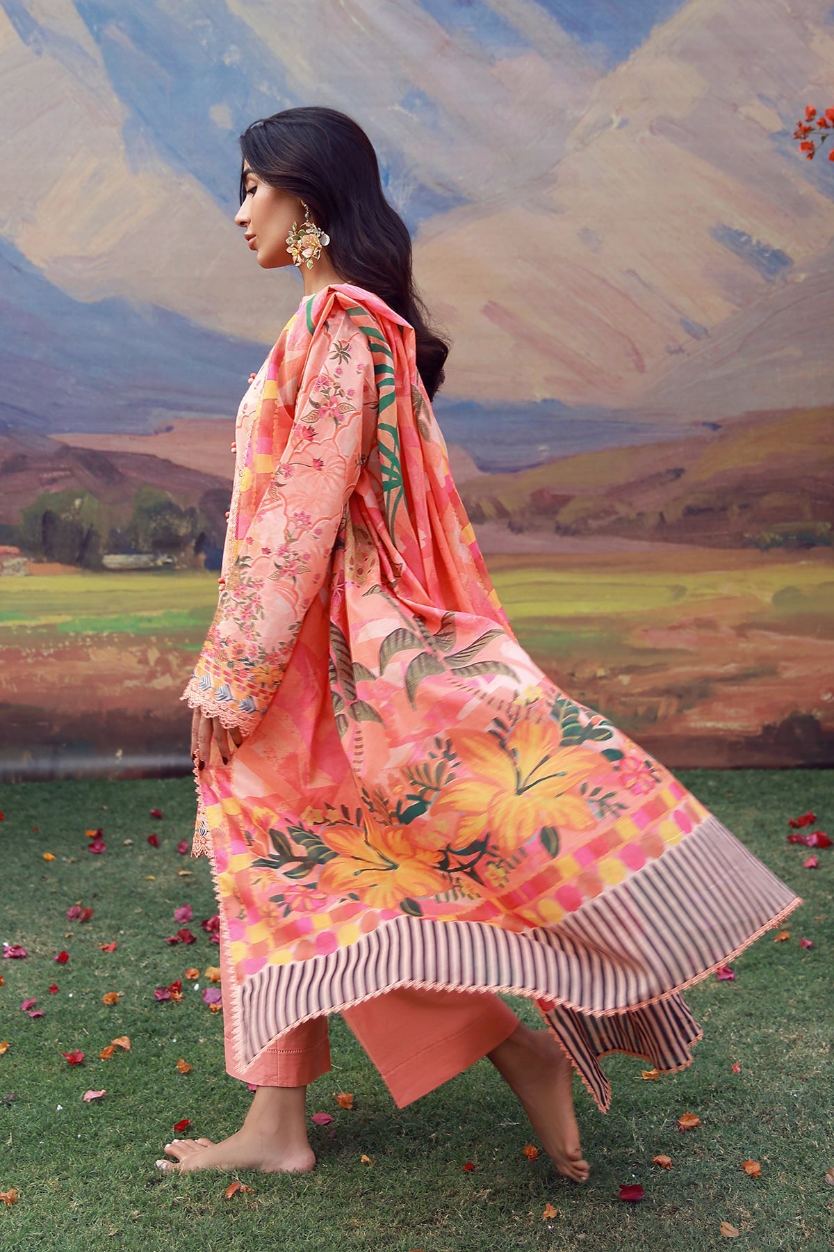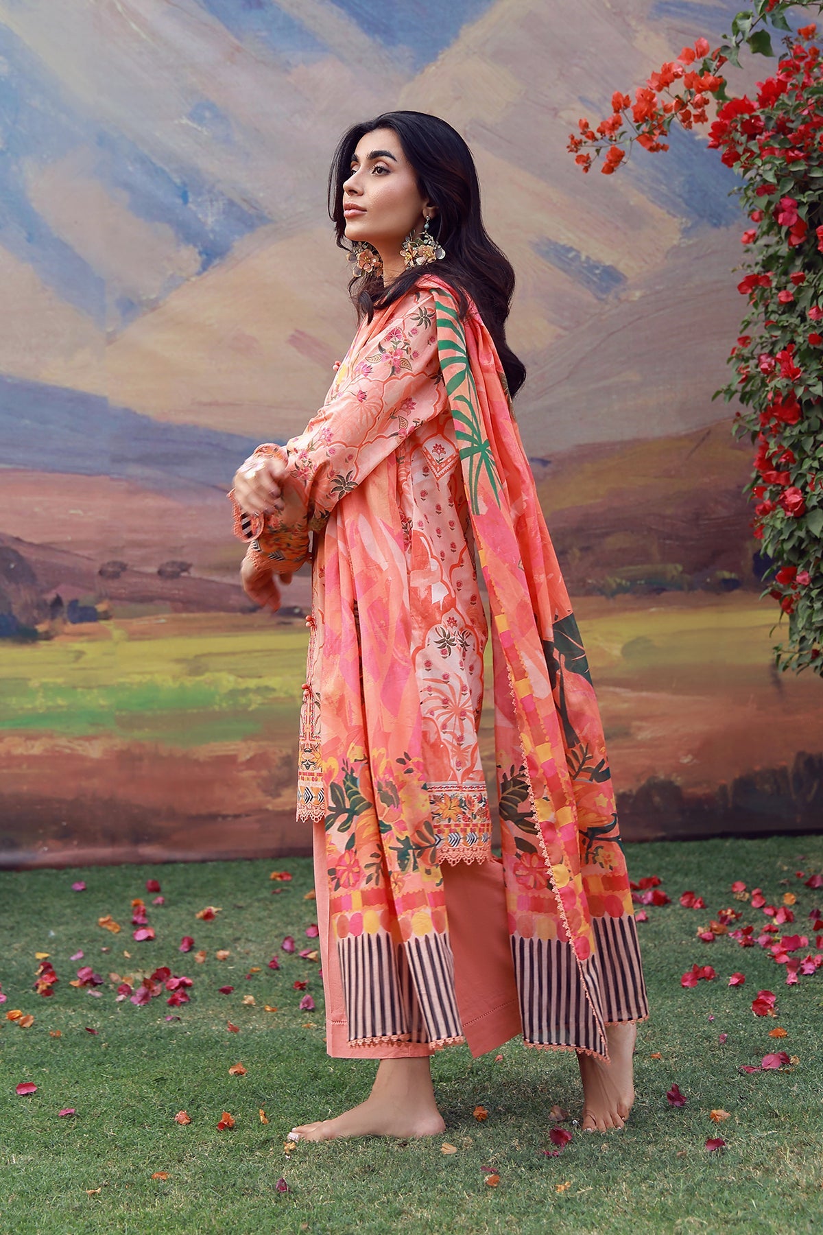 Summary: Embrace the vibrant spirit of summer with the Sahar Mirha 'Peachy Cascade' Pakistani Lawn Suit. The main kameez features a stunning digital print in warm coral and peach hues, layered with oversized tropical florals that create a joyful, sun-kissed aesthetic. Crafted from soft, breathable lawn fabric, this unstitched dress is essential for the Spring/Summer season, offering both comfort and style. As a versatile Pakistani dress, it is perfect for daily wear or casual daytime gatherings. The ensemble is completed with a matching lawn dupatta, making it a complete ethnic outfit. Shop this elegant floral lawn suit online to elevate your seasonal wardrobe with authentic flair.