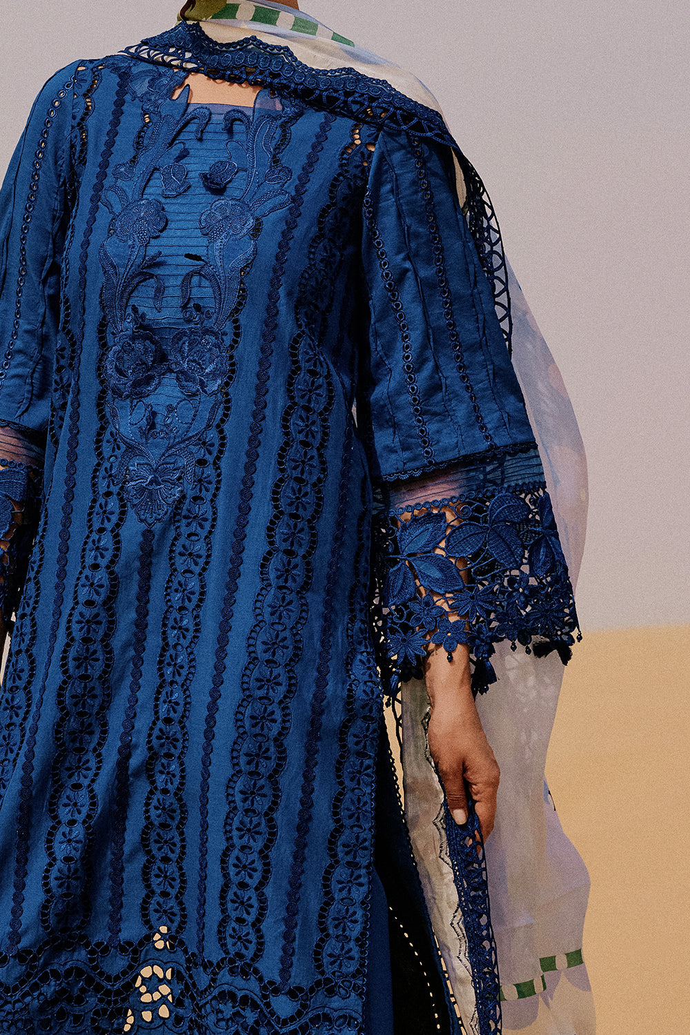 Summary: Embrace the elegance of this stunning Sapphire Blue Pakistani Suit, meticulously crafted for the upcoming festive season. The main kameez features intricate Schiffli machine embroidery on premium, breathable lawn fabric, making it the perfect choice for warm Spring/Summer days. The rich blue tone exudes sophistication, complemented by elaborate cutwork detailing and delicate organza borders along the hem and wide sleeves. Paired beautifully with a digital printed silk dupatta, this exquisite Pakistani lawn dress seamlessly blends traditional craftsmanship with modern festive wear styling. An ideal ethnic wear ensemble for Eid celebrations, summer evening parties, or elegant daytime gatherings.