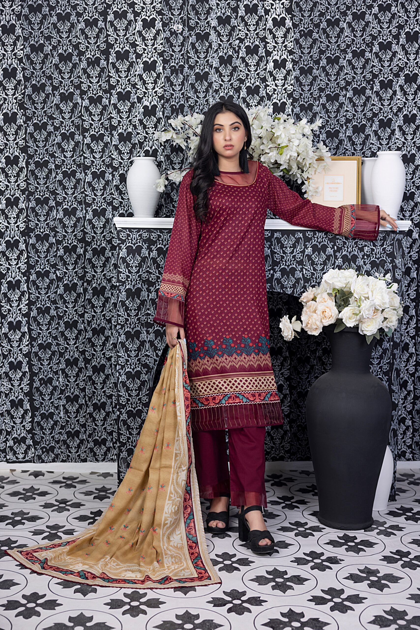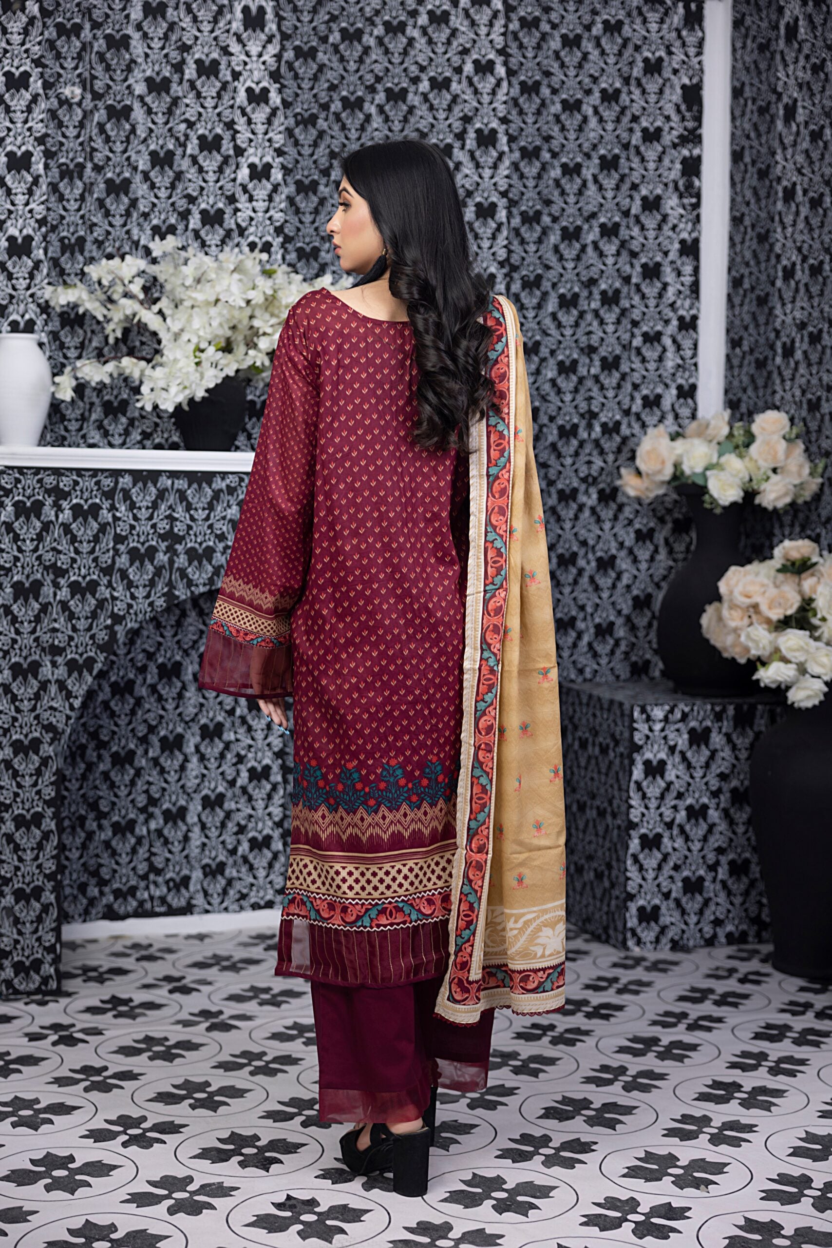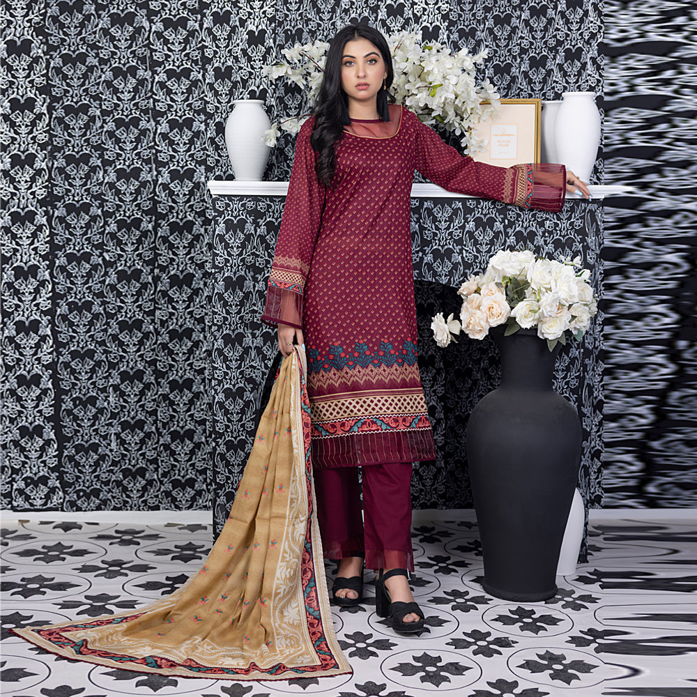 Summary: Introducing the Salina Digital Printed Lawn Vol-3 – SPL3-13 by Regalia Textiles, a stunning ensemble perfect for adding a touch of elegance to your everyday wardrobe. This unstitched three-piece suit offers endless styling possibilities. The main attraction is the maroon printed lawn shirt, showcasing a rich and captivating hue. The intricate digital print adds a modern twist to the traditional silhouette. The lightweight and breathable lawn fabric ensures comfort throughout the day, making it ideal for the spring/summer season. This versatile suit can be tailored to your personal style and preference, allowing you to create a look that is uniquely yours. The accompanying lawn dupatta and dyed trouser complement the shirt beautifully, completing the ensemble with grace and sophistication. Whether you're heading to a casual gathering or simply running errands, the Salina Digital Printed Lawn Suit is a must-have for any fashion-conscious woman. This Pakistani Lawn Suit is a testament to Regalia Textiles' commitment to quality and design. Invest in this timeless piece and elevate your ethnic wear collection. This Salina Maroon Printed Lawn Pakistani Dress is a perfect addition to your wardrobe!