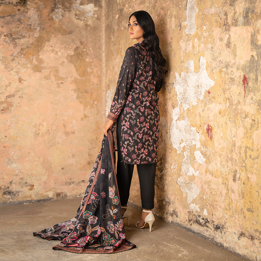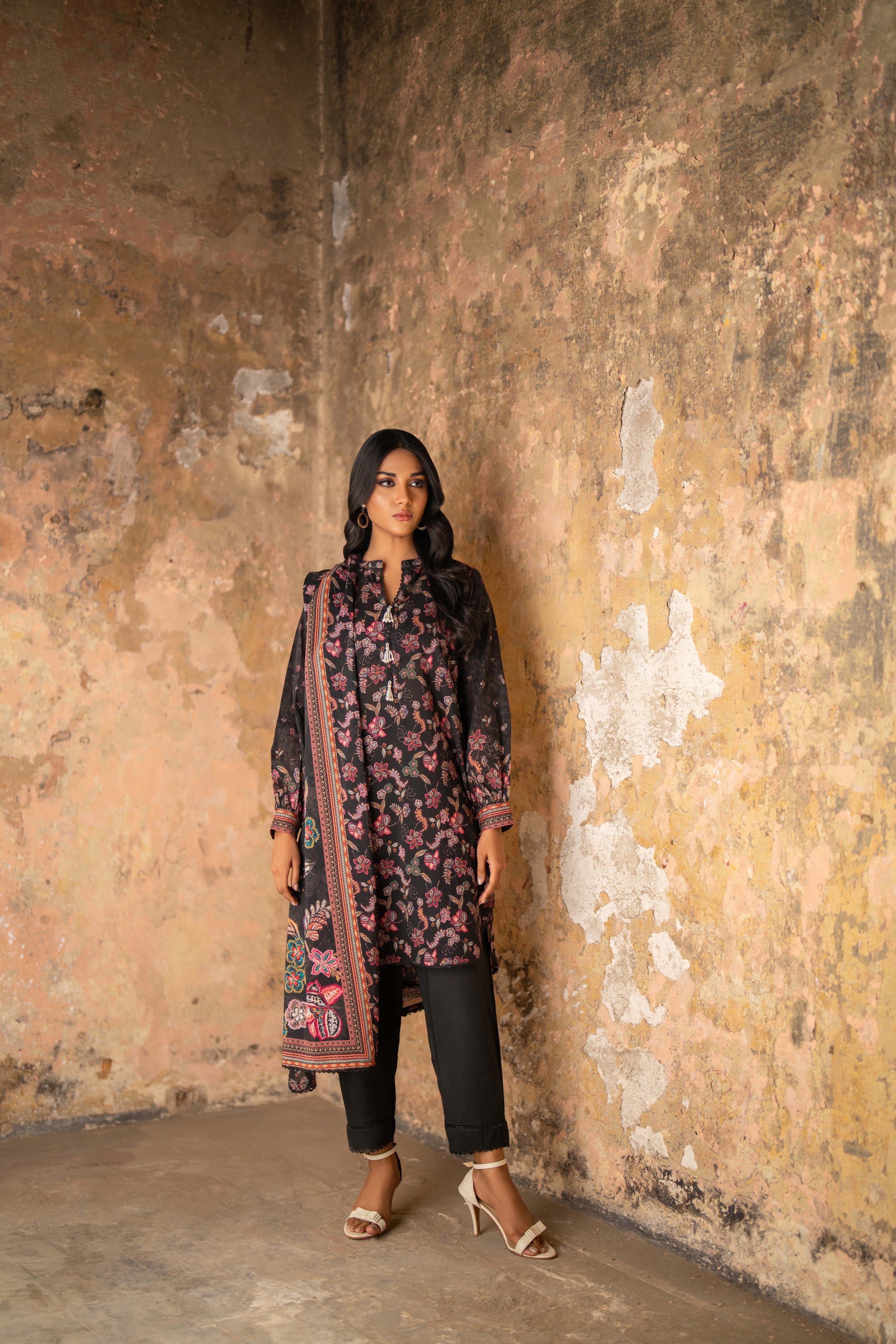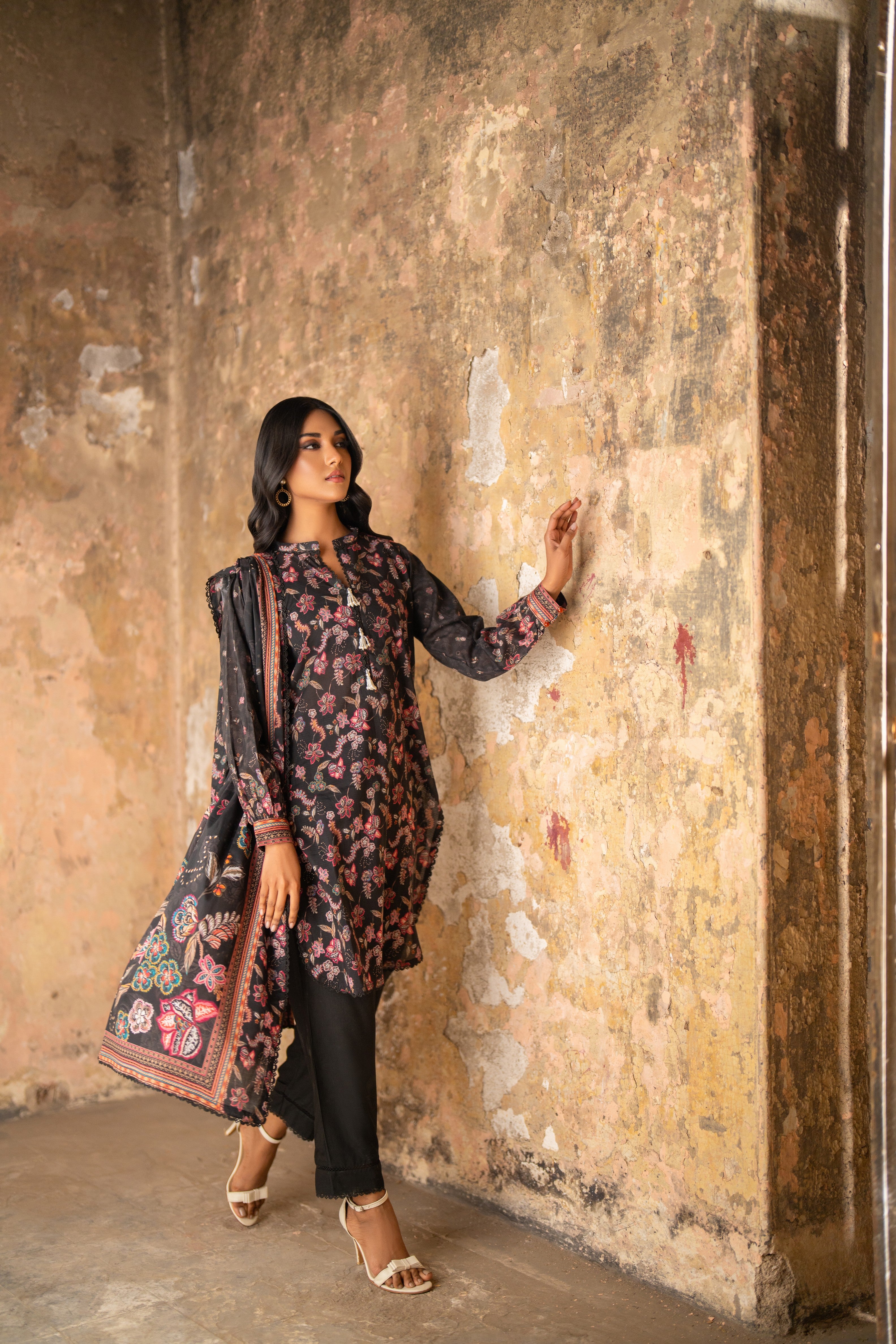 Summary: The Salina Doriya Lawn Vol-2 SDV2-1 by Regalia Textiles offers a sophisticated take on daily wear. This unstitched three-piece Pakistani suit showcases a black printed lawn kameez, providing a canvas for the intricate floral patterns. Crafted from high-quality lawn cotton, the top promises breathability and comfort, making it ideal for warmer weather. The accompanying dyed cotton bottom complements the kameez, offering a sleek and versatile look. The ensemble is completed with a printed lawn cotton dupatta, mirroring the delicate floral motifs of the kameez and adding a touch of elegance to the overall look. The Salina Doriya collection is known for its unique blend of traditional aesthetics and contemporary design, making it a perfect choice for women who appreciate timeless style. This suit offers the flexibility of customization, allowing you to tailor it to your individual preferences. Ideal for daily wear, this Pakistani lawn suit provides a comfortable and stylish option for a variety of occasions. Create a chic and effortless look by pairing this suit with your favorite accessories and sandals. This design truly embodies the essence of understated elegance, ensuring you look and feel your best throughout the day.