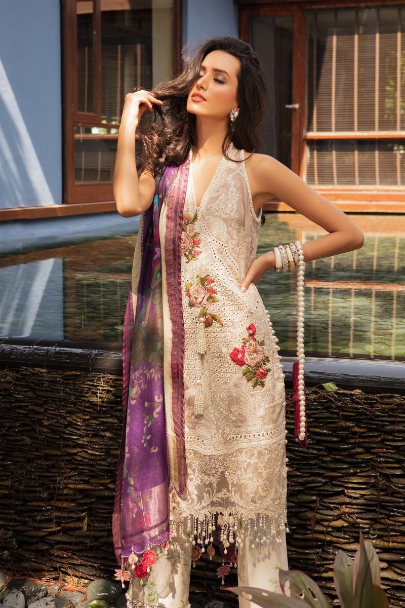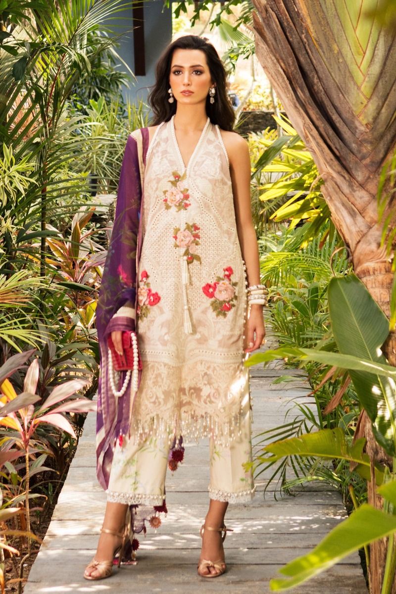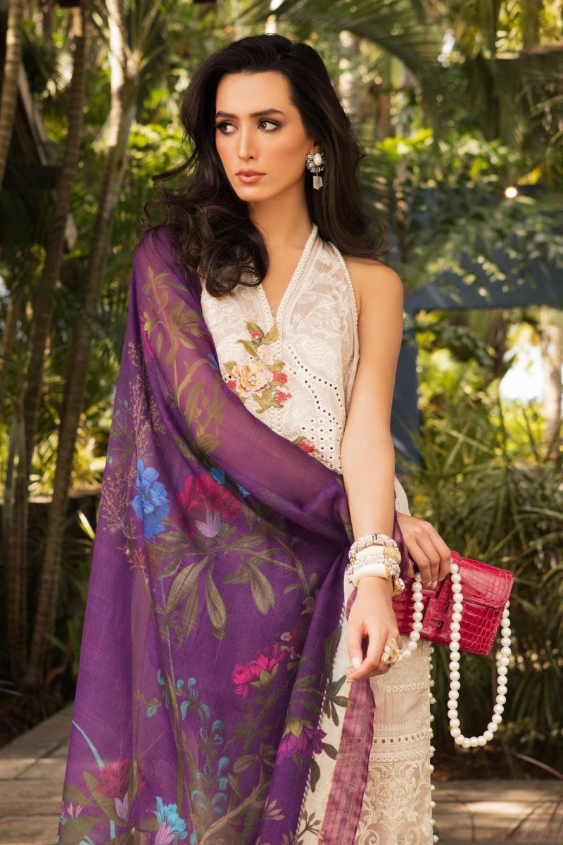 Fabric: A contemporary crepe pink lawn shirt with a cream Schiffli embroidered front with white paste printed sleeves and back. Paired with cream paste printed pants and a digitally printed violet gauze tulle dupatta. Shifli Lawn Shirt Front - 1.25 meters Paste Printed Lawn Back - 1.25 meters Paste Printed Lawn Sleeves - 0.65 meter Digital Printed Khaddi Dupatta - 2.5 meters Embroidered Bunches On Organza For Shirt - 4 Pieces Printed Cotton Trouser - 2.5 meters |
