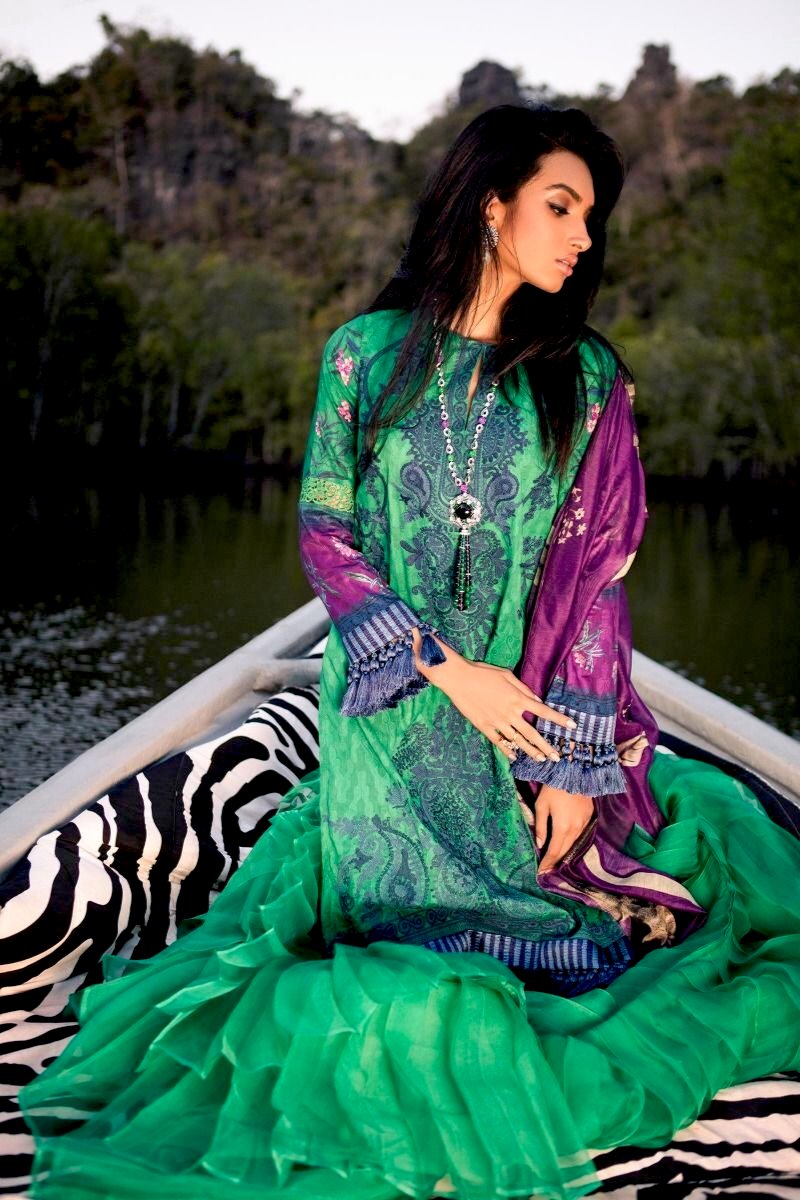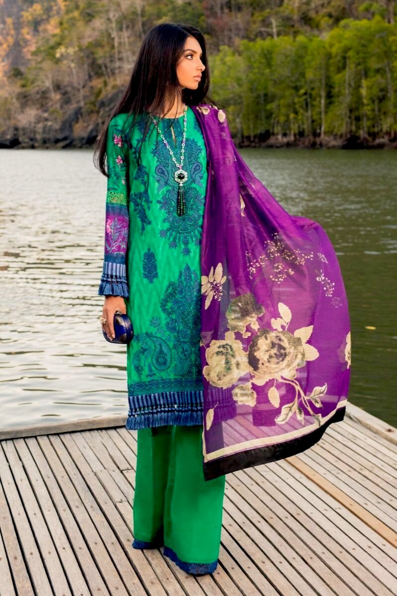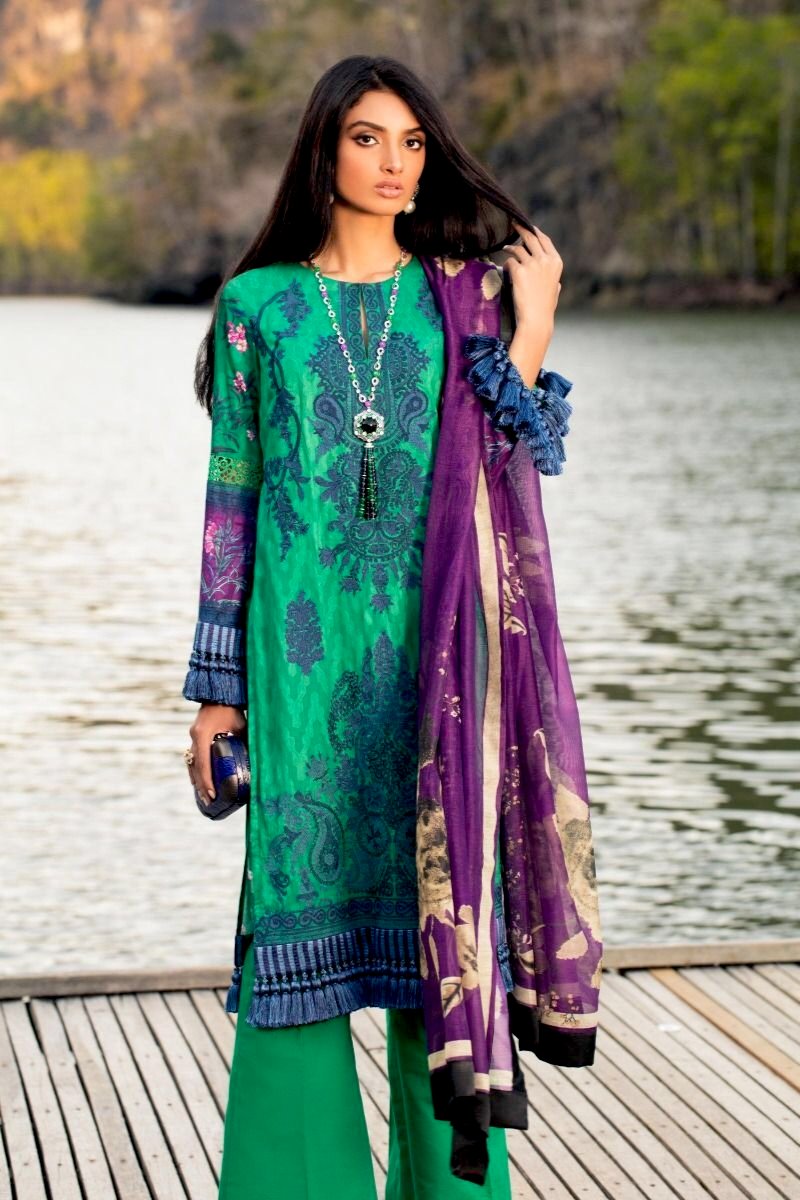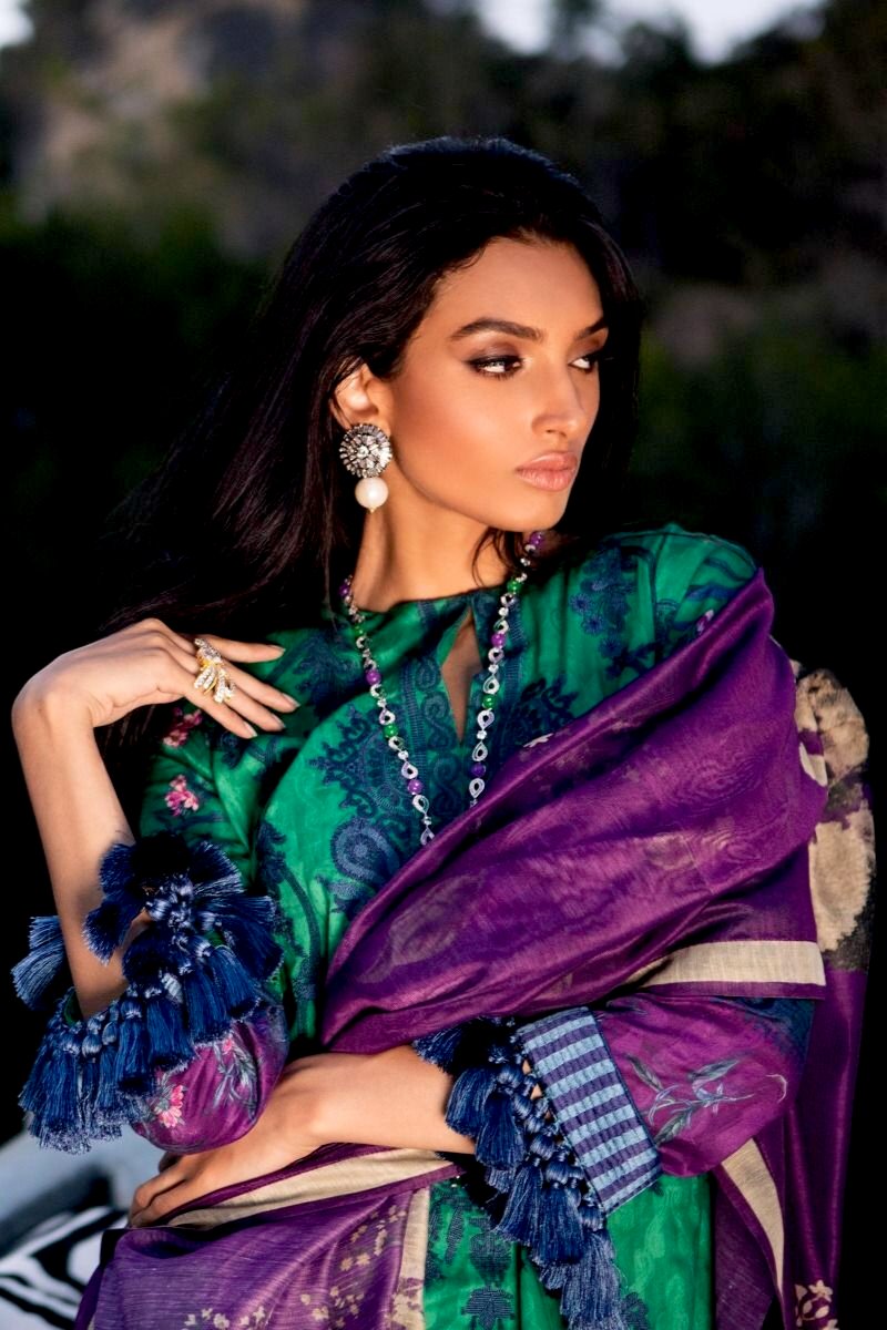 Fabric: A teal green dobby shirt base featuring traditional Banarsi Tanka inspired embroidery in blue with digitally printed sleeves and back. Paired with teal green dyed cotton pants and a digitally printed, floral, violet and beige gauze tulle dupatta. Embroidered Dobby Shirt Front - 1.25 meters Digital Printed Dobby Back - 1.25 meters Digital Printed Dobby Sleeves - 0.65 meter Digital Printed Khaddi Dupatta - 2.5 meters Dyed Cotton Trouser - 2.5 meters |