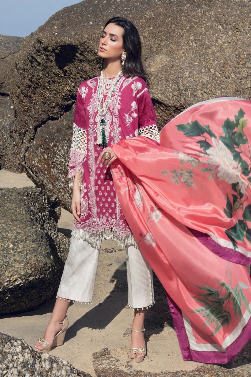 Fabric: A Mughal inspired embroidered magenta and cream lawn shirt with printed sleeves. Paired with dyed cream paste printed cotton pants and a digitally printed tea pink and multicolored silk dupatta. Embroidered Lawn Shirt Front - 1.25 meters Printed Lawn Back - 1.25 meters Printed Lawn Sleeves - 0.65 meter Cutwork Border For Sleeves - 1 meter Digital Printed Silk Dupatta - 2.5 meters Dyed Cotton Trouser - 2.5 meters |