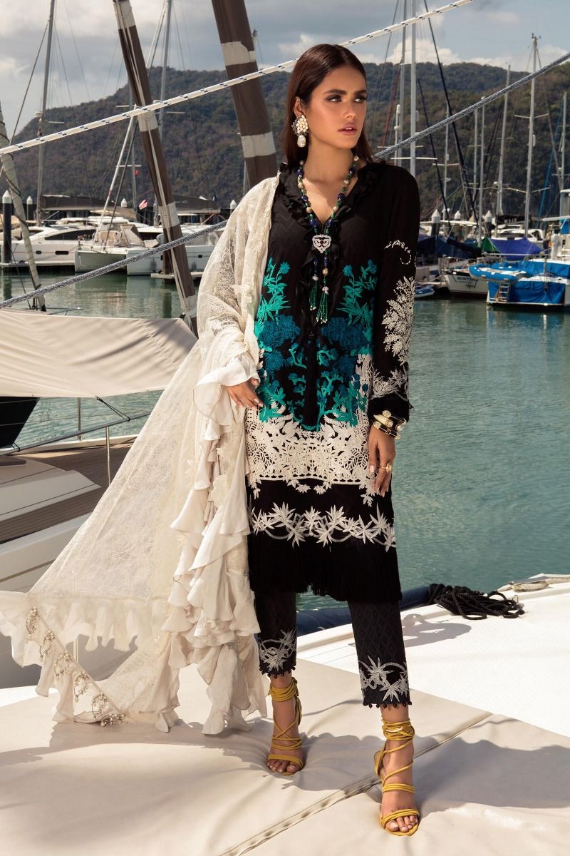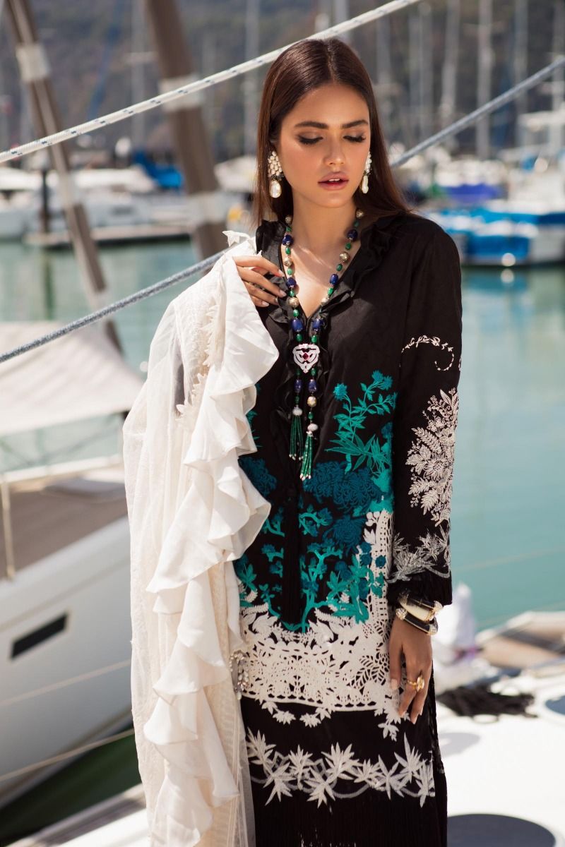 Fabric: A black dobby shirt with cream cut-work and peacock embroidery and paste printed sleeves and back in lace and floral motifs. Paired with a cream on cream embroidered tulle dupatta and black paste printed pants. Embroidered Cutwork Dobby Front - 1.25 meters Printed Dobby Back - 1.25 meters Printed Dobby Sleeves - 0.65 meter Embroidered Tulle Net Dupatta - 2.5 meters Printed Trouser - 2.5 meters |