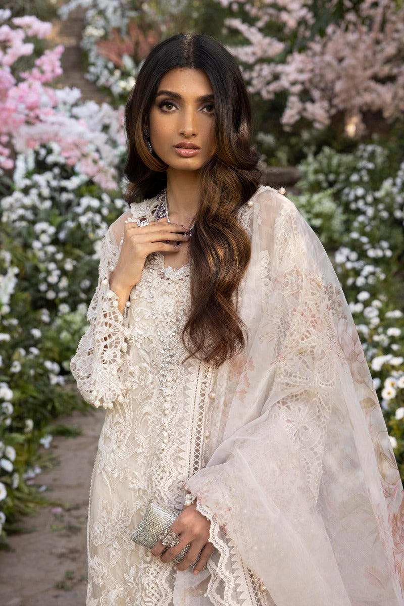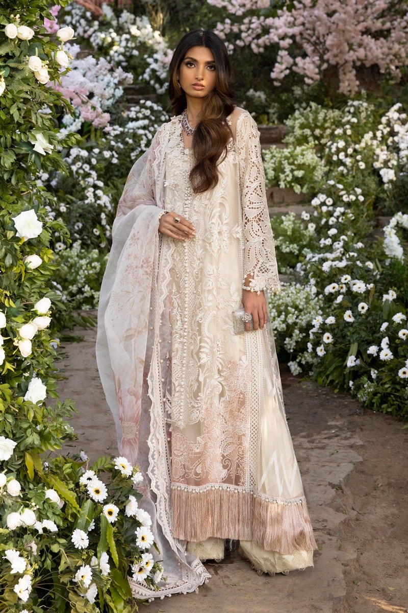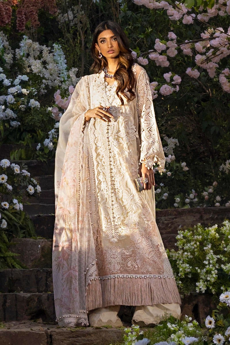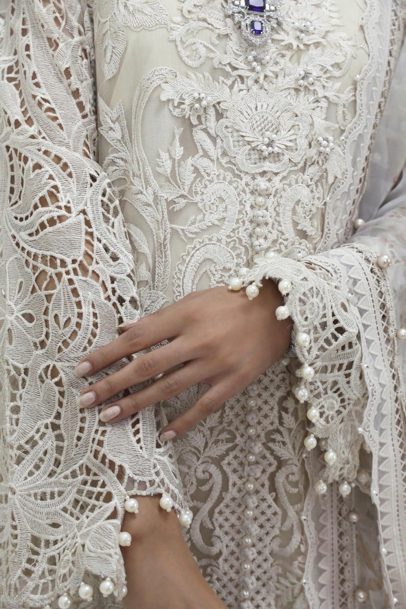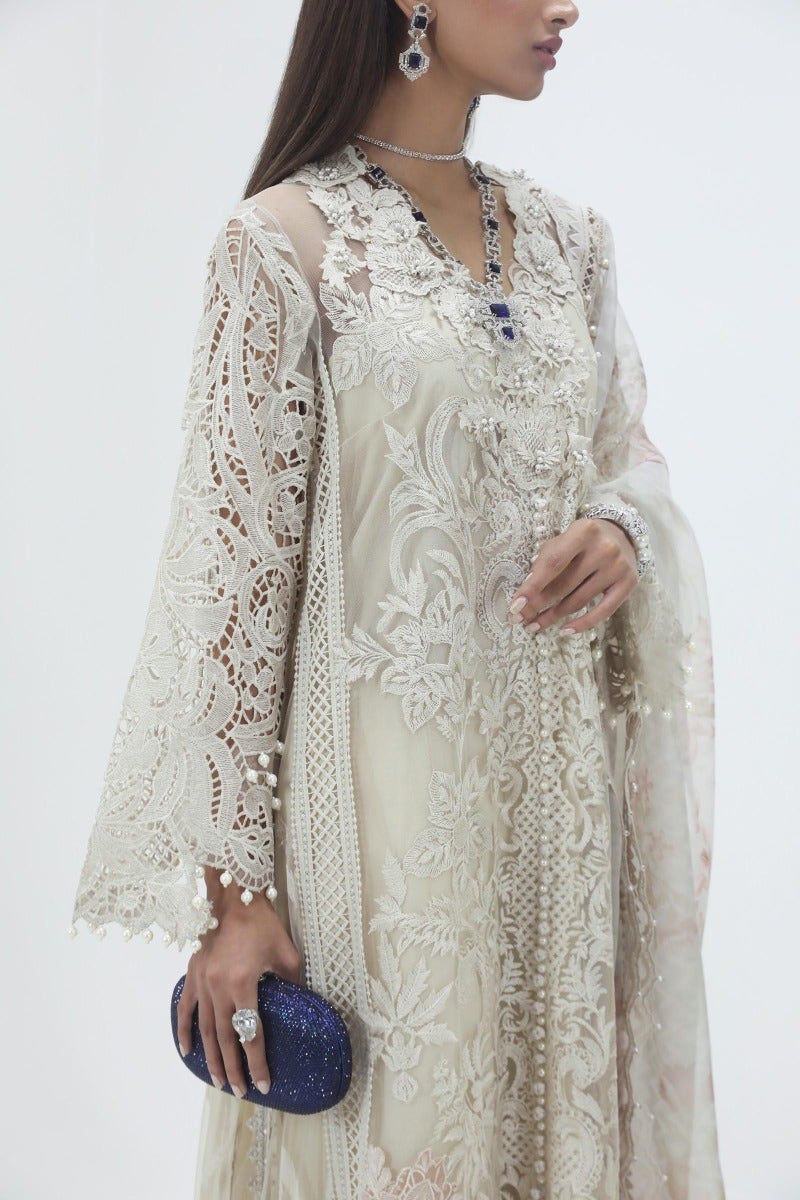 Fabric: An incandescent Italian lace style is beautifully composed with a floral cream resham and an ikat chevron embroidered back. accompanied by matching pants and a visually stunning floral dupatta in blush pink tones.