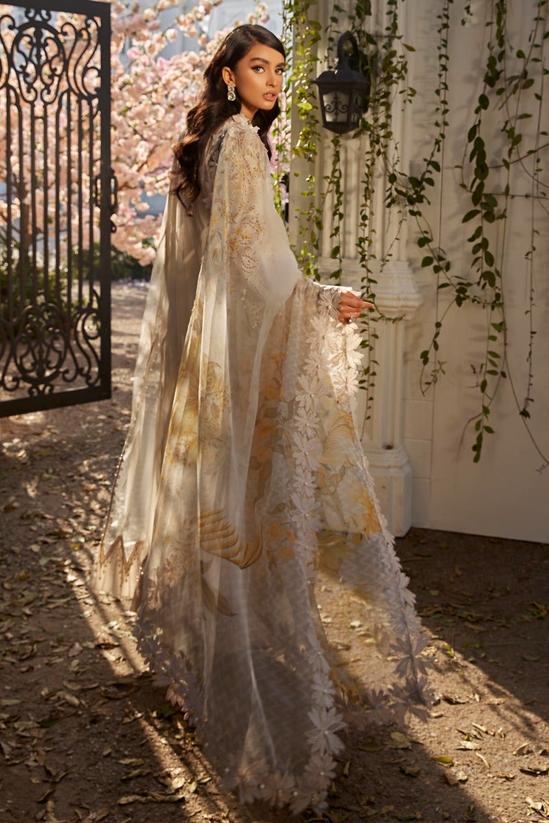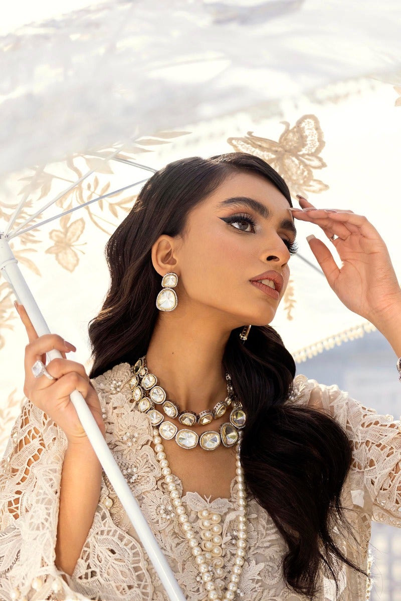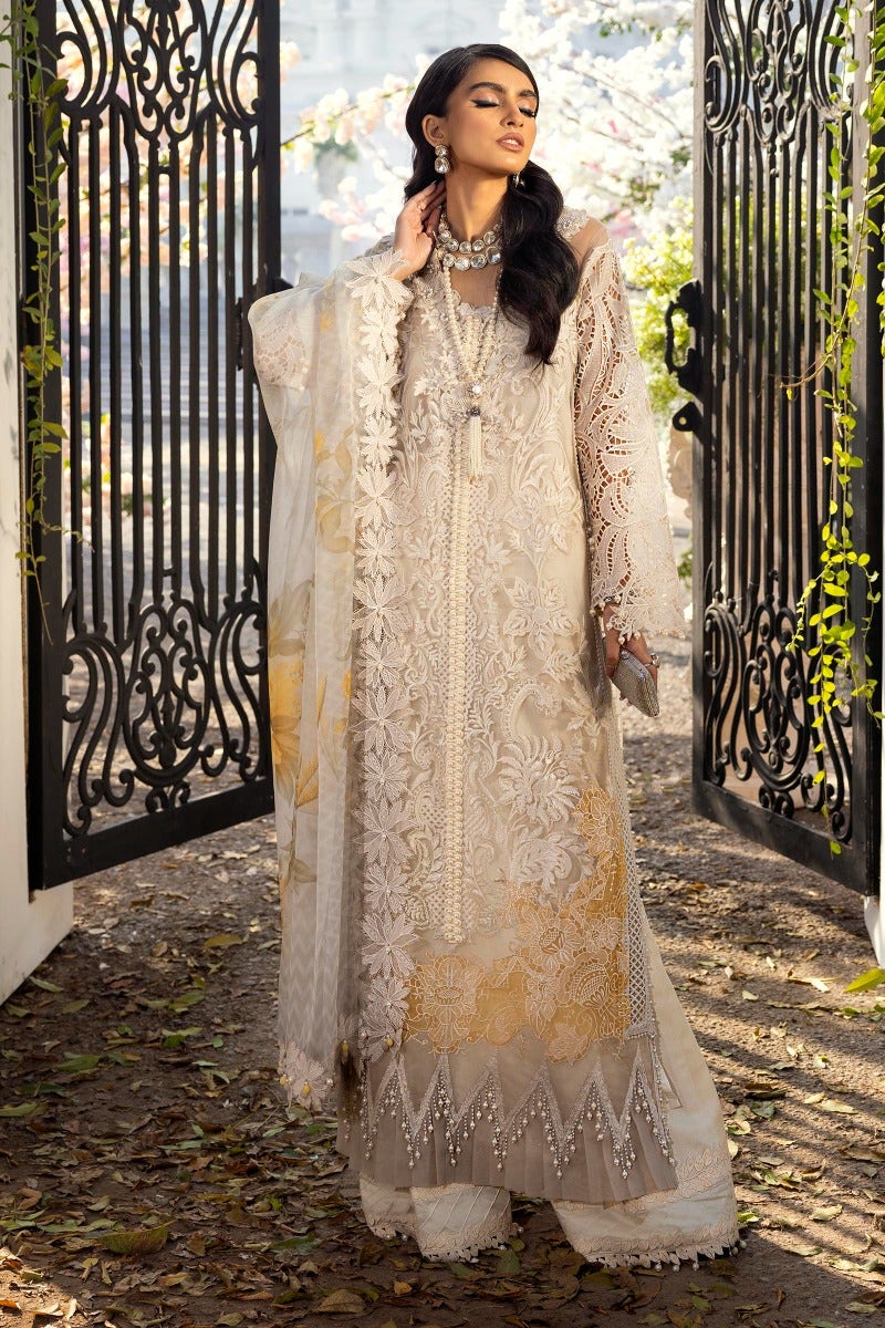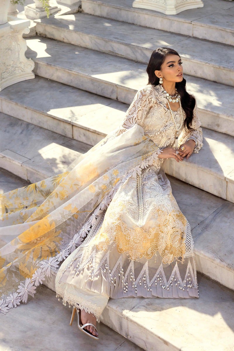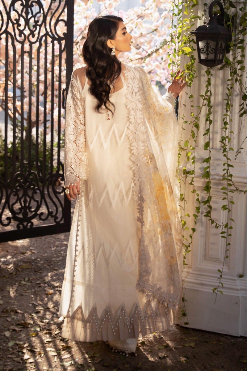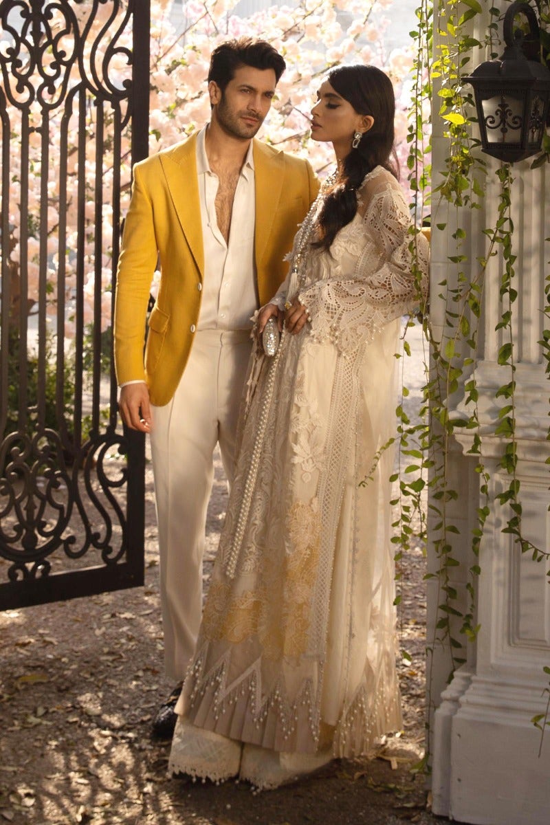 Fabric: An illuminating Italian lace style is superbly constructed with a flowery white resham and an ikat chevron embroidered back. It is paired with matching pants and a striking floral dupatta in glazed corn tones. |