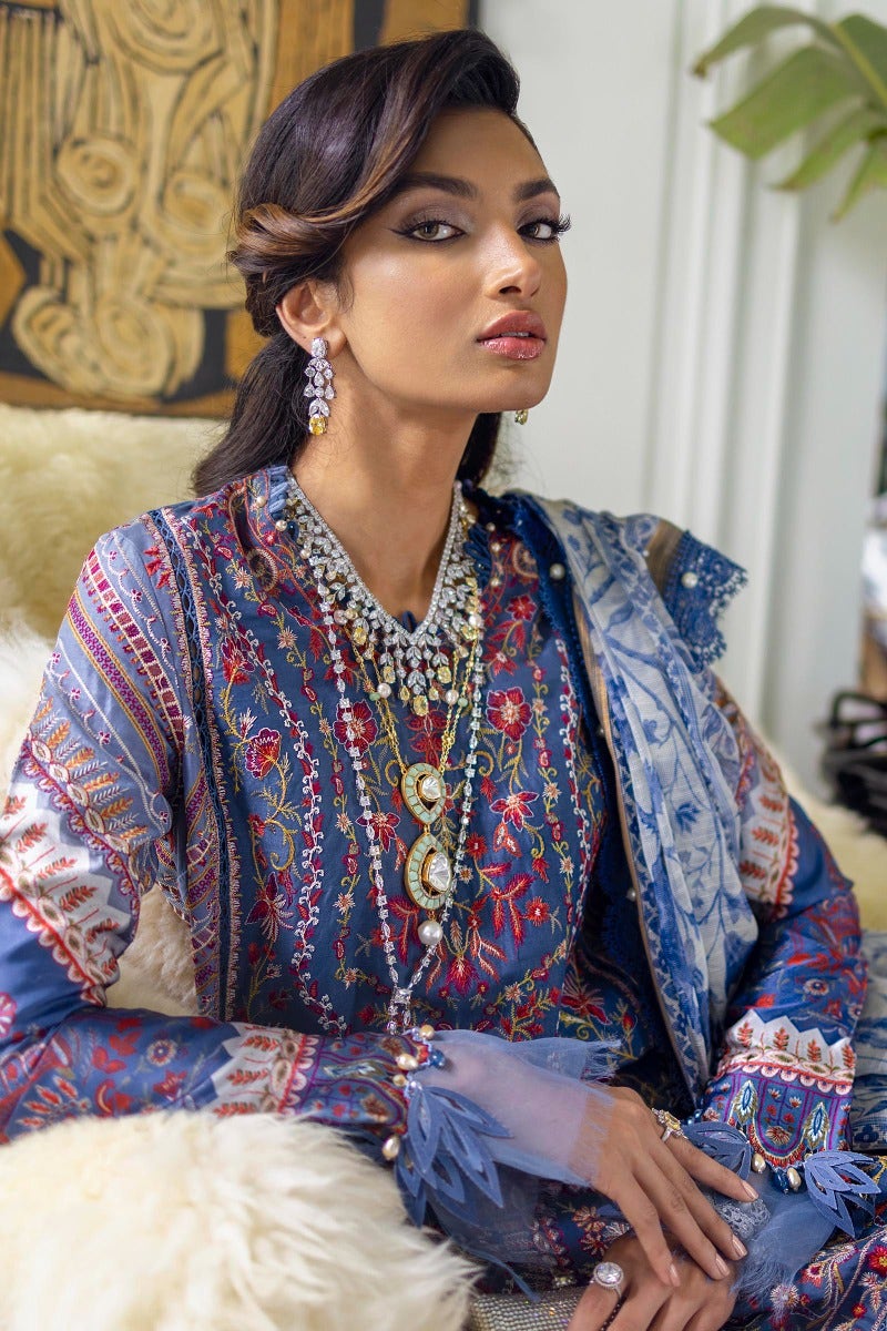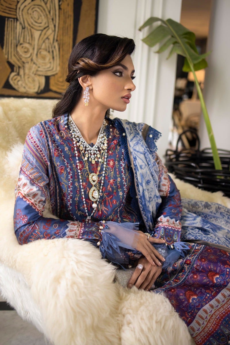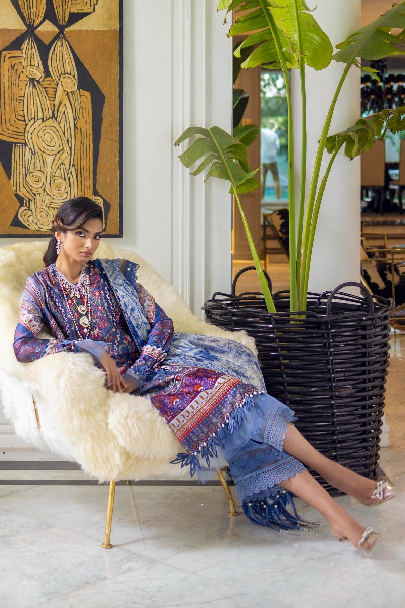 Fabric: A multi-color Mughal resham with an exquisite flower pattern on a French blue base and a delicately embroidered side kali. This style comes with a pair of pants and a beautiful ethnic chnitz digitally printed dupatta in monotones of French blue. A great statement piece that will keep you looking stylish throughout the season.