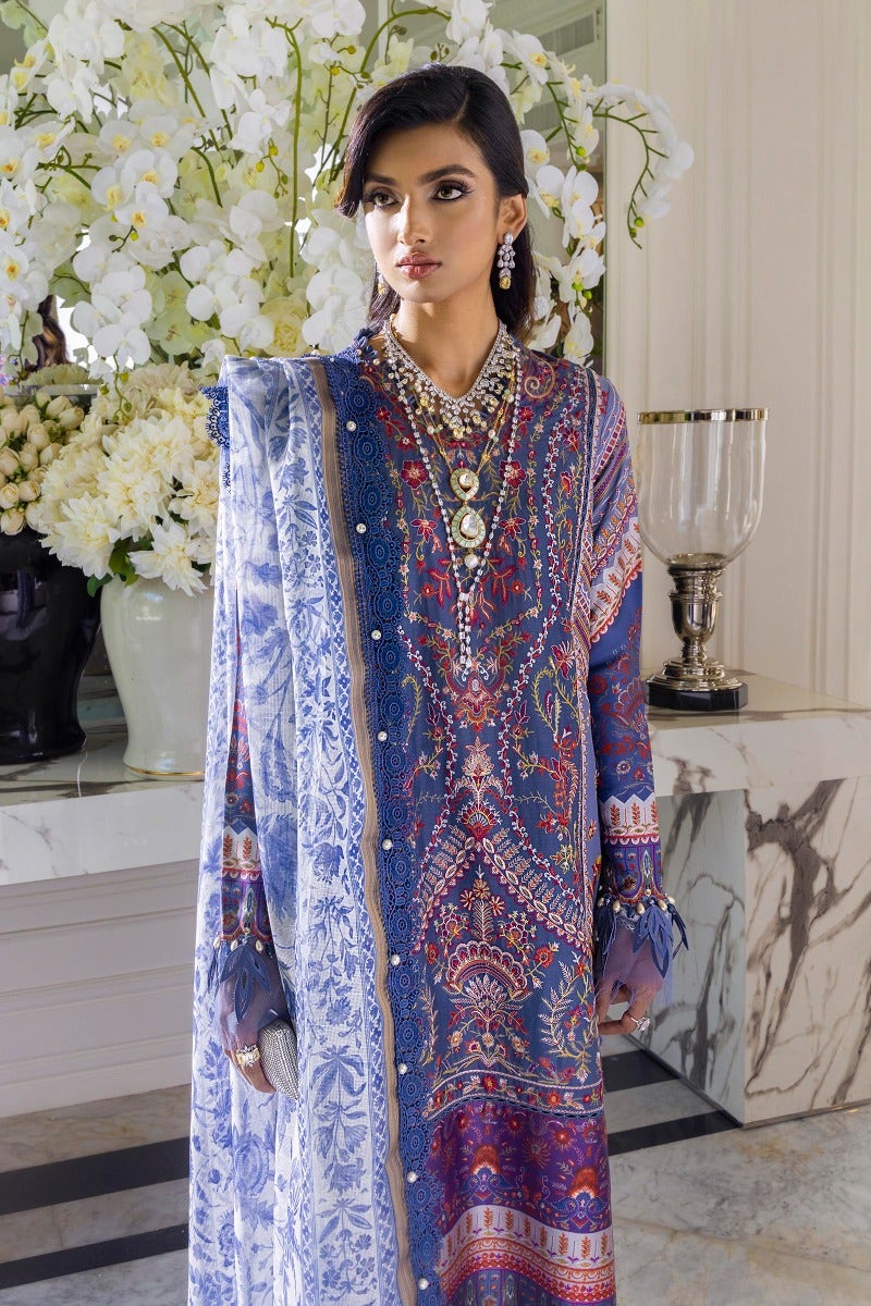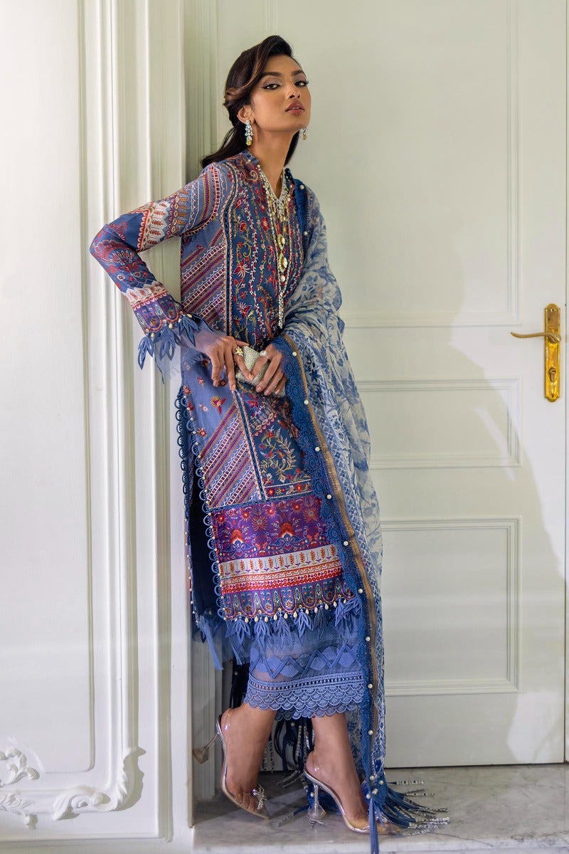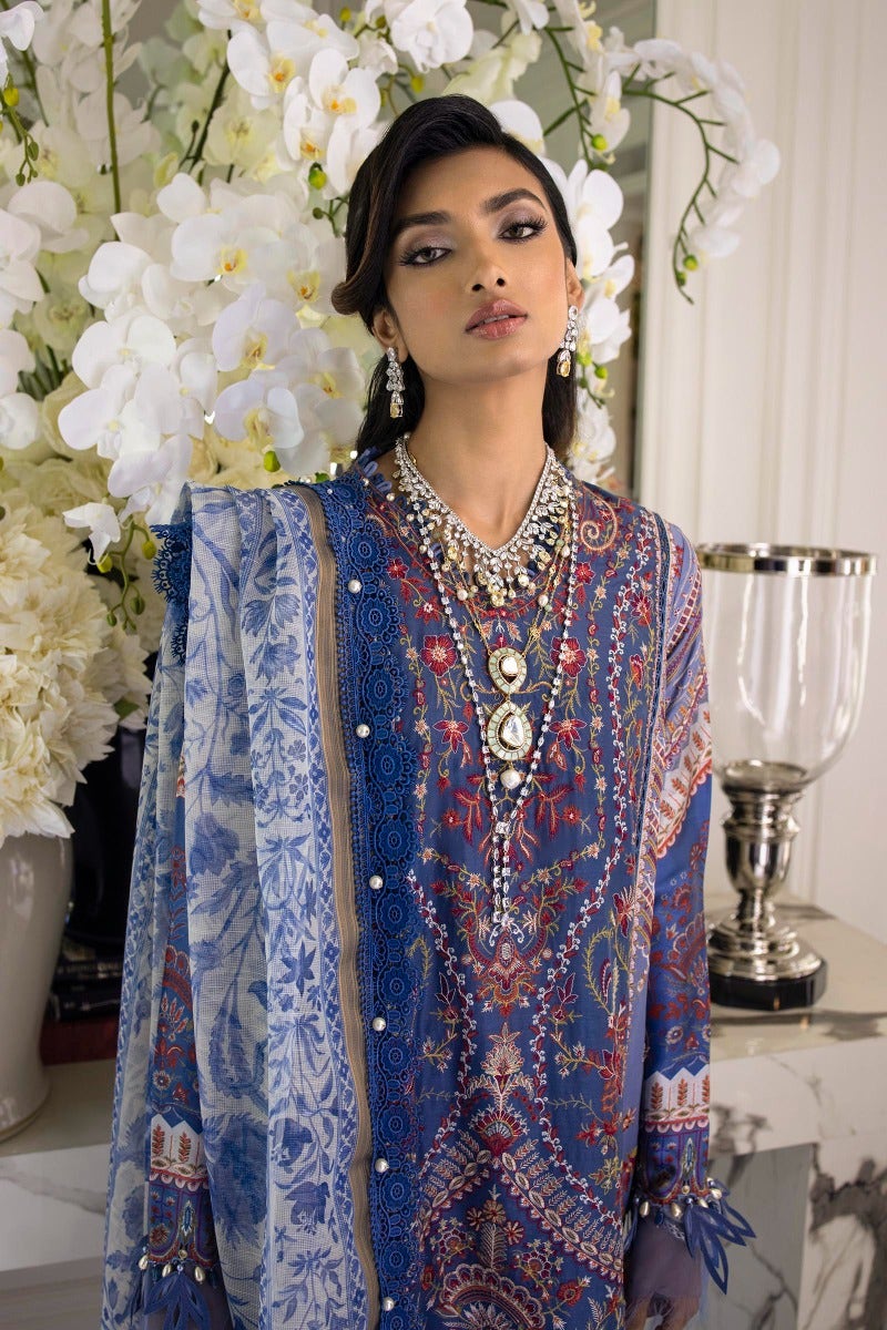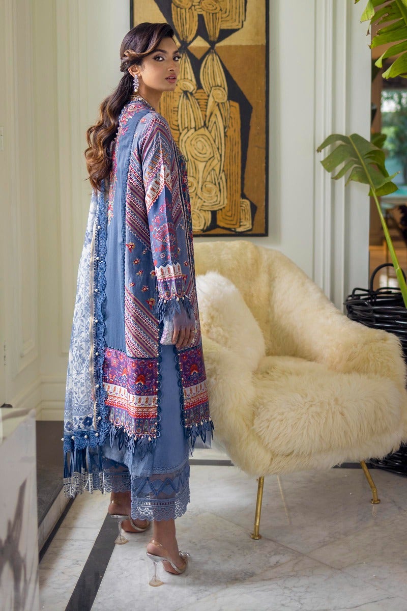 Fabric: A multi-color Mughal resham with an exquisite flower pattern on a French blue base and a delicately embroidered side kali. This style comes with a pair of pants and a beautiful ethnic chnitz digitally printed dupatta in monotones of French blue. A great statement piece that will keep you looking stylish throughout the season.