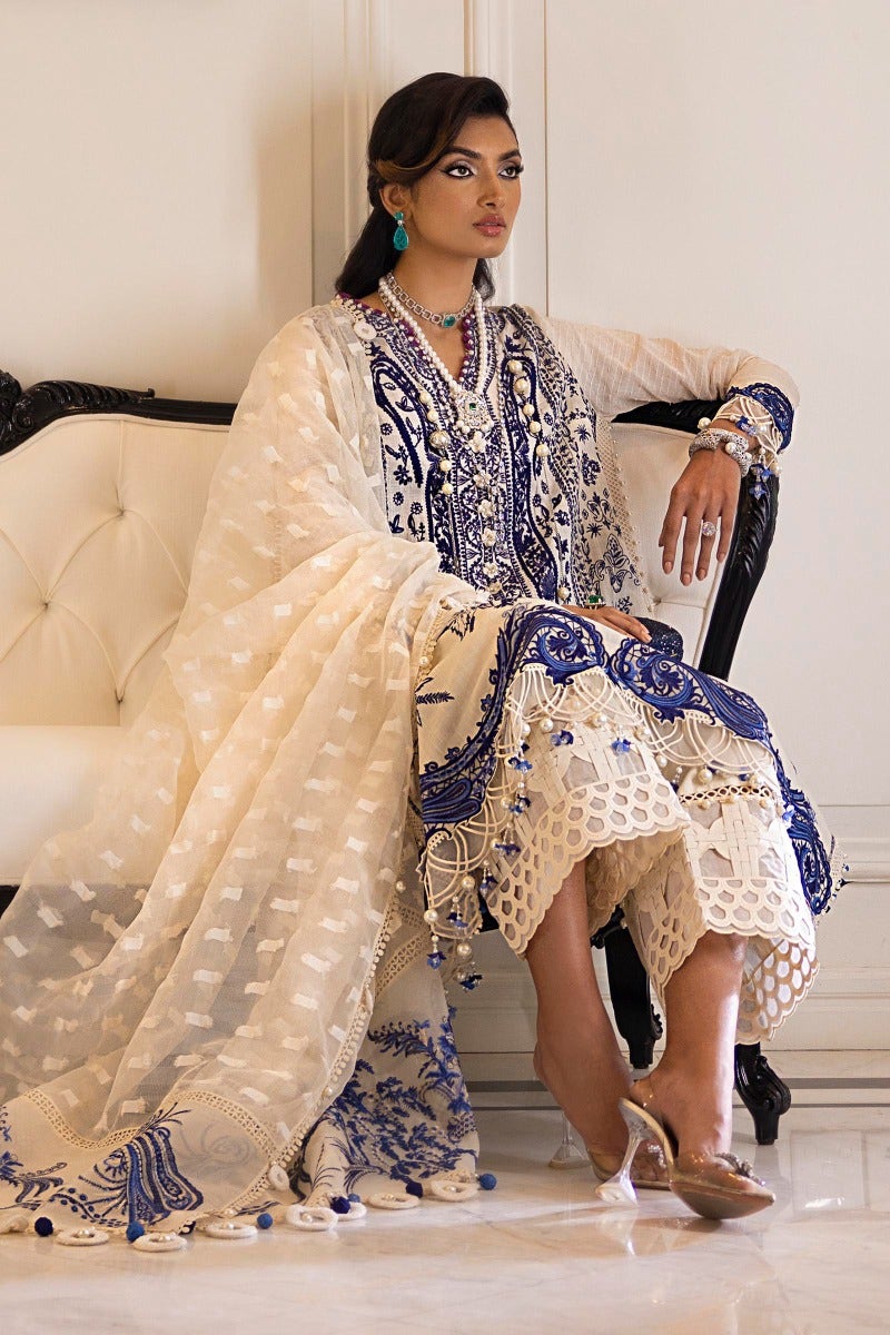 Fabric: This outfit features a highly composed navy blue appearance with a soft blue dori embroidered centre panel. It is paired with dyed pants and a wonderful organza woven 3D textured dupatta.