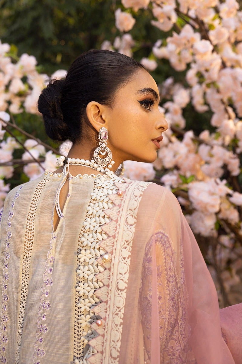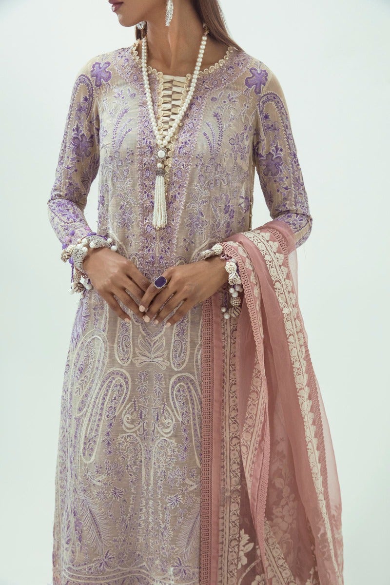 Fabric: A spectacular canvas with exquisite Kashmiri shawl-inspired embroidery in shades of purple and pink on a beige woven net. Completed with dyed pants and the dupatta is made of rouge-colored organza puff paste with a chinoiserie design.