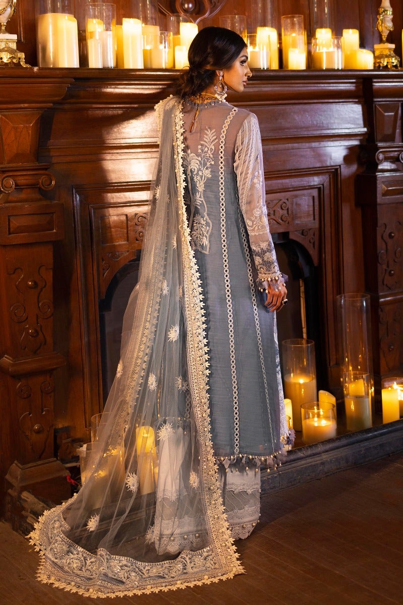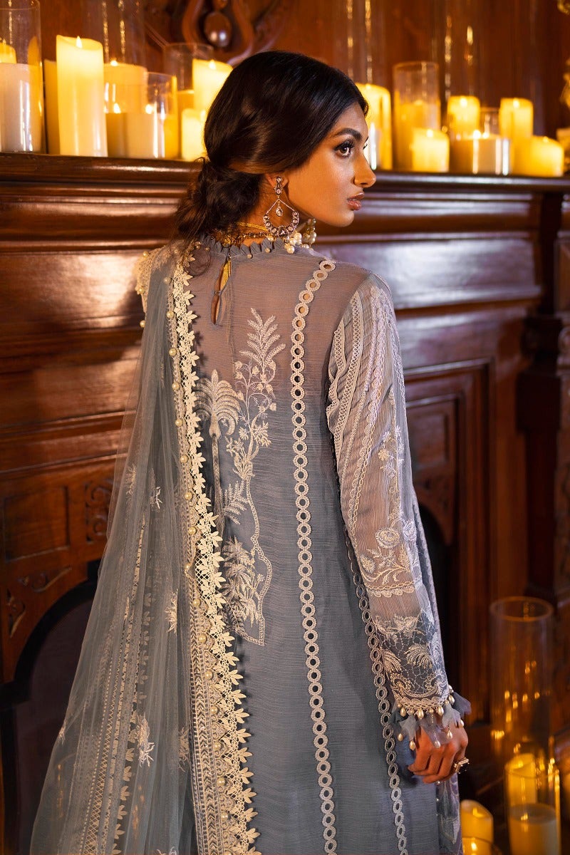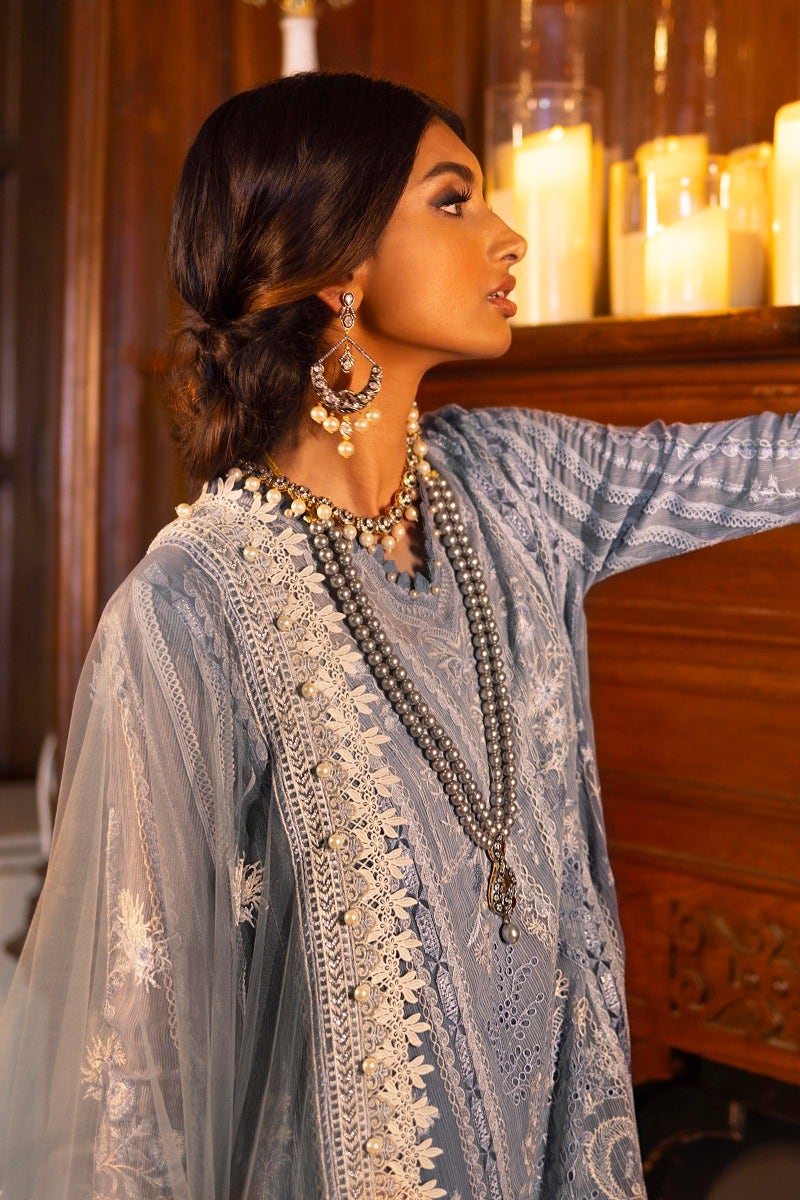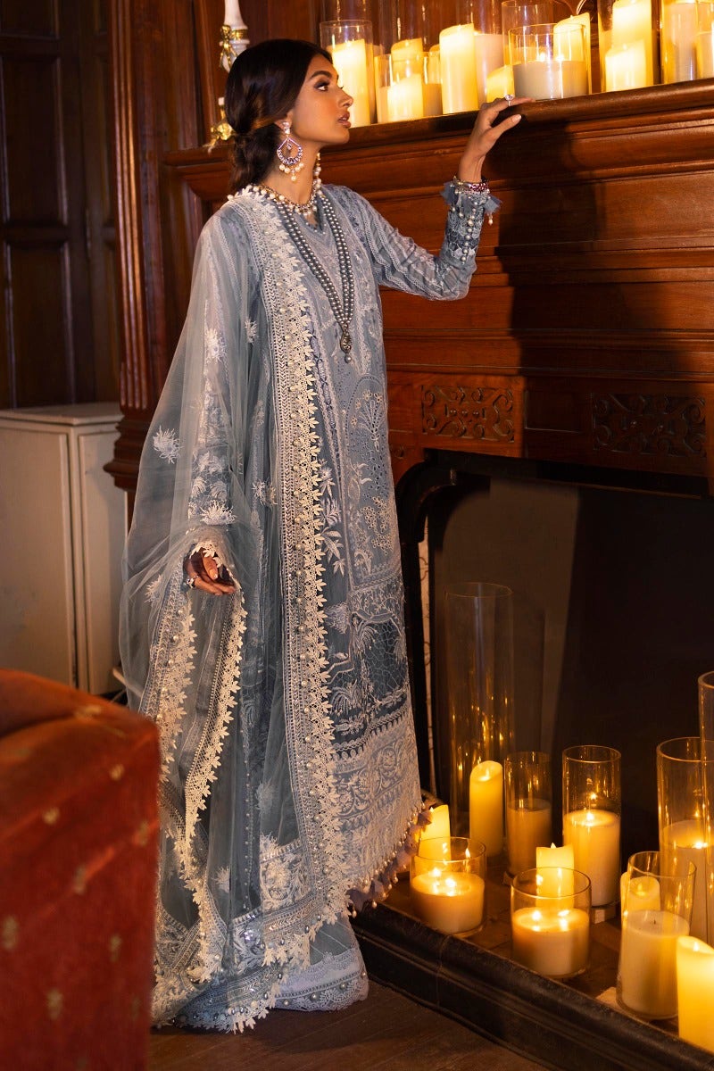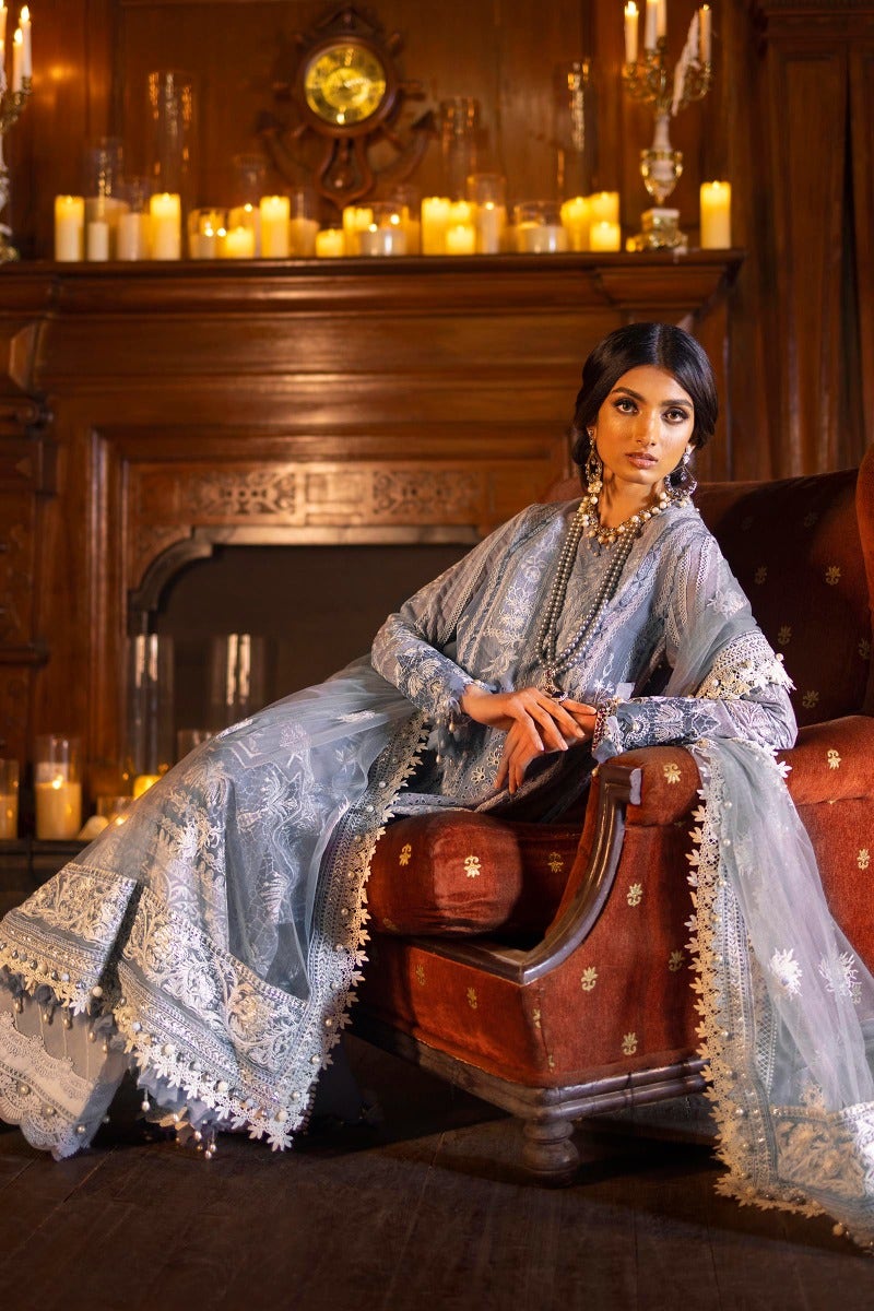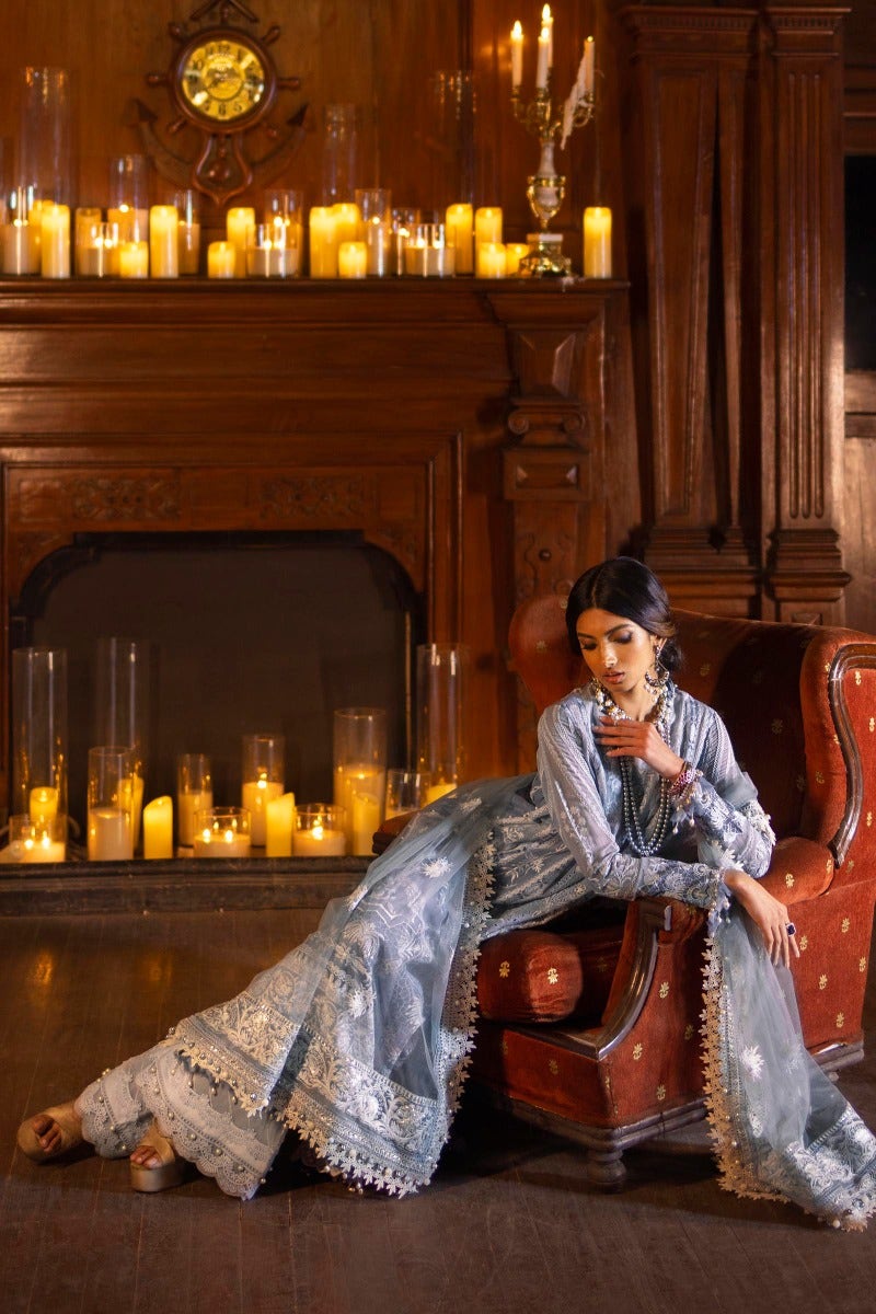 Fabric: A French blue and baby blue hue serve as the canvas for this embroidered ensemble. A luminous combination that is paired with sky blue pants and an embroidered dupatta on tulle net. This regal look embodies everything that SS stands for; elegance with style.