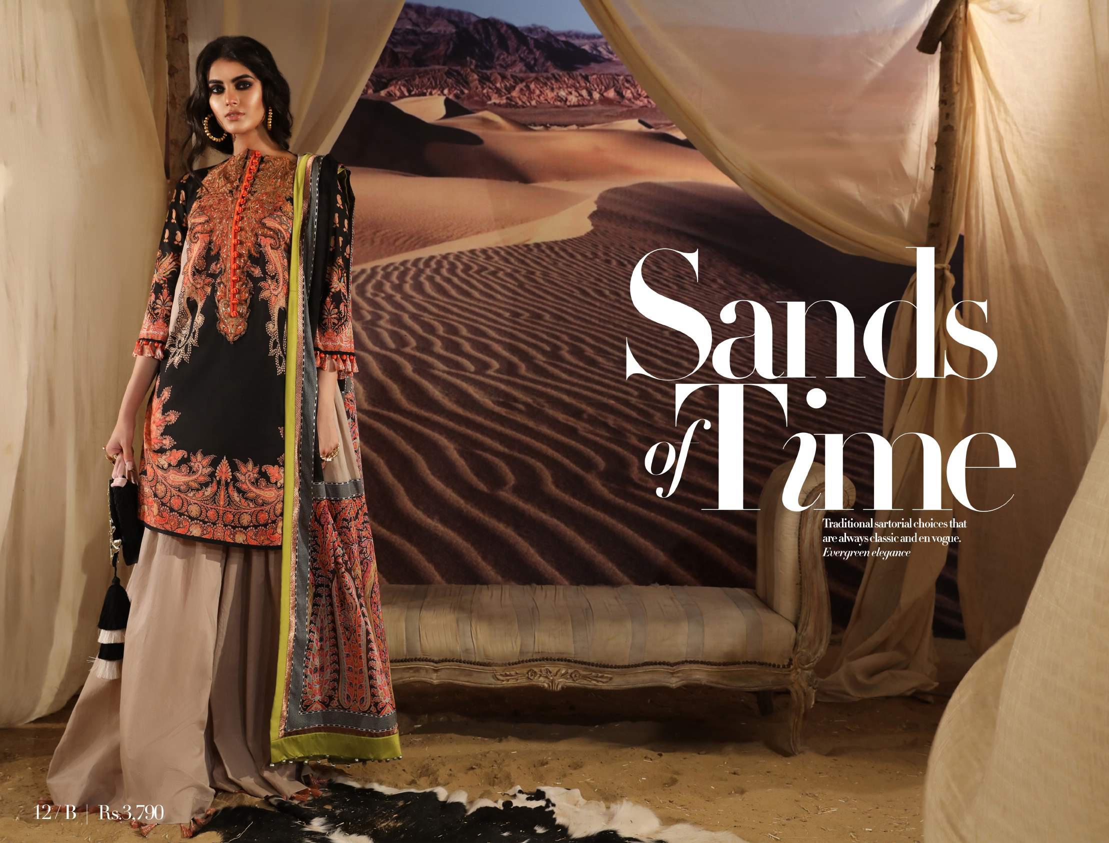 Fabric: A Midnight black digitally printed shirt with artisanal Kashmiri motifs and an embroidered organza neckline with printed back and sleeves. Complemented by a digitally printed lawn dupatta with an indigenous motif border and dyed pants. Digitally printed front on lawn: 1.25m Digitally printed back on lawn: 1.25m Digitally printed sleeves on lawn: 0.65m Embroidered neckline on organza Dyed pants: 2.5m Digitally printed Dupatta on lawn: 2.5m |