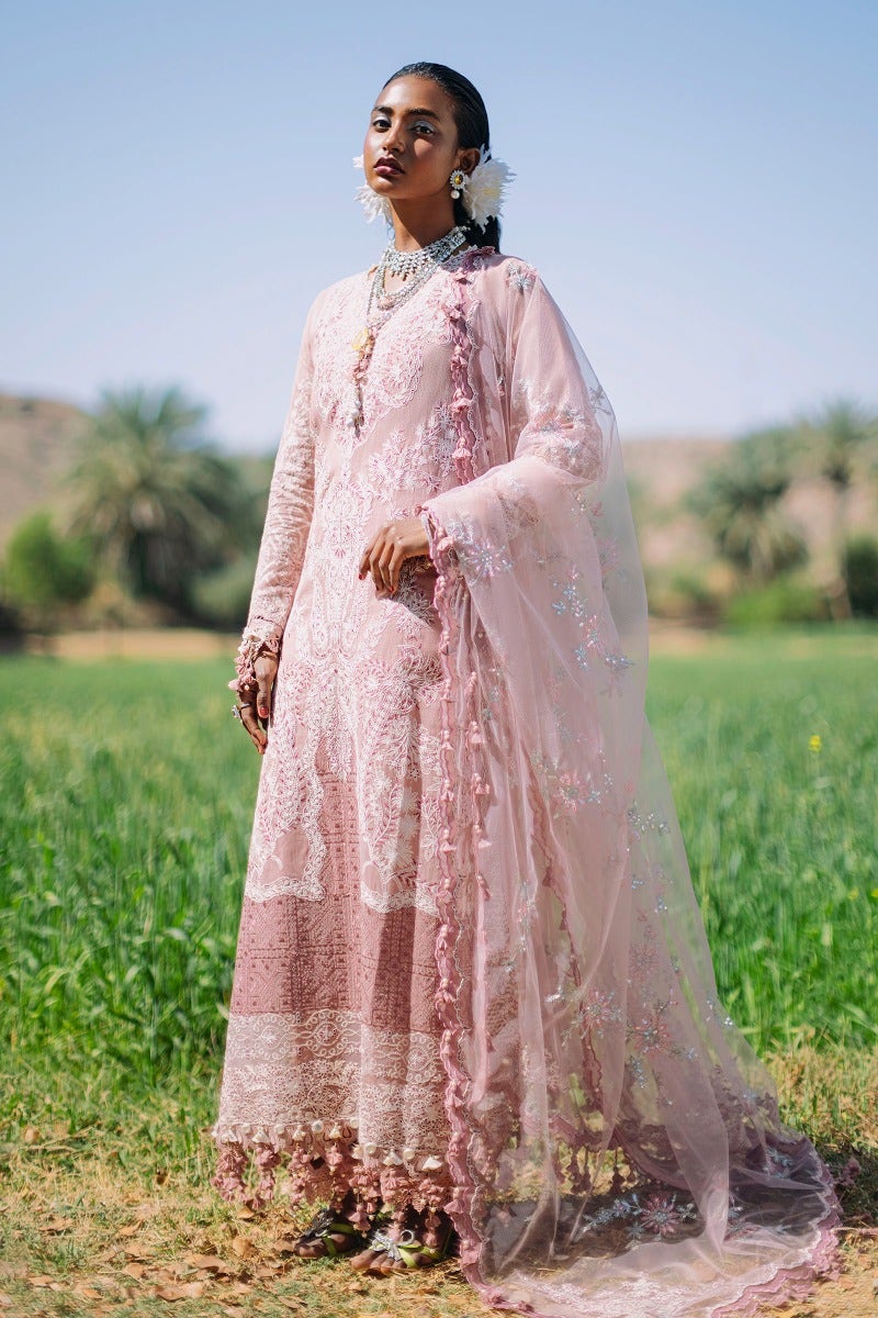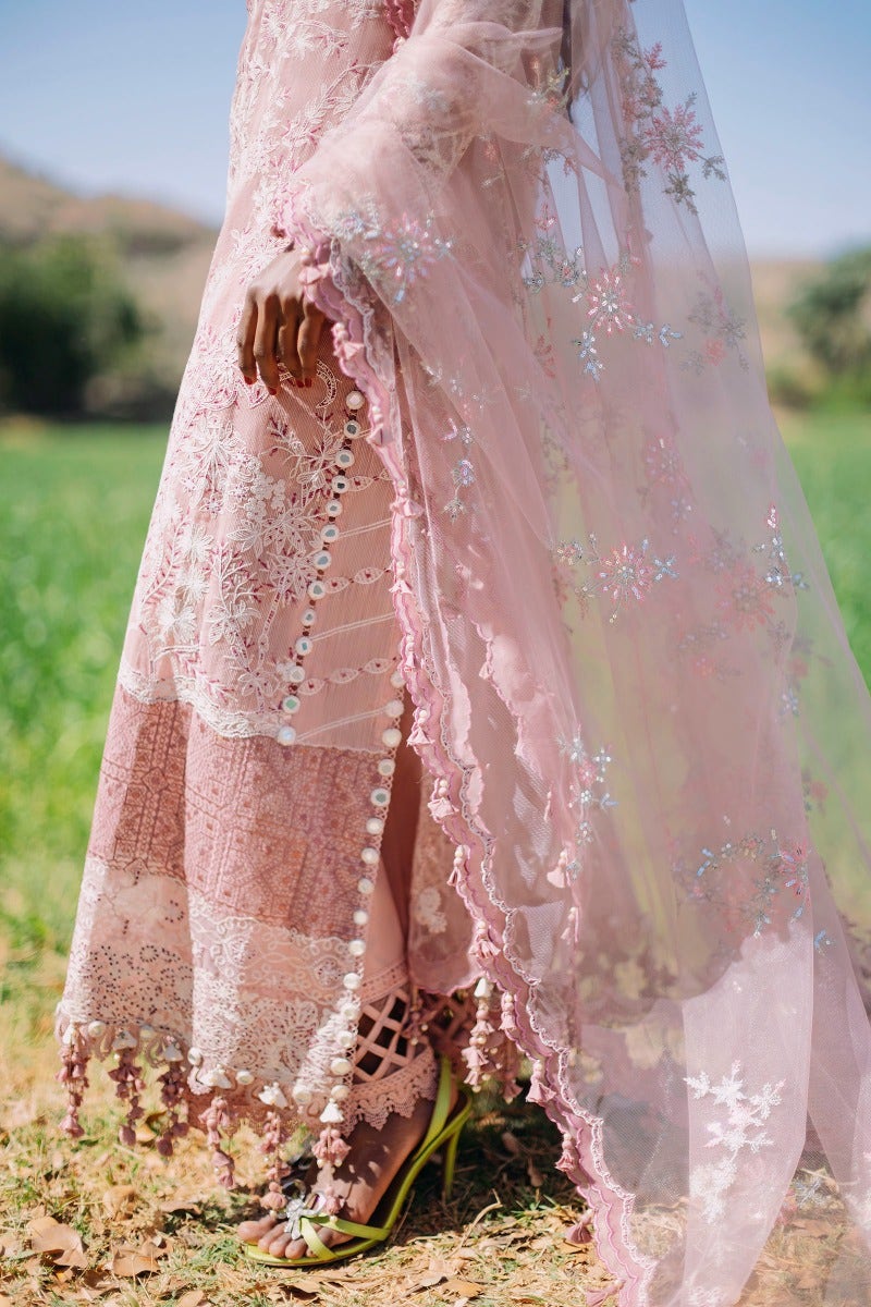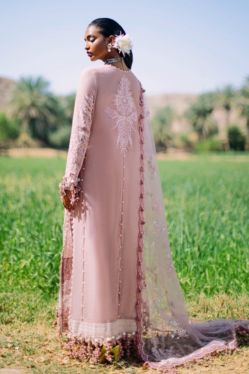 Fabric: Revisiting classic silhouette in new fangled perspectiveon an artfully layered mauvy pink canvas. A similar hued dupatta with floral artistry gives it modernly grace.