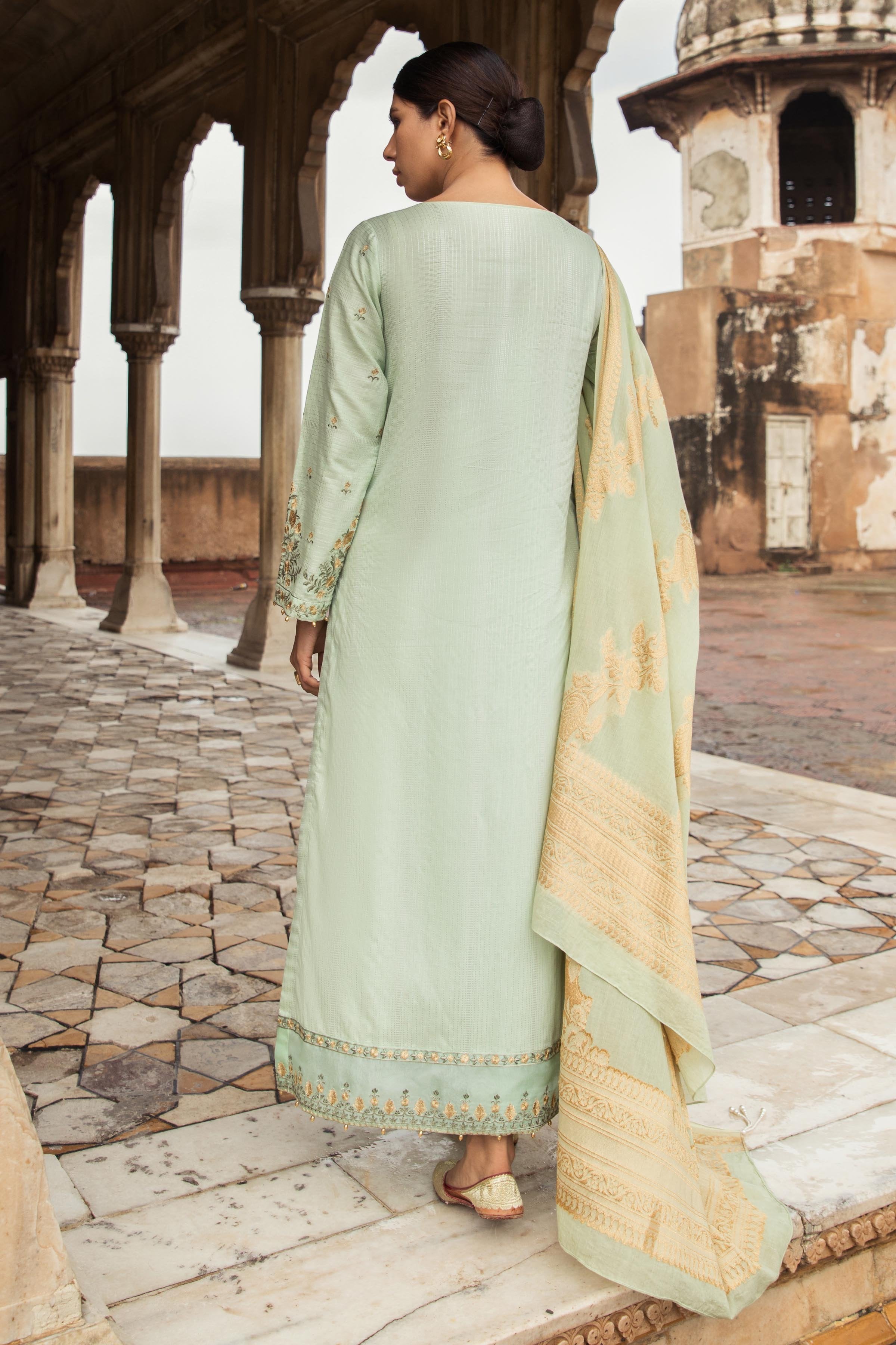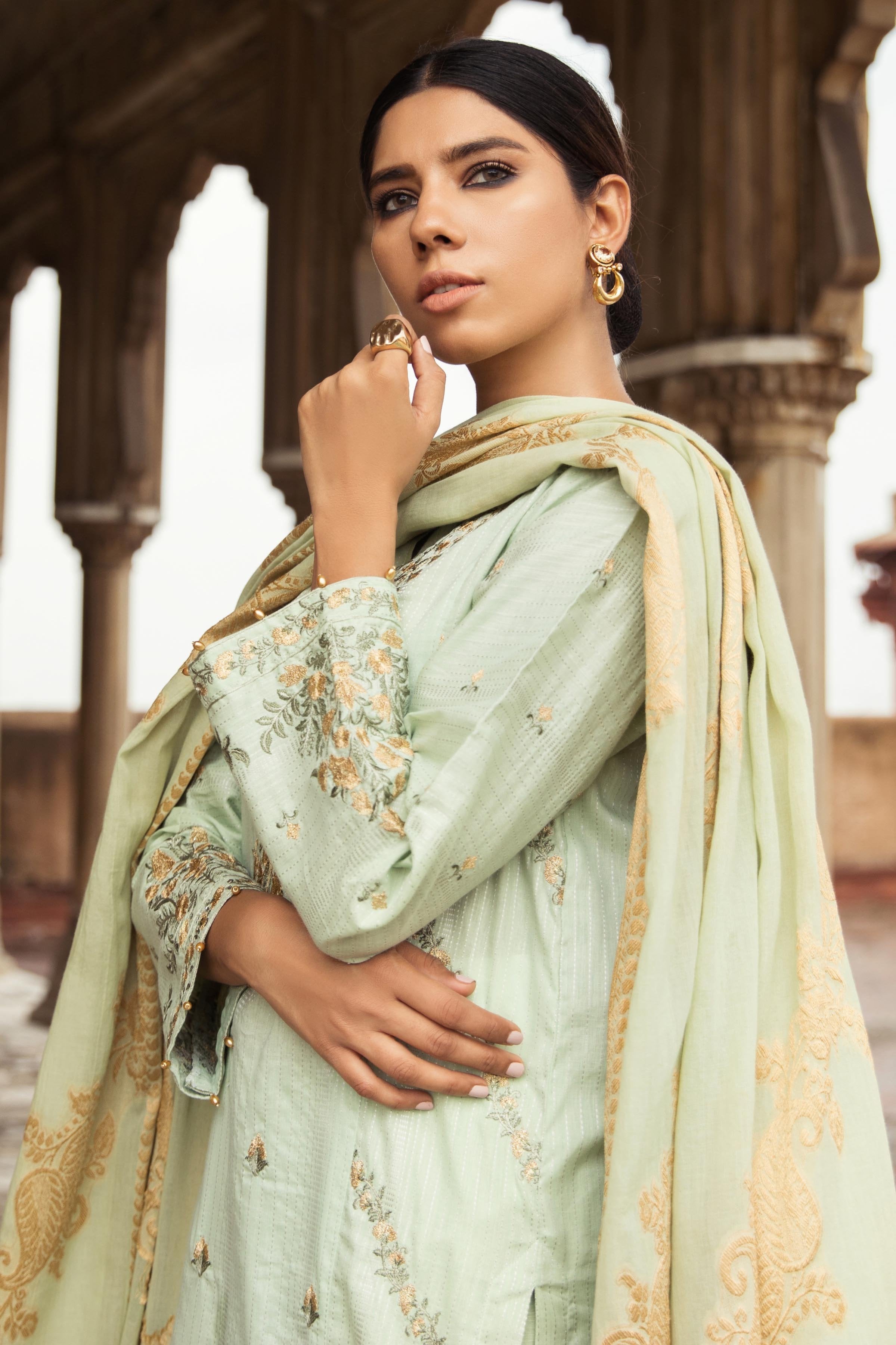 Fabric: This royal grape green ensemble comprises of an embroidered zari cotton shirt, a matching fancy dupatta and slub cambric trousers. Worked organza accents add a luxe touch to the ensemble. Unstitched 3-Piece Shirt Color: Apple green Dupatta Color: Apple green Trouser Color: Apple green Style Note |