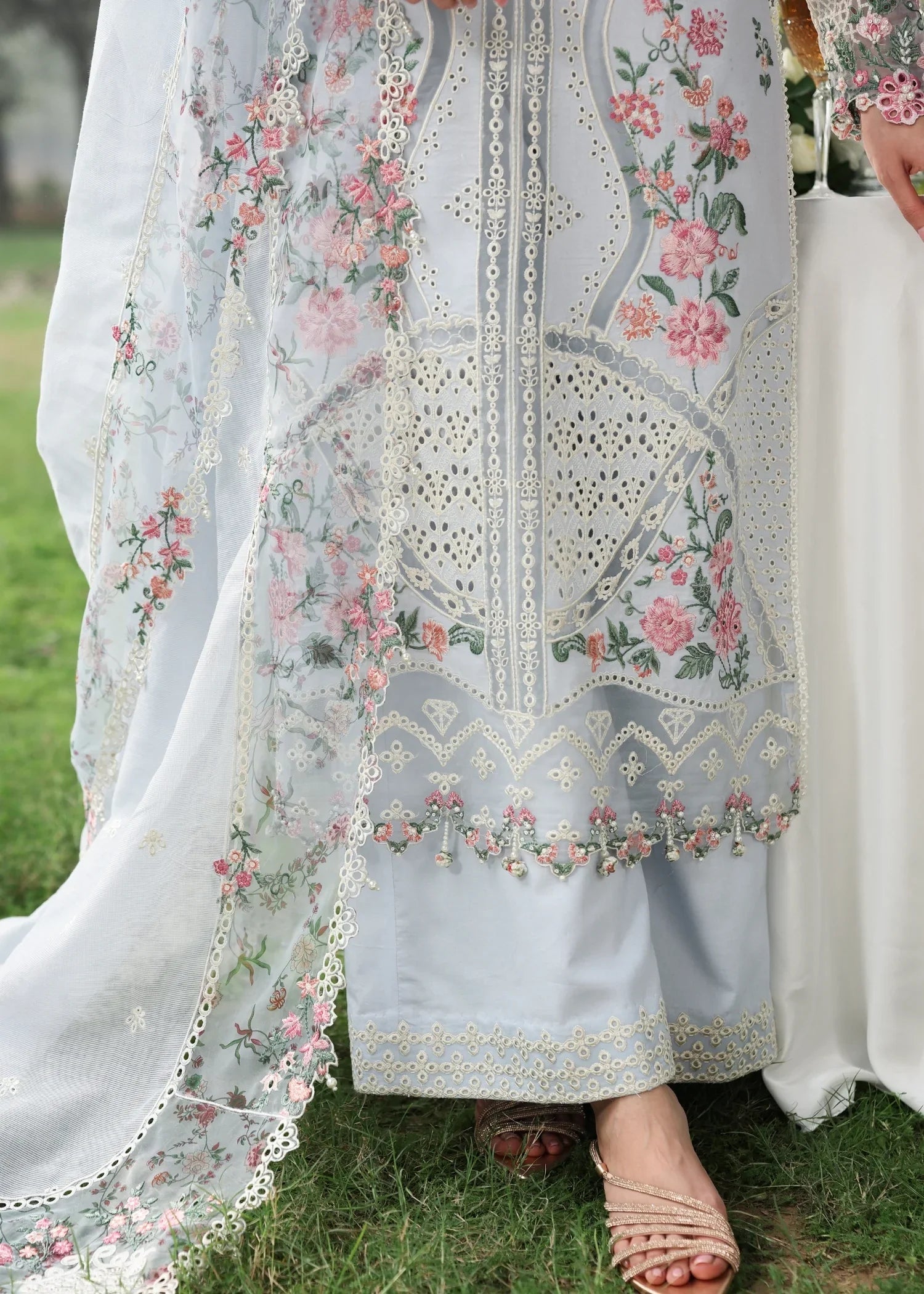 Summary: Embrace timeless elegance with the 'MORNING SKY' Pakistani Suit. This exquisite ethnic wear features a stunning Powder Blue kameez crafted from breathable lawn, making it a perfect summer outfit. The shirt is a masterpiece of design, showcasing intricate Chikankari embroidery and delicate laser work across the front panels. A hand-worked neckline on printed organza adds a touch of luxury. This Pakistani Lawn Dress is ideal for festive occasions like Eid, daytime weddings, or Nikah ceremonies. Its sophisticated detailing and serene color make it a standout piece for anyone looking to buy elegant festive clothing online.