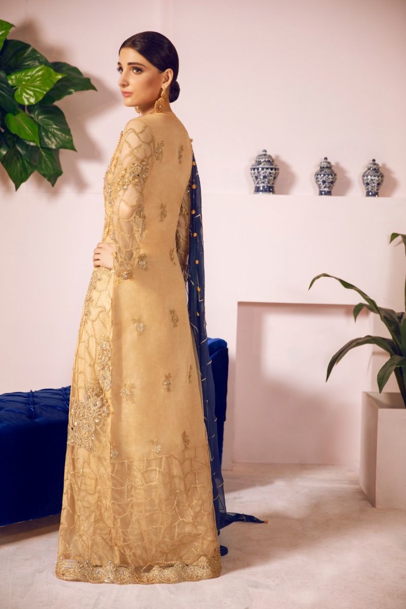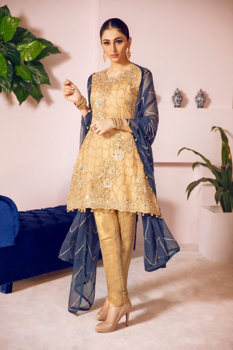 Fabric: EMBROIDERED NET HANDMADE FRONT AND SLEEVES EMBROIDERED NET BACK EMBROIDERED CHIFFON DUPATTA EMBROIDERED HANDMADE DAMAN PATCH JAMAWAR TROUSER AND ACCESSORIES |