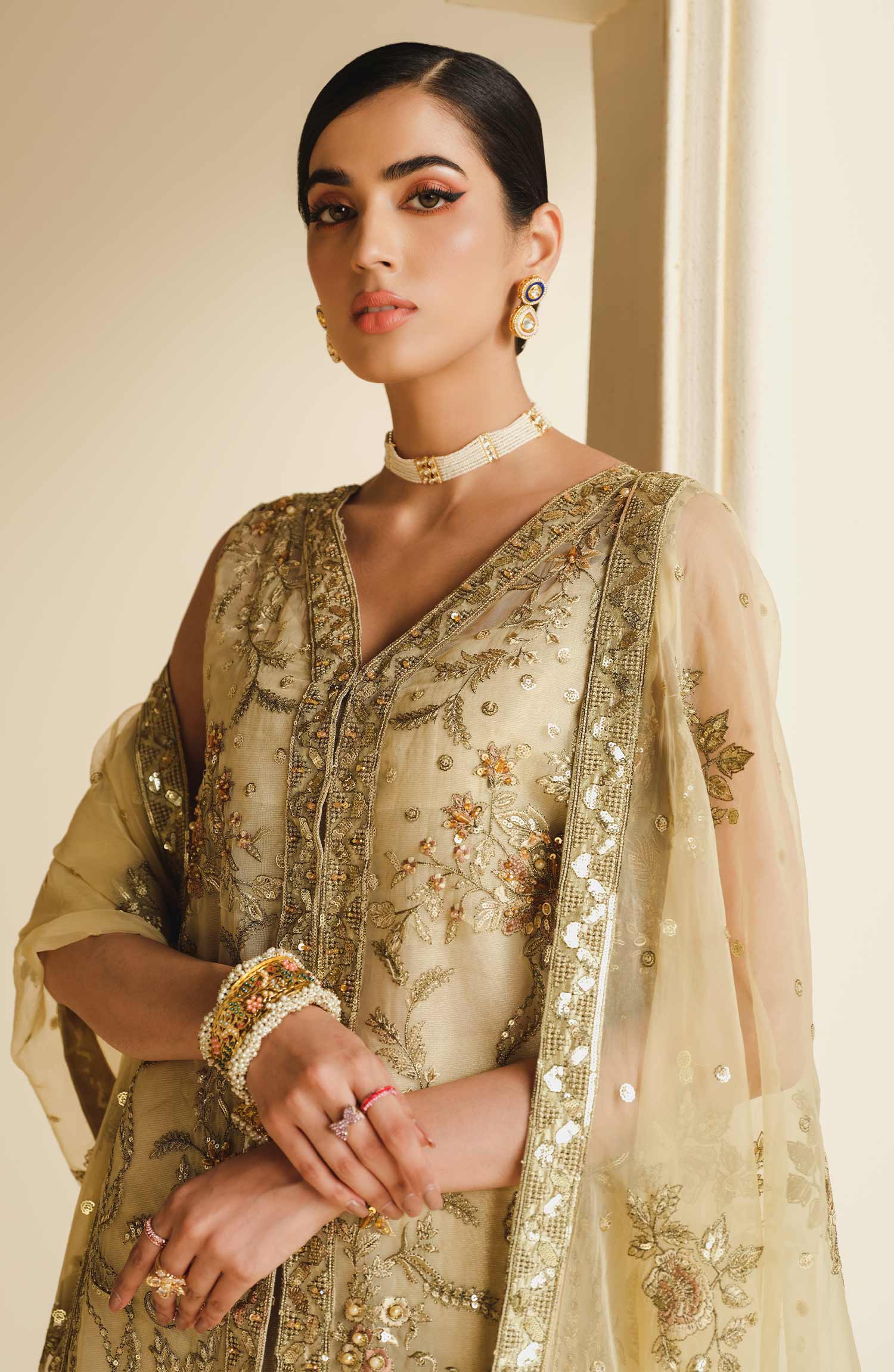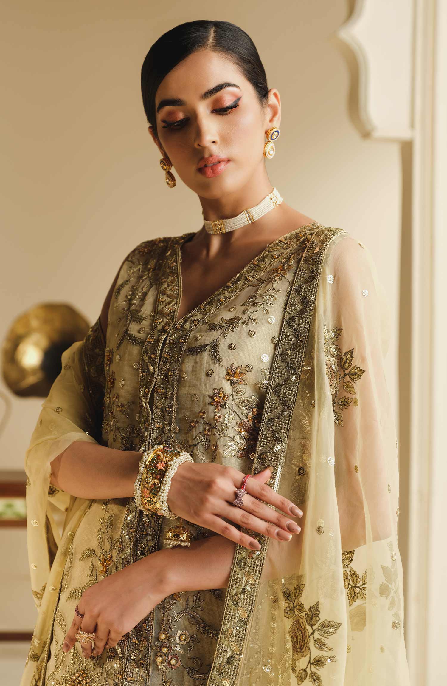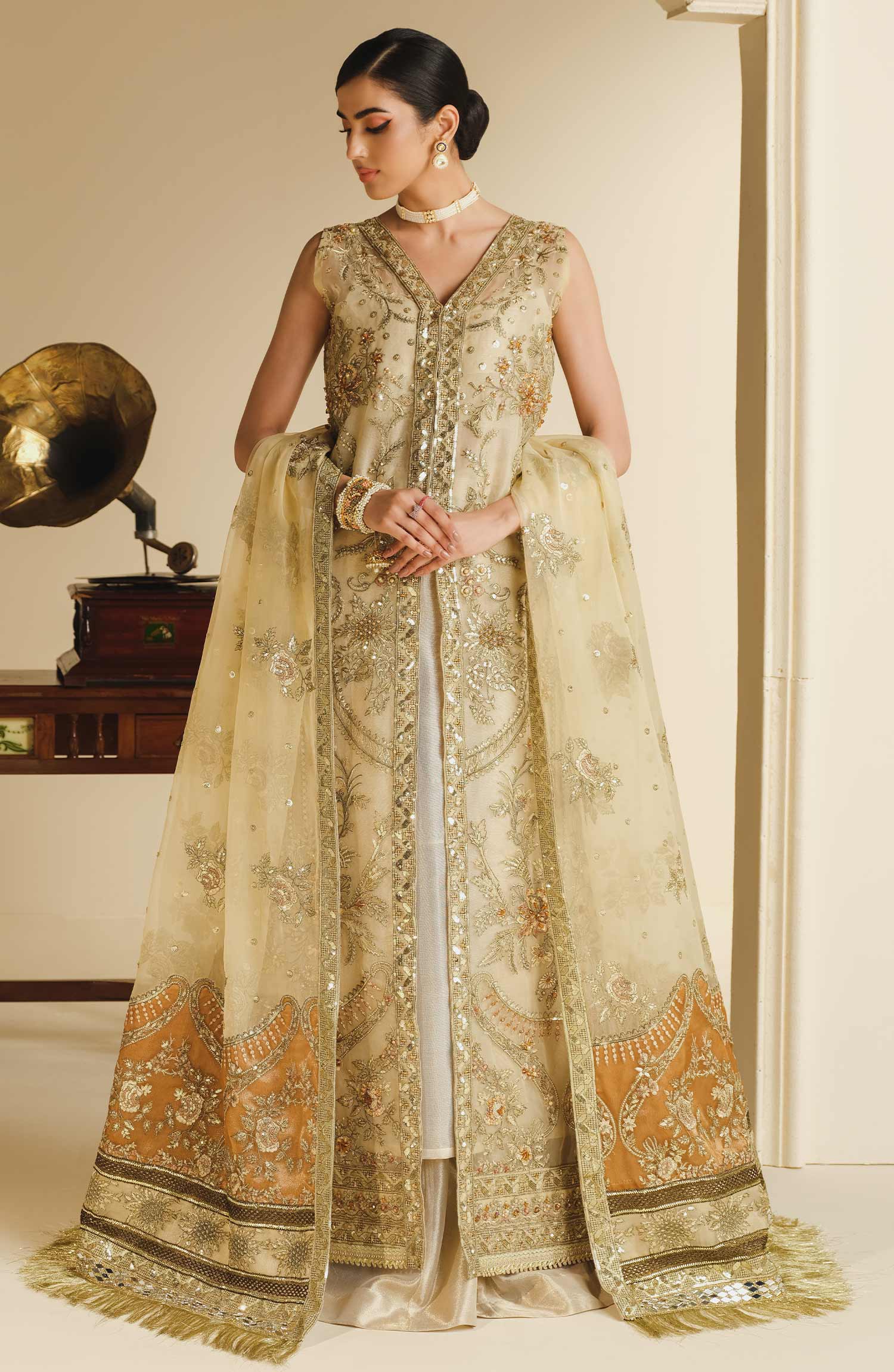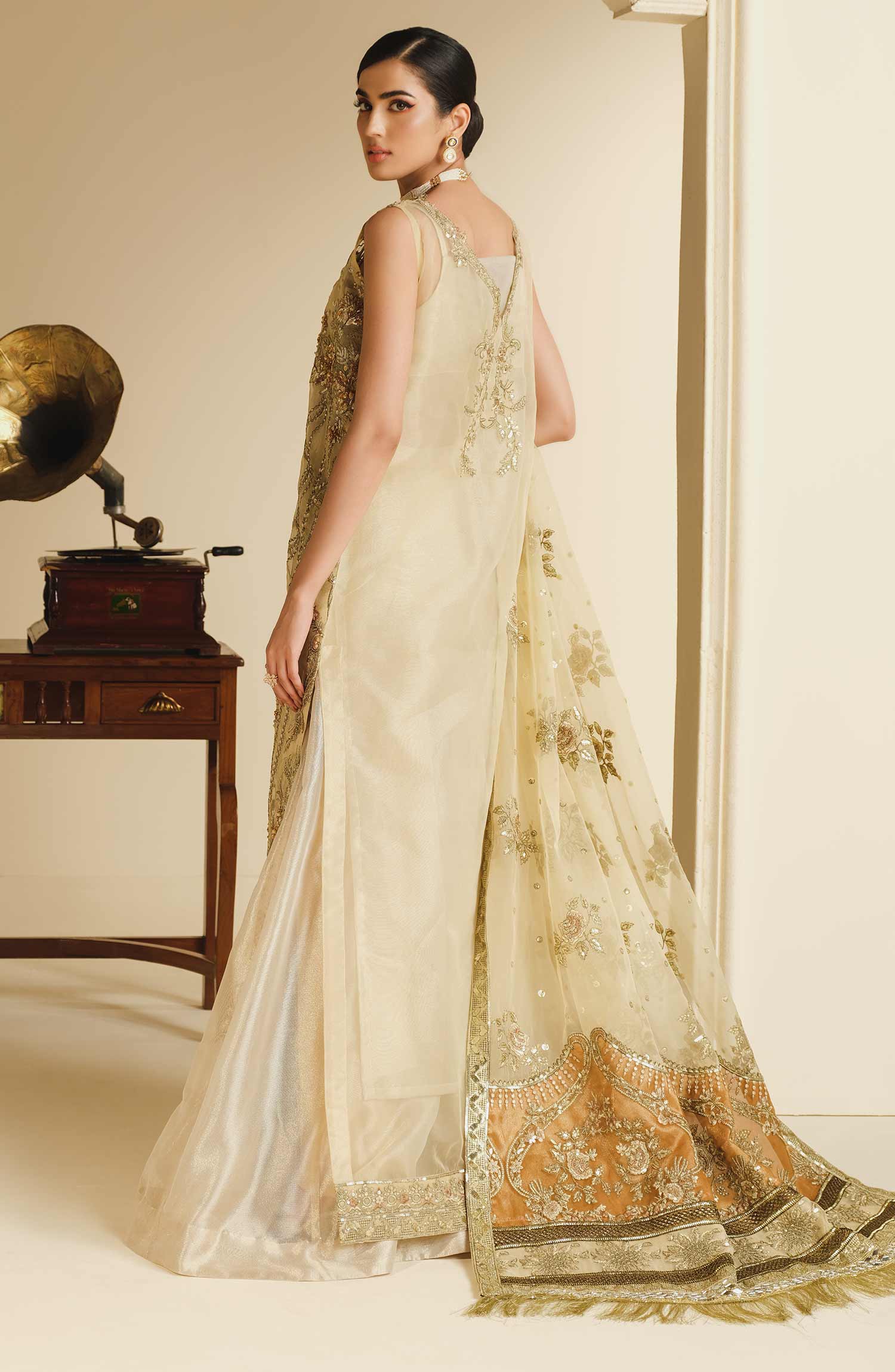 Fabric: Embroidered handmade organza left right panel & bodice Embroidered organza sleeves Organza back with embroidered motif Embroidered organza front center Patti patch Embroidered organza dupatta with embroidered organza Palu & Patti patches Tissue trouser |