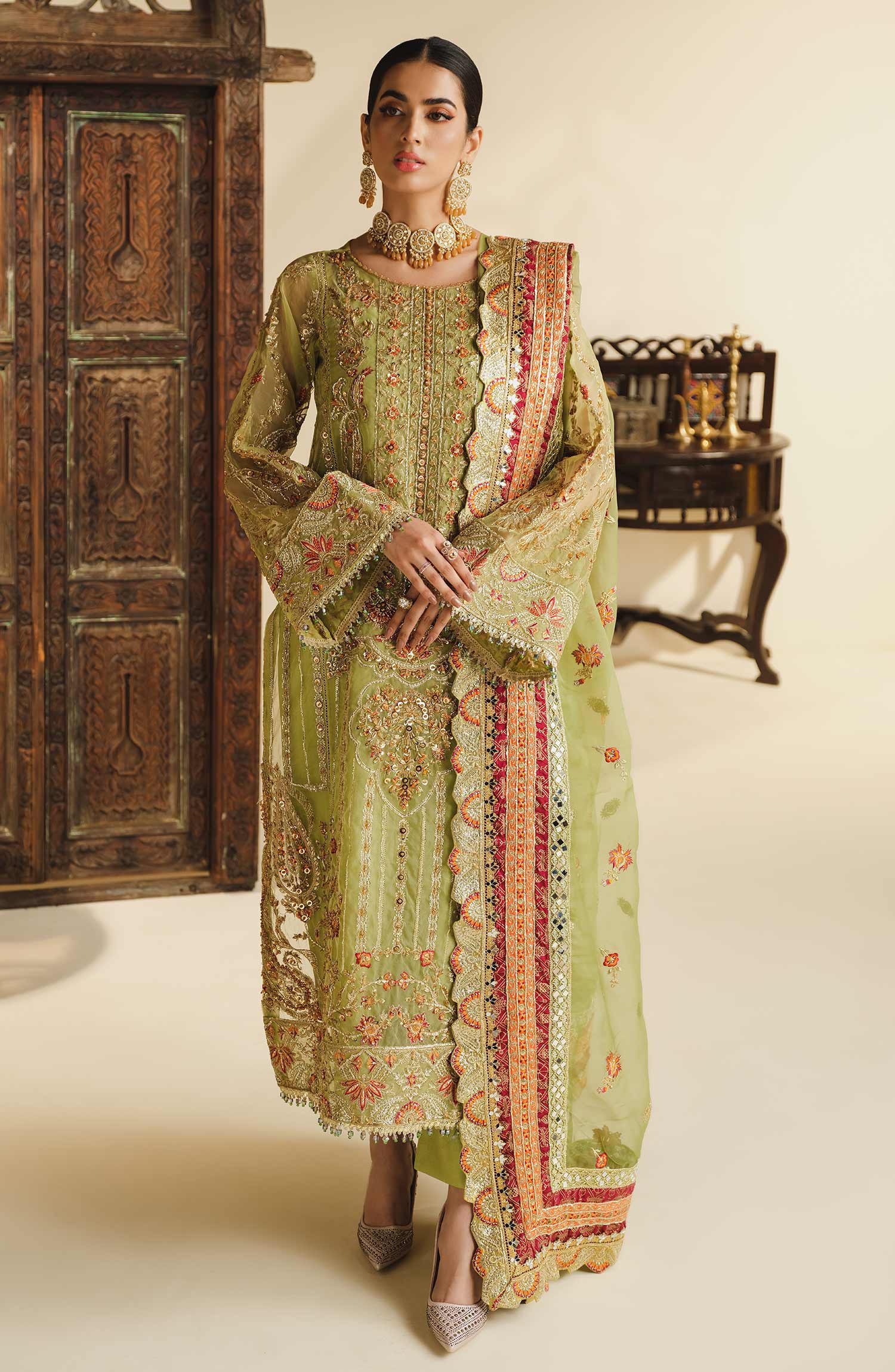 Fabric: Embroidered handmade organza front Center panel left right panel & sleeves Organza back Embroidered handmade organza front & sleeves Patti patch Embroidered organza dupatta with embroidered organza & grip Patti patch Grip trouser |