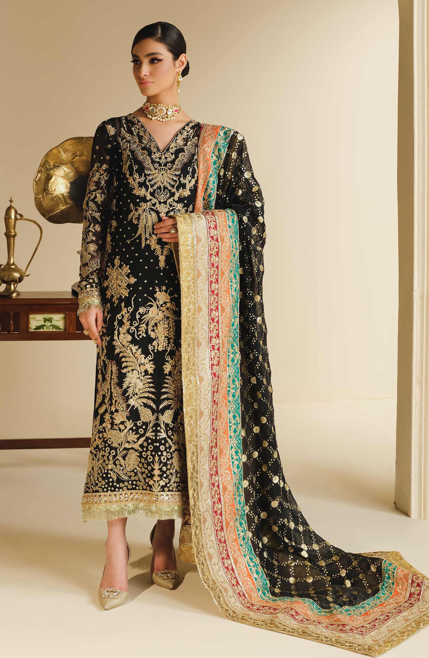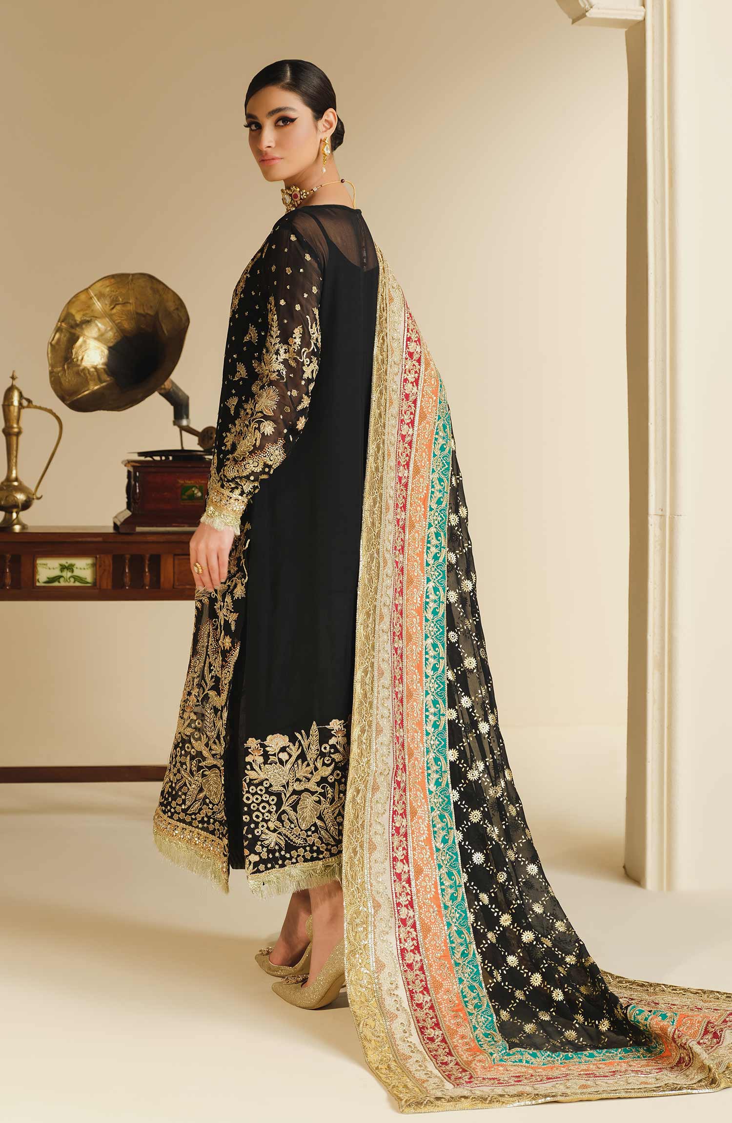 Fabric: Embroidered chiffon organza front center panel left right panel & sleeves Chiffon back Embroidered organza front back daman Patti patch Block print chiffon dupatta with embroidered grip & tissue Patti patch Grip trouser |