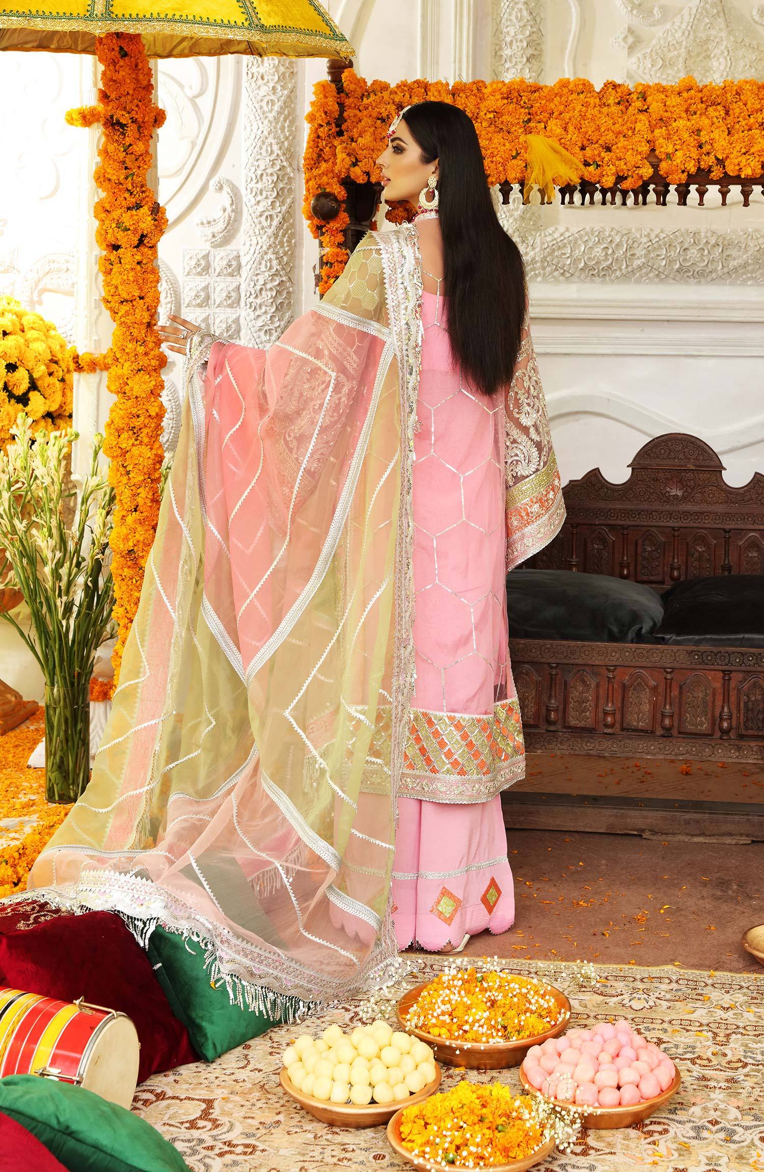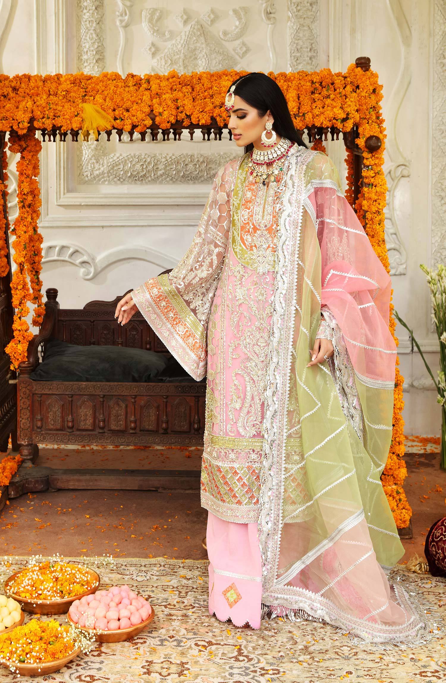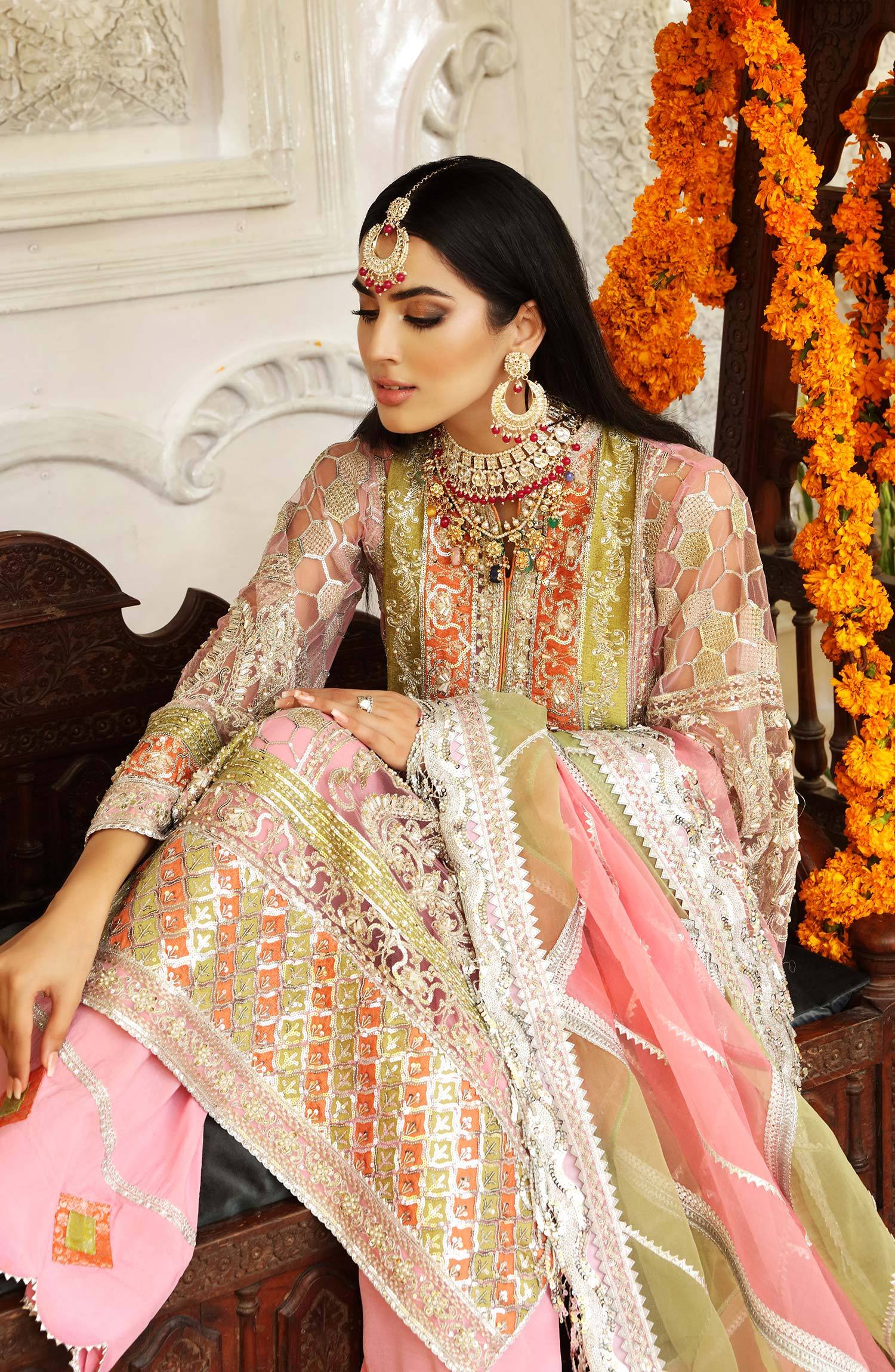 Fabric: Embroidered net handmade front & sleeves Embroidered net back Embroidered organza handmade front daman patch Embroidered organza back daman & neck Patti patch Organza laser dupatta with embroidered organza Patti patch Grip Trouser |