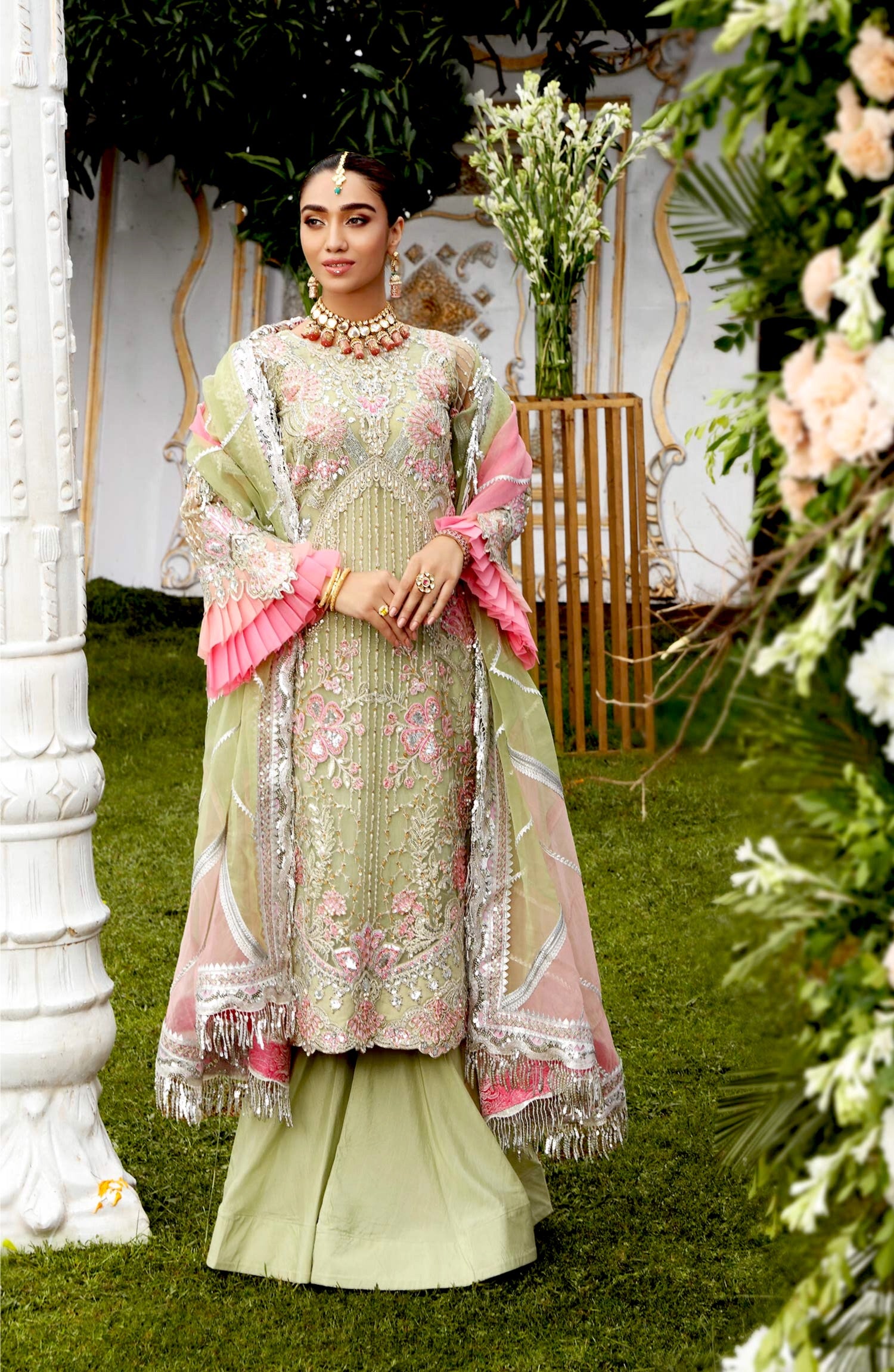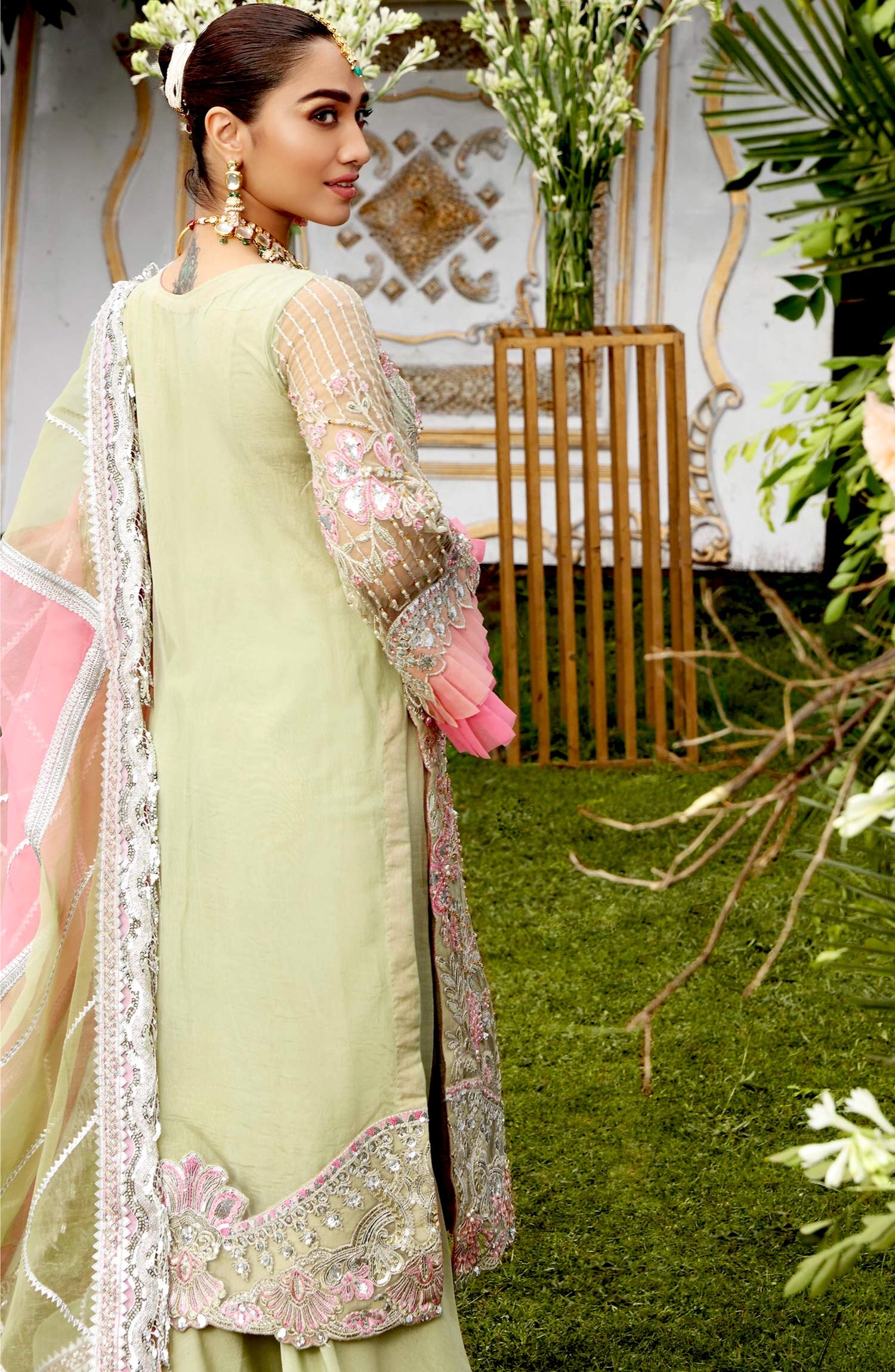 Fabric: Embroidered handmade net front & sleeves Net back Embroidered handmade net front daman patch Embroidered net back daman patch Organza laser dupatta with embroidered patti patch Grip trouser |