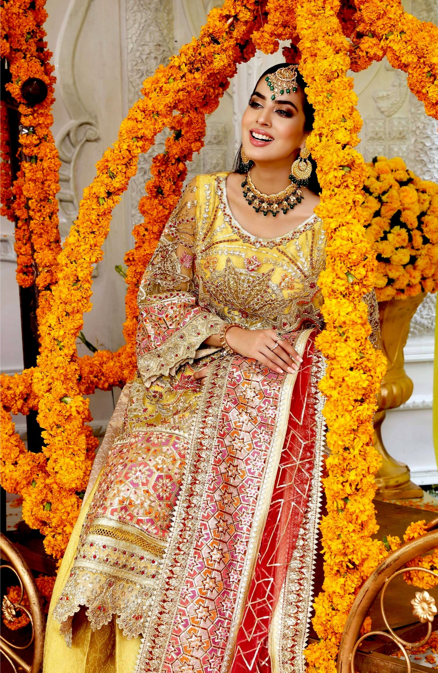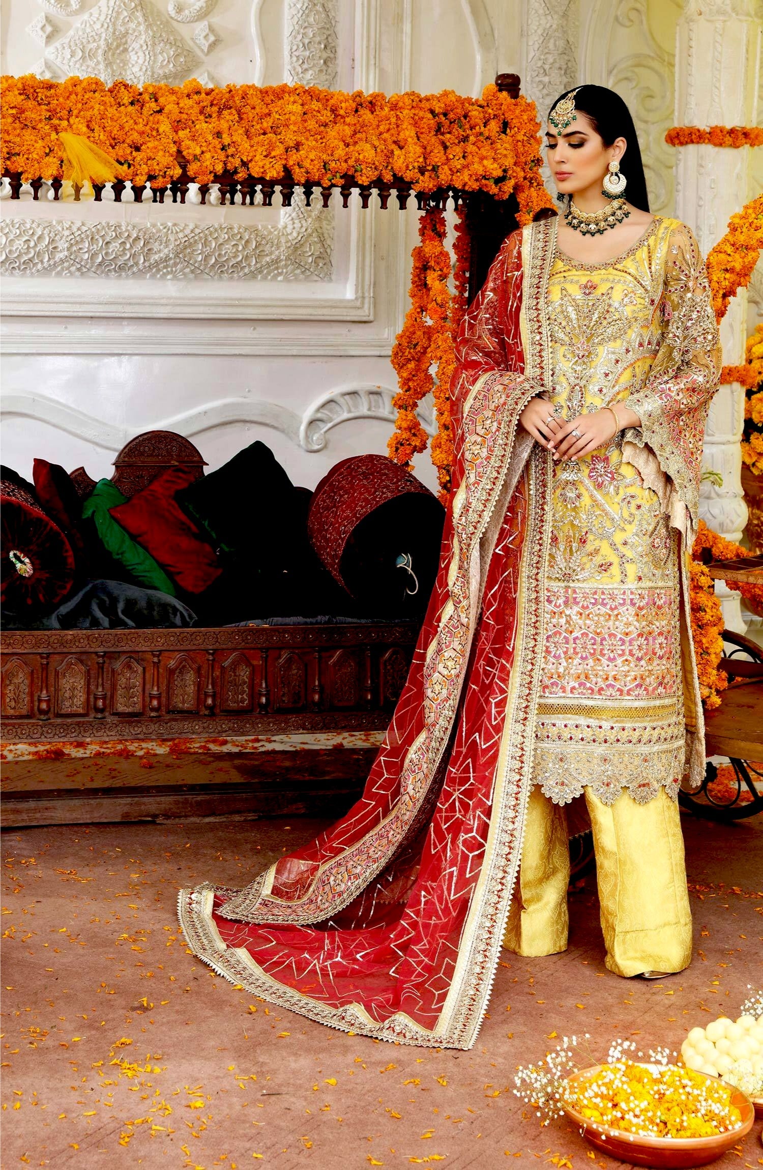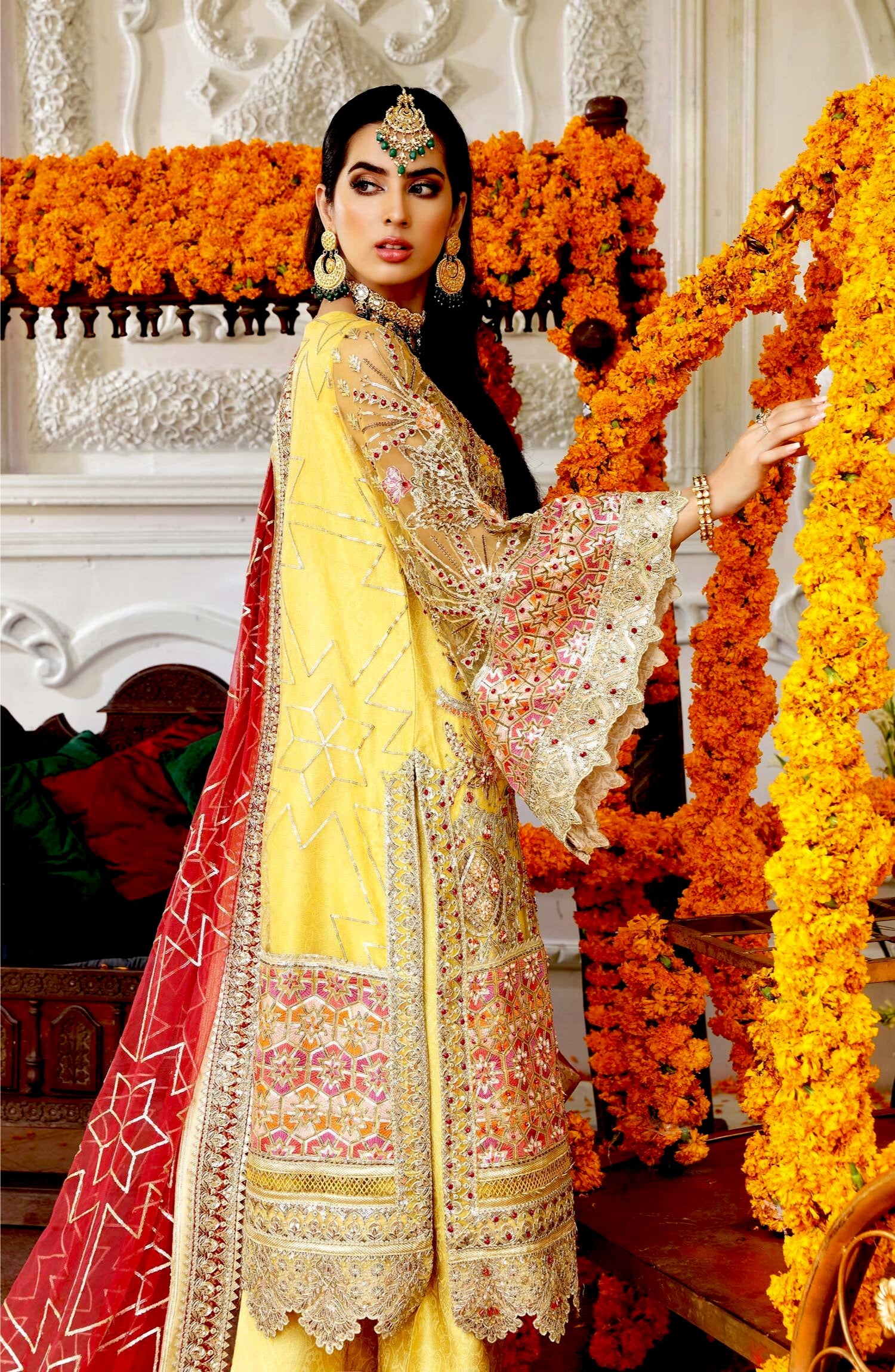 Fabric: Embroidered net handmade front & sleeves Embroidered net back Embroidered organza handmade front daman patches & slit Patti patch Embroidered organza back daman patches & slit Patti patch Embroidered net dupatta with organza Patti patch Jamawar trouser  |