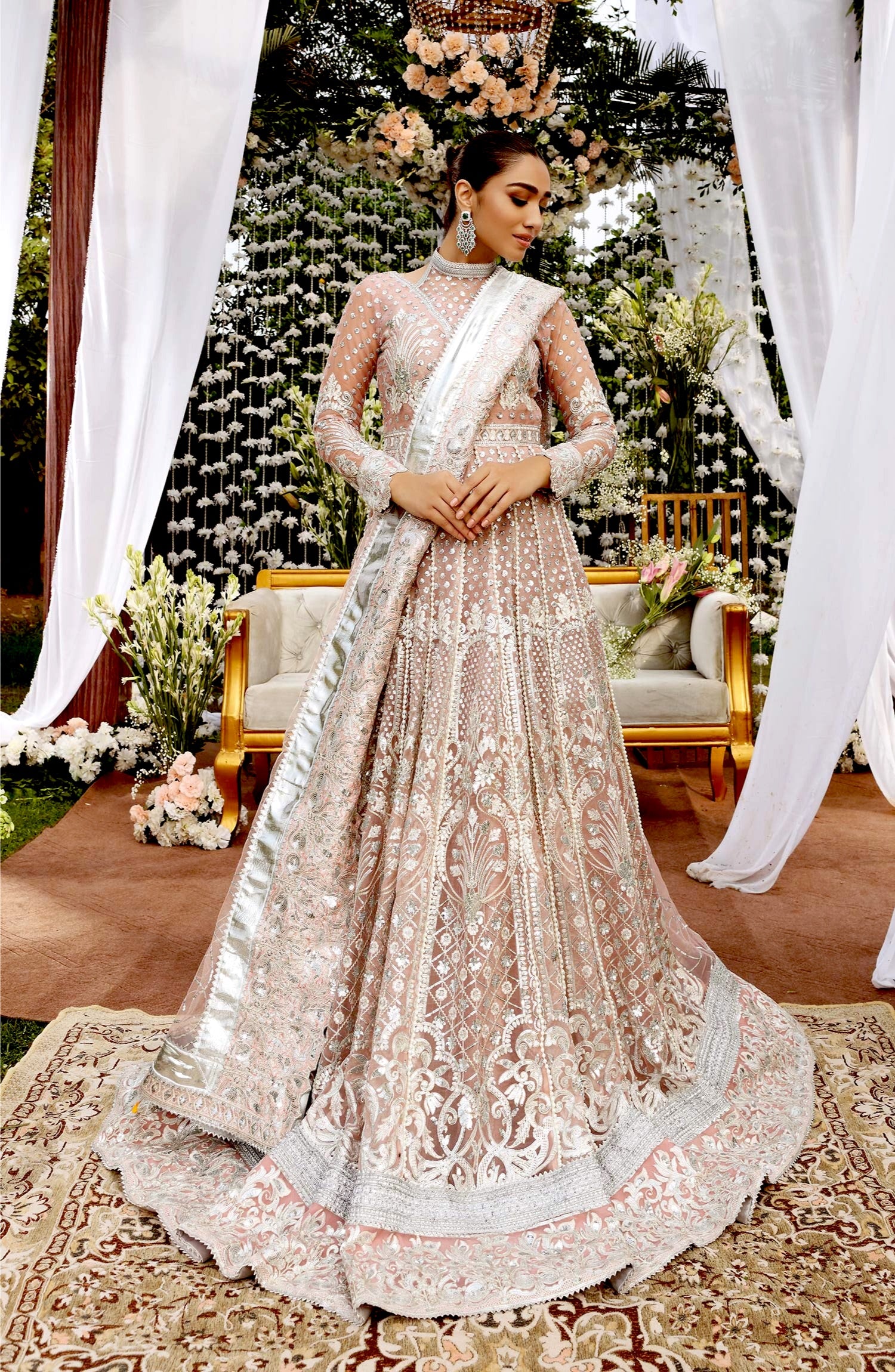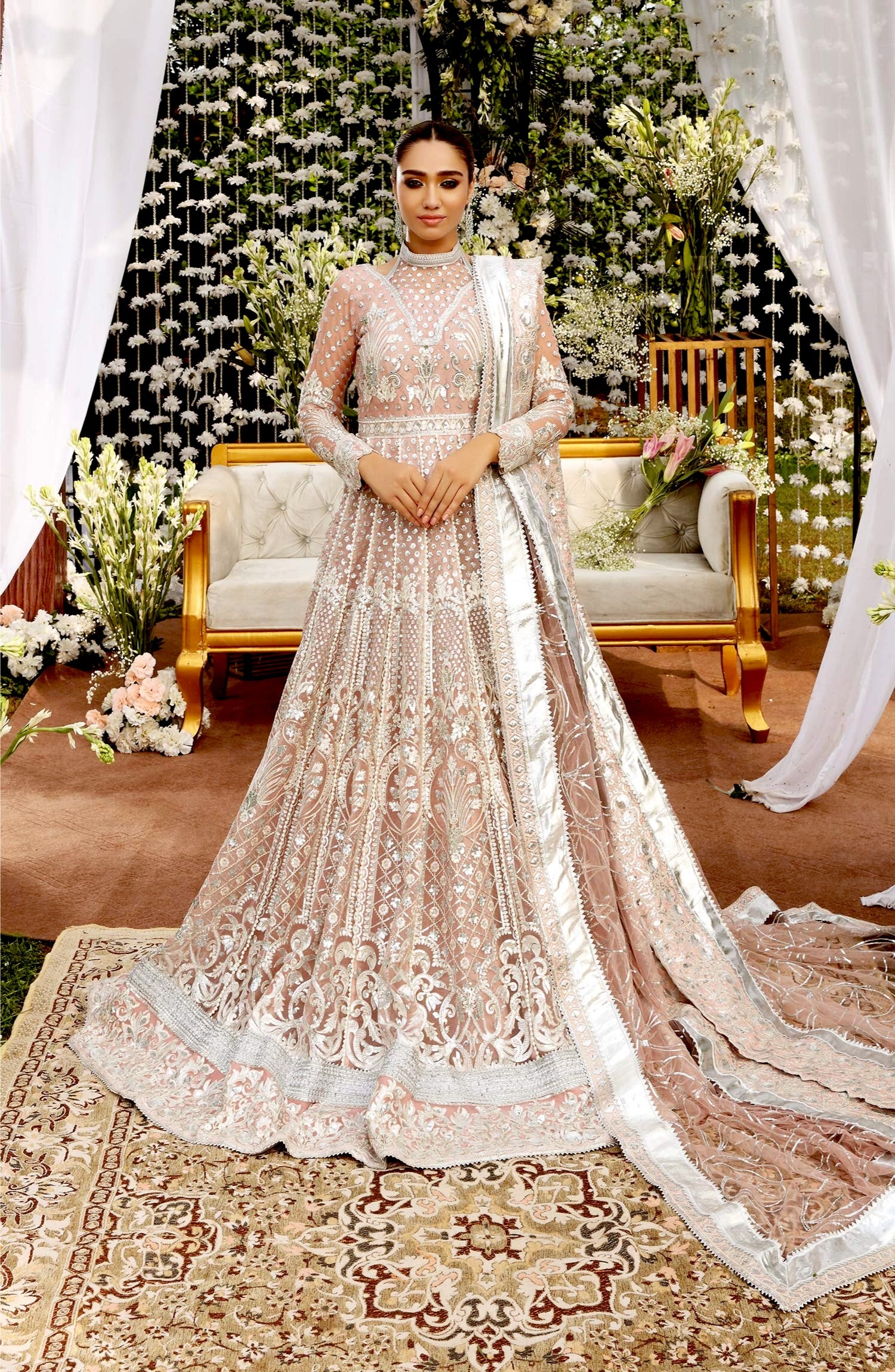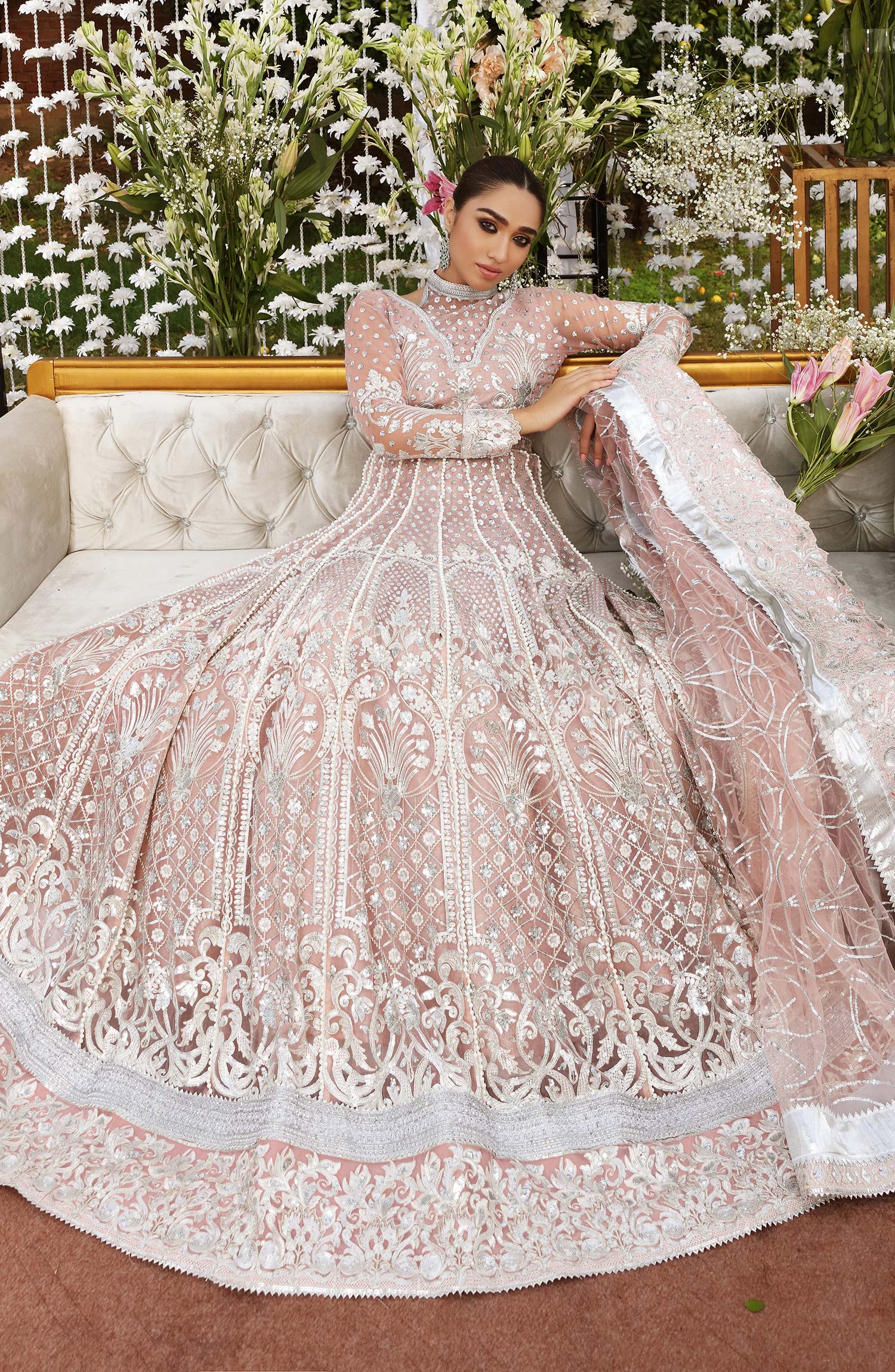 Fabric: Embroidered organza front & back kali, with sleeves & bodice Embroidered organza front back daman patch Embroidered organza sleeves & net patti patch Embroidered net dupatta with jamawar patti patch Grip trouser |