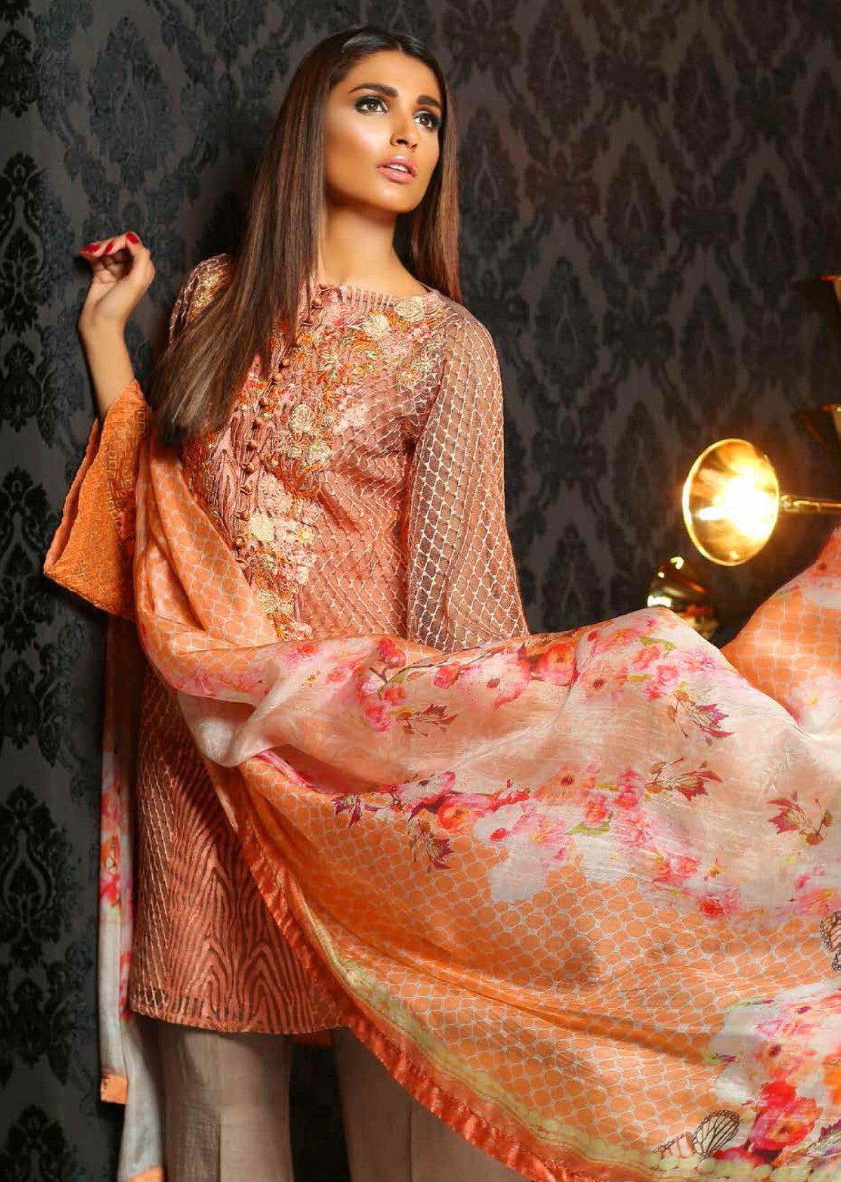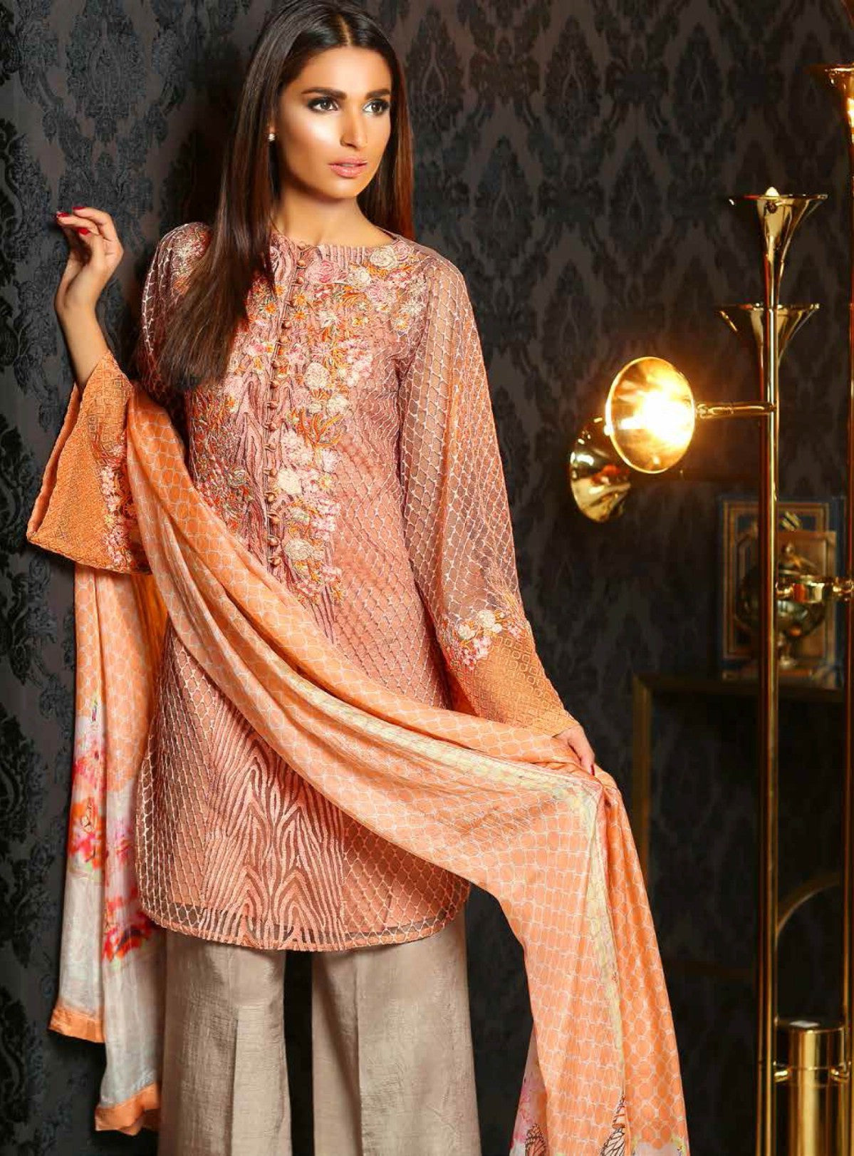 | Fabric | Front: Embroidered Net Back: Plain net Sleeves: Embroidered net Duppata:Digital printed silk Trouser: Silk |