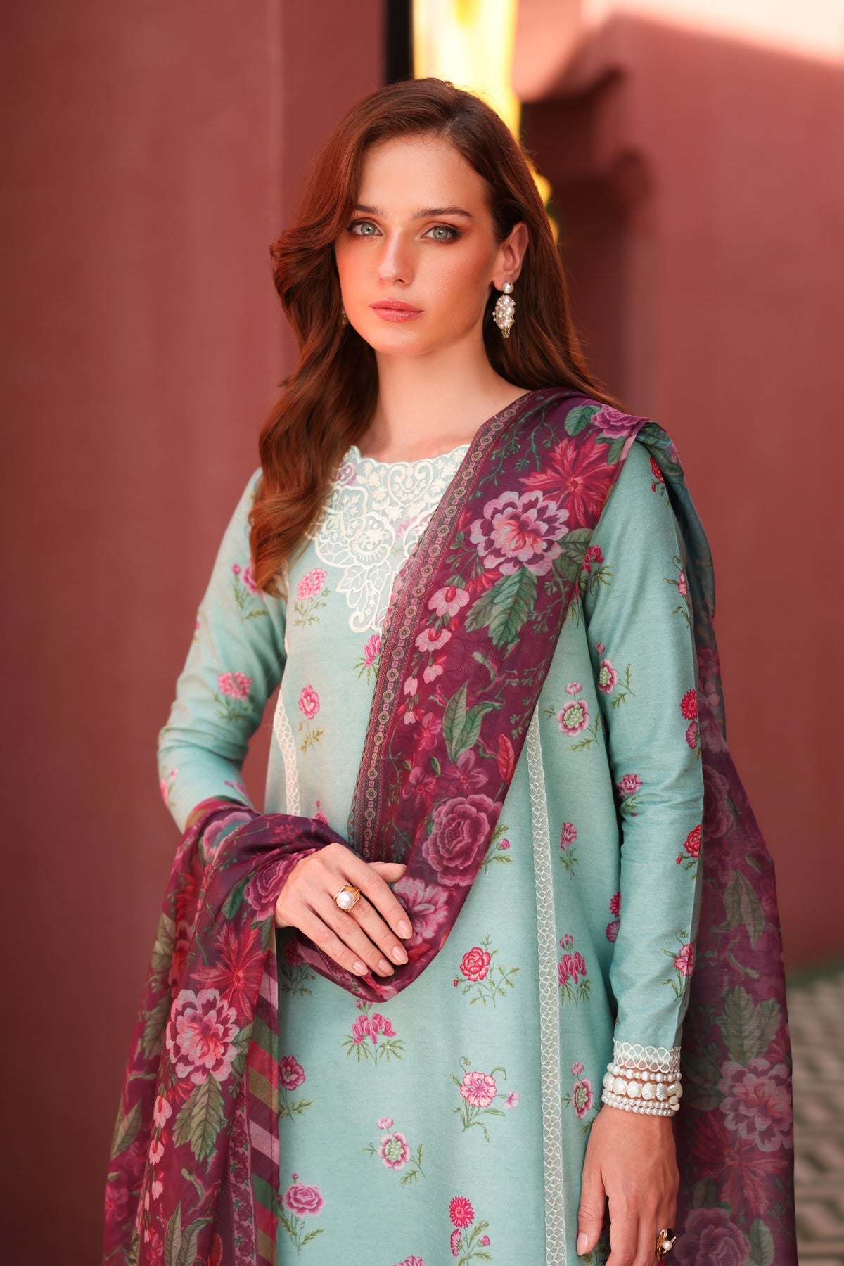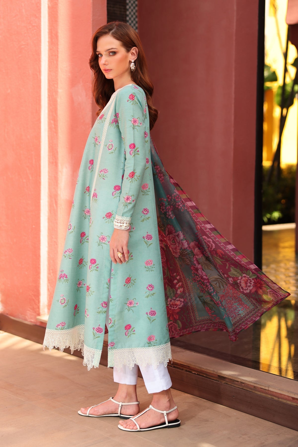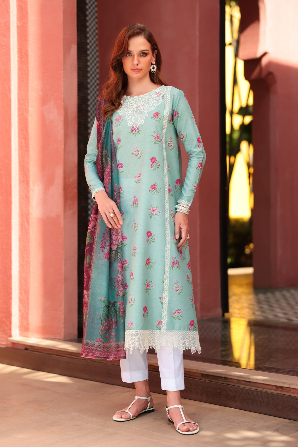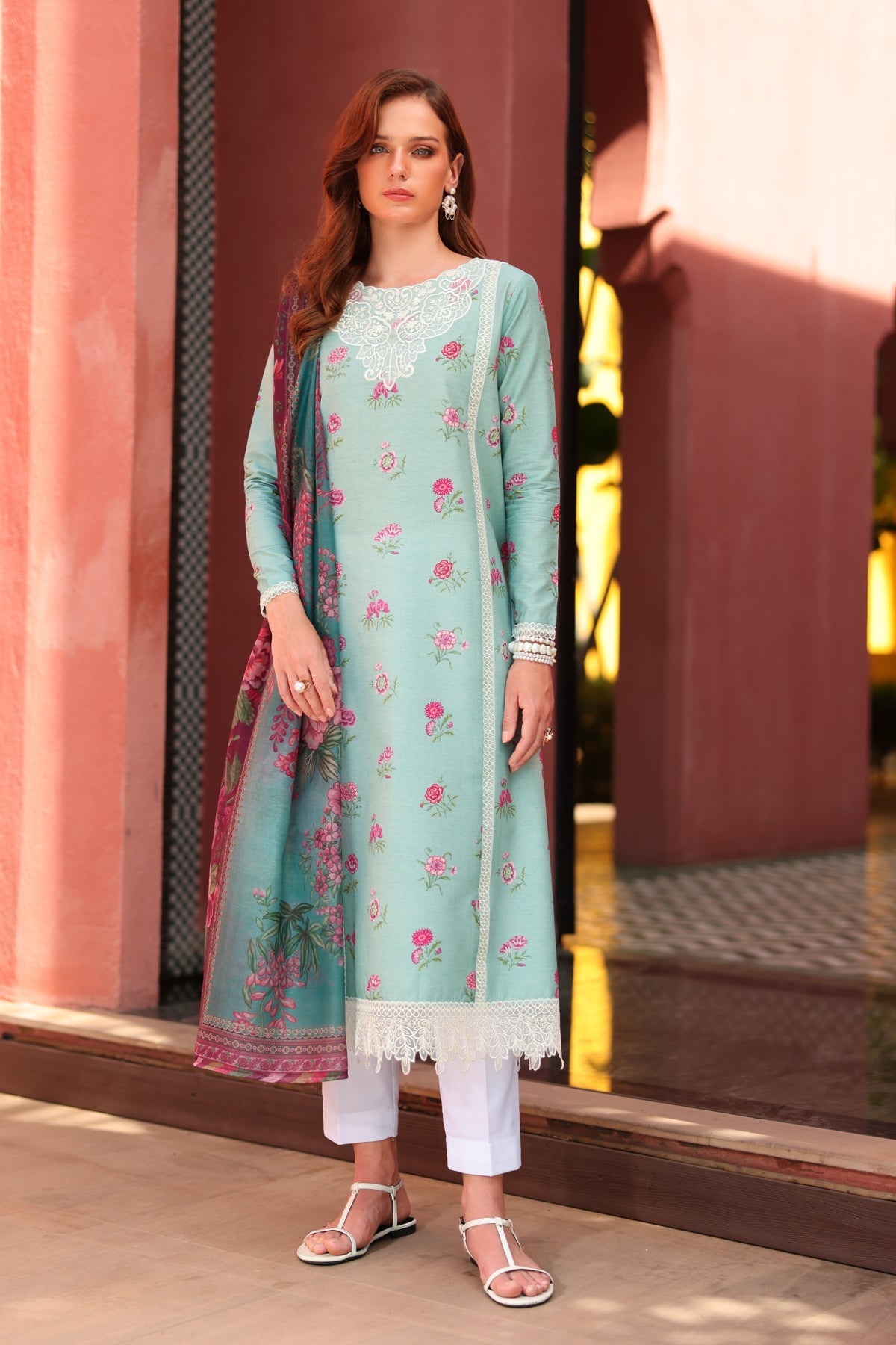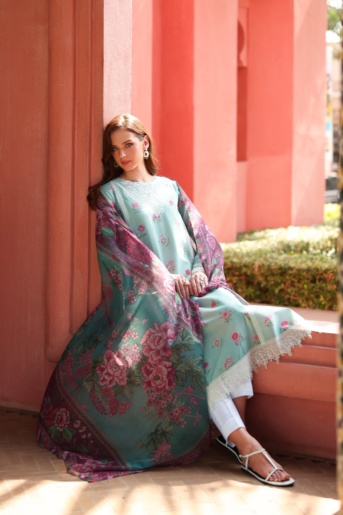 Summary: Experience the charm of summer with this exquisite Sea Green Pakistani lawn suit from the Xenia Eid Edit. This unstitched ensemble centers on a premium lawn shirt, beautifully adorned with vibrant pink floral prints and a delicate white embroidered neckline that elevates the aesthetic. Paired with a lightweight printed Swiss Voile dupatta, this outfit offers breathable comfort ideal for the sweltering Spring/Summer months. The refreshing sea green hue makes it a perfect choice for Eid celebrations, daytime parties, or semi-formal gatherings. Whether styled as a traditional shalwar kameez or a chic trouser suit, this authentic Pakistani dress brings a touch of floral elegance to your wardrobe. Shop this festive summer essential online now.