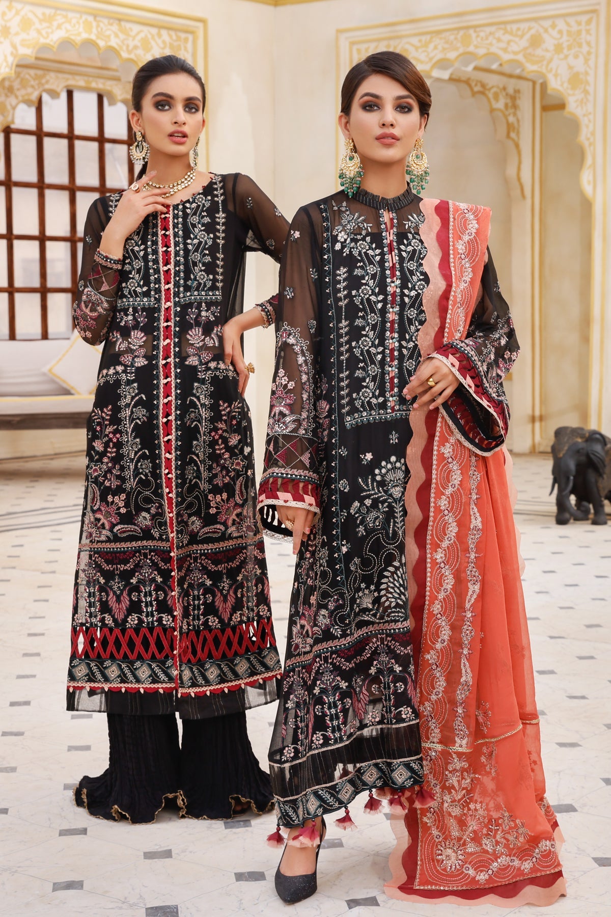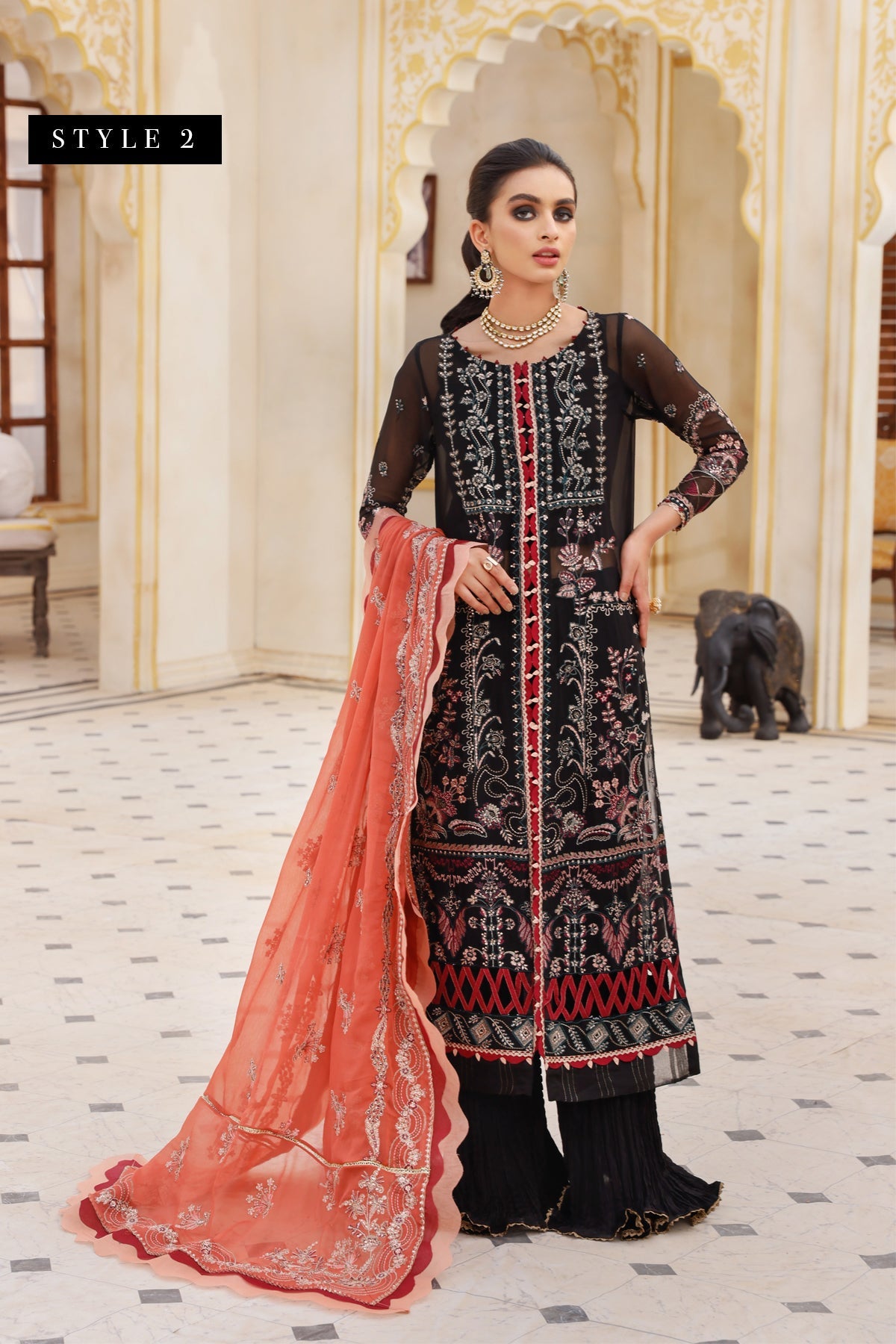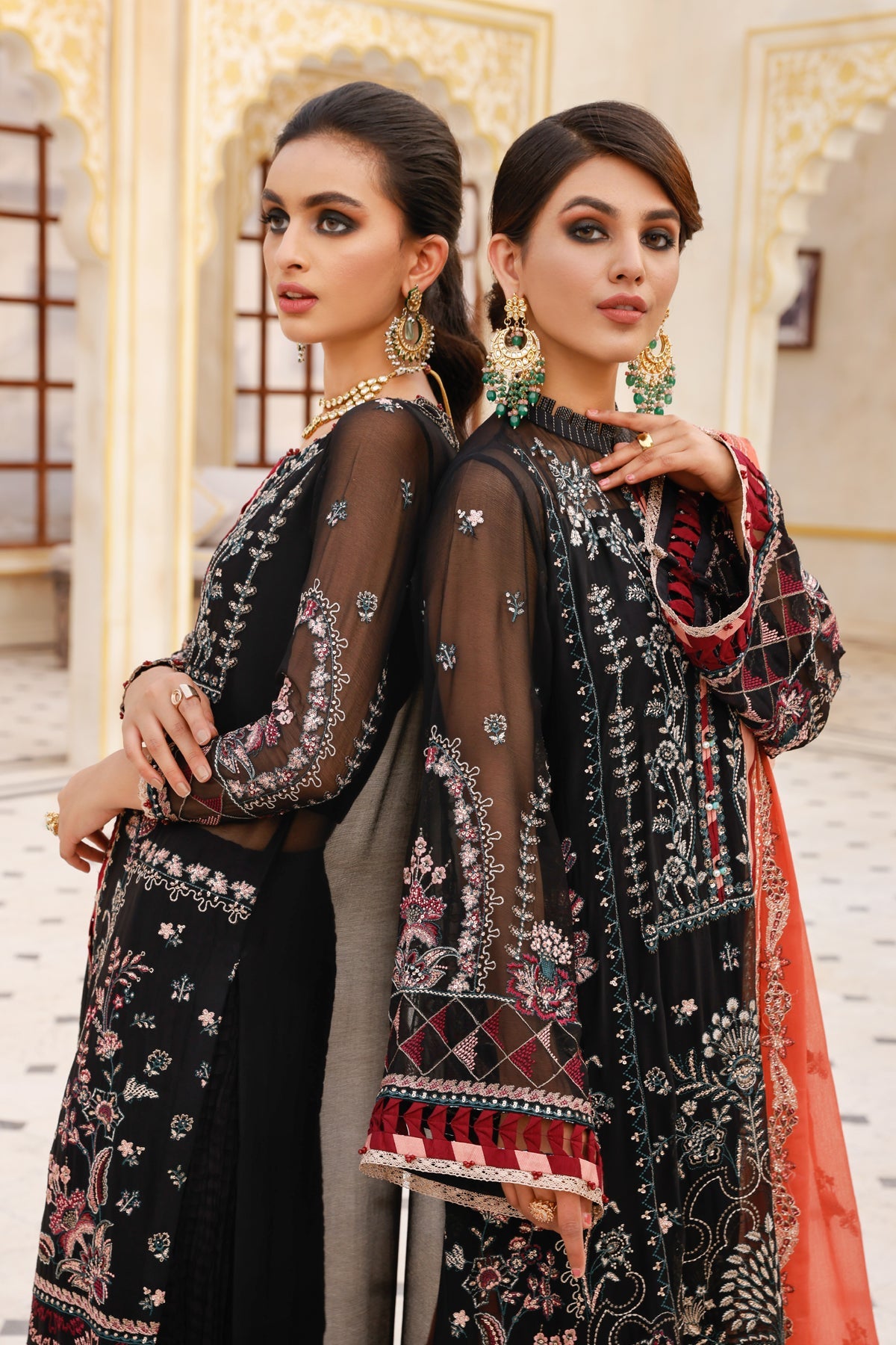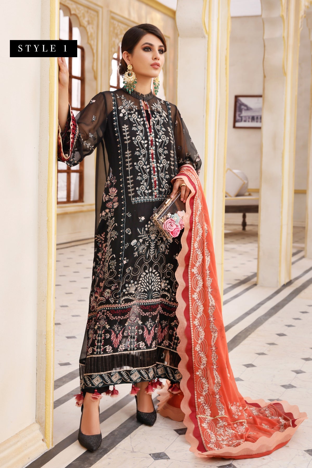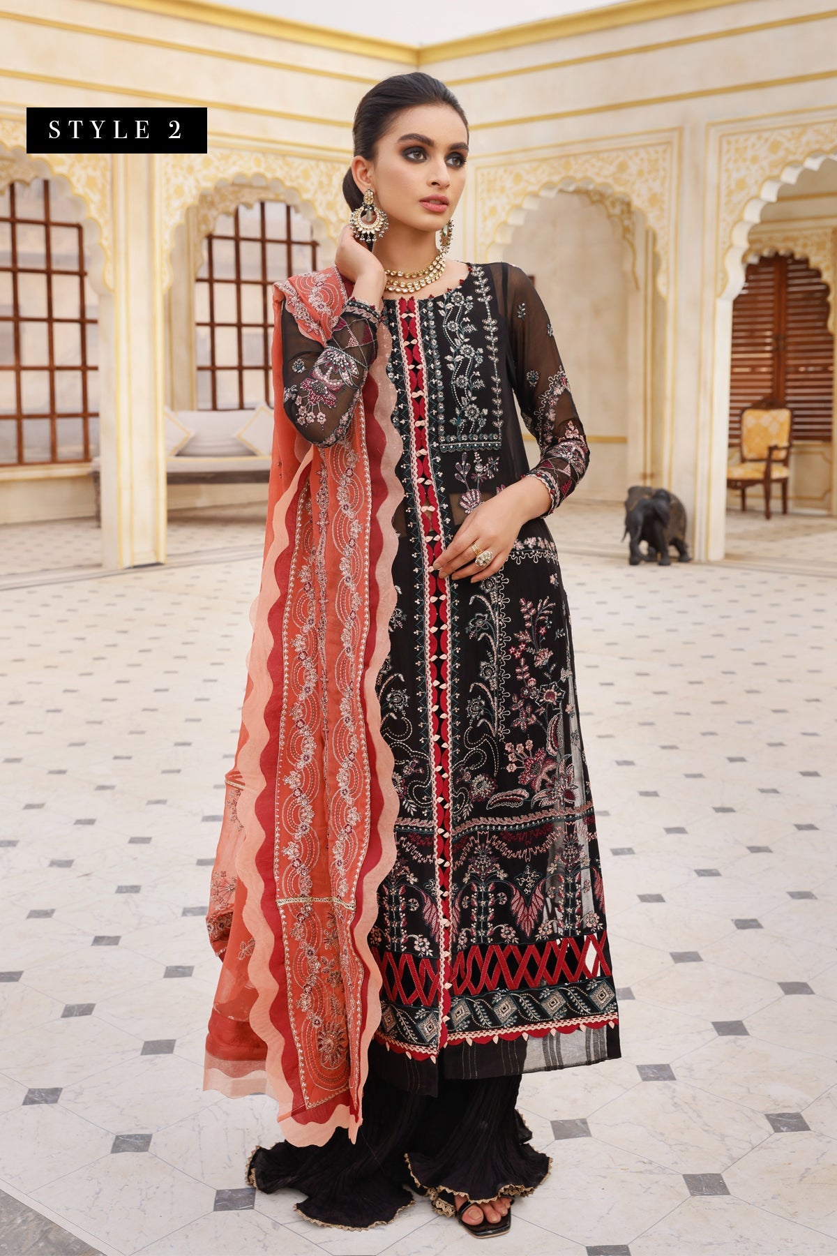 | Fabric: EMBROIDERED CHIFFON FRONT PANEL 12 INCHES EMBROIDERED CHIFFON RIGHT PANEL 12 INCHES EMBROIDERED CHIFFON LEFT PANEL 12 INCHES CHIFFON BACK 36 INCHES EMBROIDERED CHIFFON SLEEVES 22 INCHES EMBROIDERED FRONT & BACK PATCH EMBROIDERED CHIFFON DUPATTA 2.50 YARDS EMBROIDERED CHIFFON PALLU RAWSILK TROUSER 2.50 YARDS |