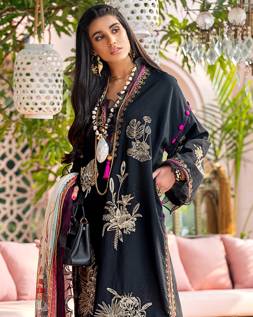 Fabric: An enigmatic midnight canvas is adorned with delicate ivory chinois florals in 'Delina.' Paired with a lushly illustrated dupatta in lovely shades of pink and burgundy, this is a perfect look for a night out on the town! -EMBROIDERED SHIRT FRONT (JACQUARD ) 1.20 meters -DYED SHIRT BACK (JACQUARD ) 1.20 meters -EMBROIDERED SHIRT SLEEVES (LAWN) 1.06 meters -DYED TROUSER (COTTON) 2.50 meters -EMBROIDERED NECKLINE PATTI (JACQUARD) 1.98 meters -DIGITAL PRINTED DUPPATA (CRINKLE) 2.50 meters |