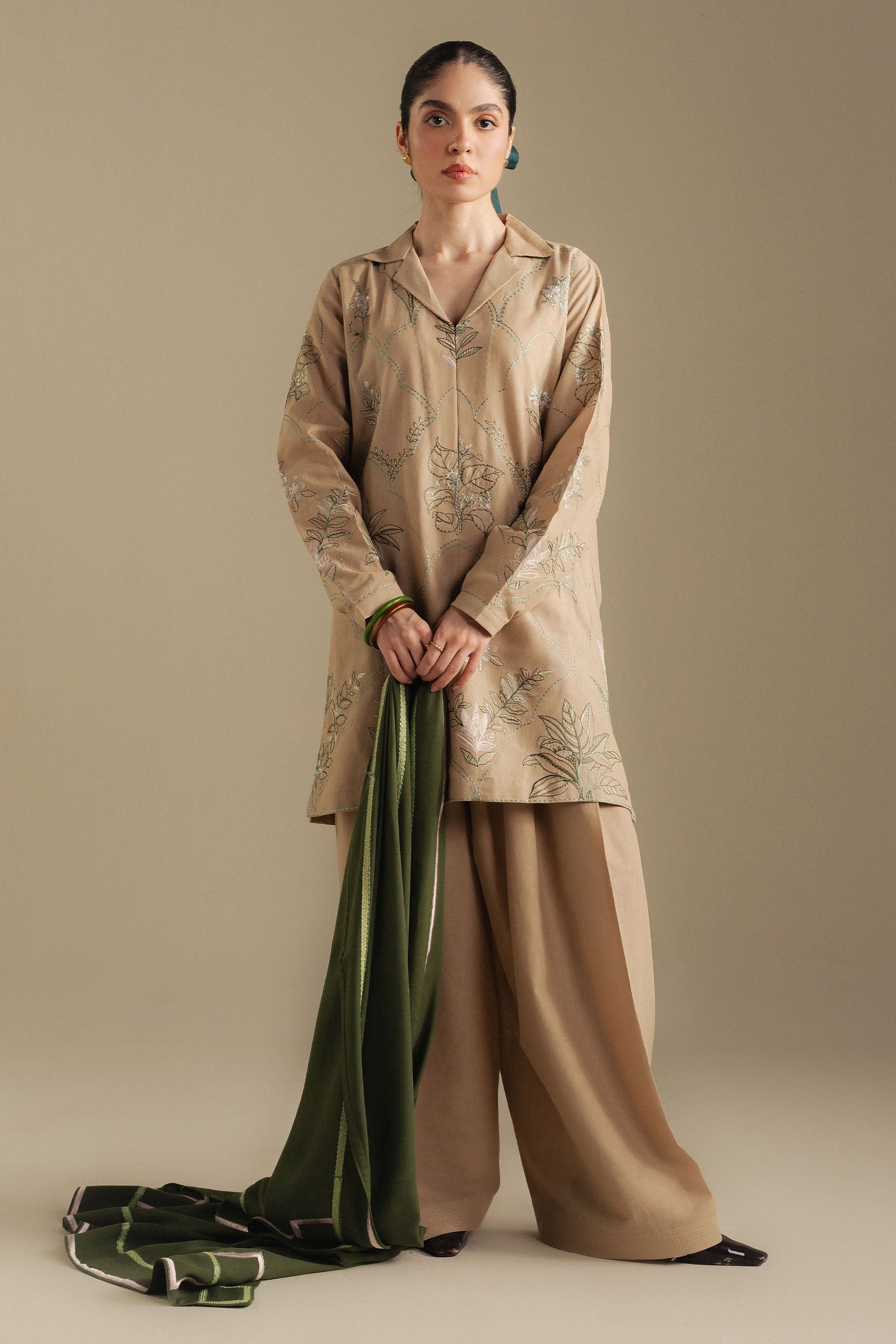 Summary: Discover timeless elegance with this Zara Shahjahan Pakistani suit from the Coco Fall/Winter collection. This ensemble features a sophisticated beige kameez crafted from premium Khaddar, a fabric renowned for its warmth and comfort, making it an ideal winter outfit. The shirt is styled with a contemporary collared neckline and is adorned with delicate, tonal floral embroidery across the front and sleeves. This unstitched ethnic wear piece offers a blend of traditional craftsmanship and modern design, perfect for formal daytime events or chic evening gatherings. A must-have for your winter wardrobe.