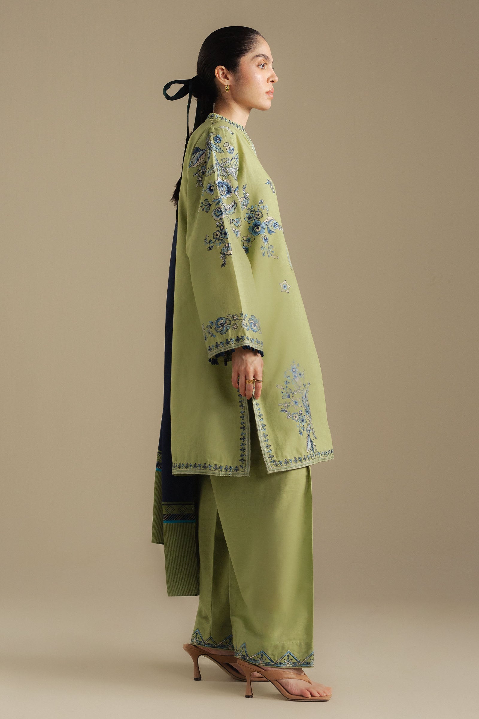 Fabric: An apple green khaddar shirt and trouser paired with a shawl in apple green and blue, a fresh, lively mix that carries winter brightness with ease. Embroidered Plain Khaddar Neps Front 0.66 Mtr Dyed Plain Khaddar Neps Front Right & Left Side Panel 13 Inches Dyed Plain Khaddar Neps Back 1 Mtr Embroidered Plain Khaddar Neps Sleeves 0.66 Mtr Printed Marina Twill Shawl 2.5 Mtrs Embroidered Plain Khaddar Neps Trouser 2 Mtrs |
