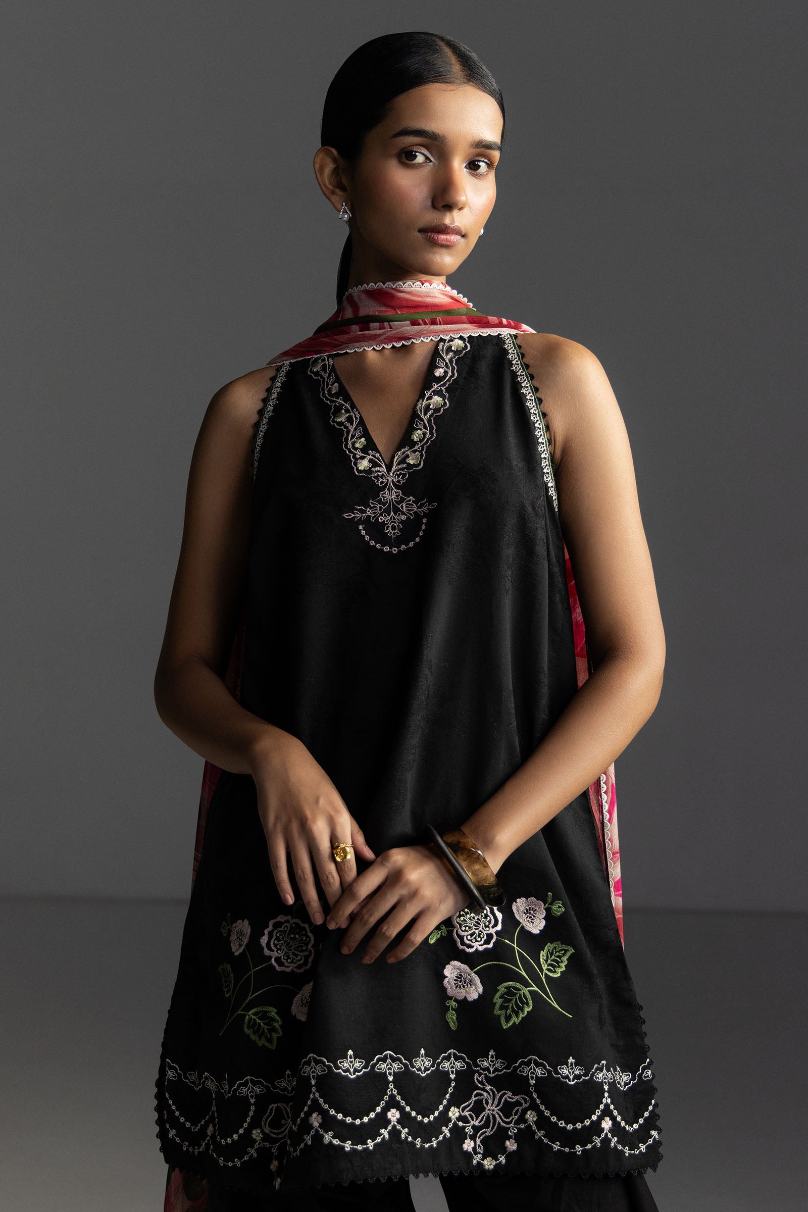 An embroidered black shirt with lace and floral inspired details, paired with a dyed black trouser, and finished with a printed hot pink and maroon dupatta for a bold yet graceful look.