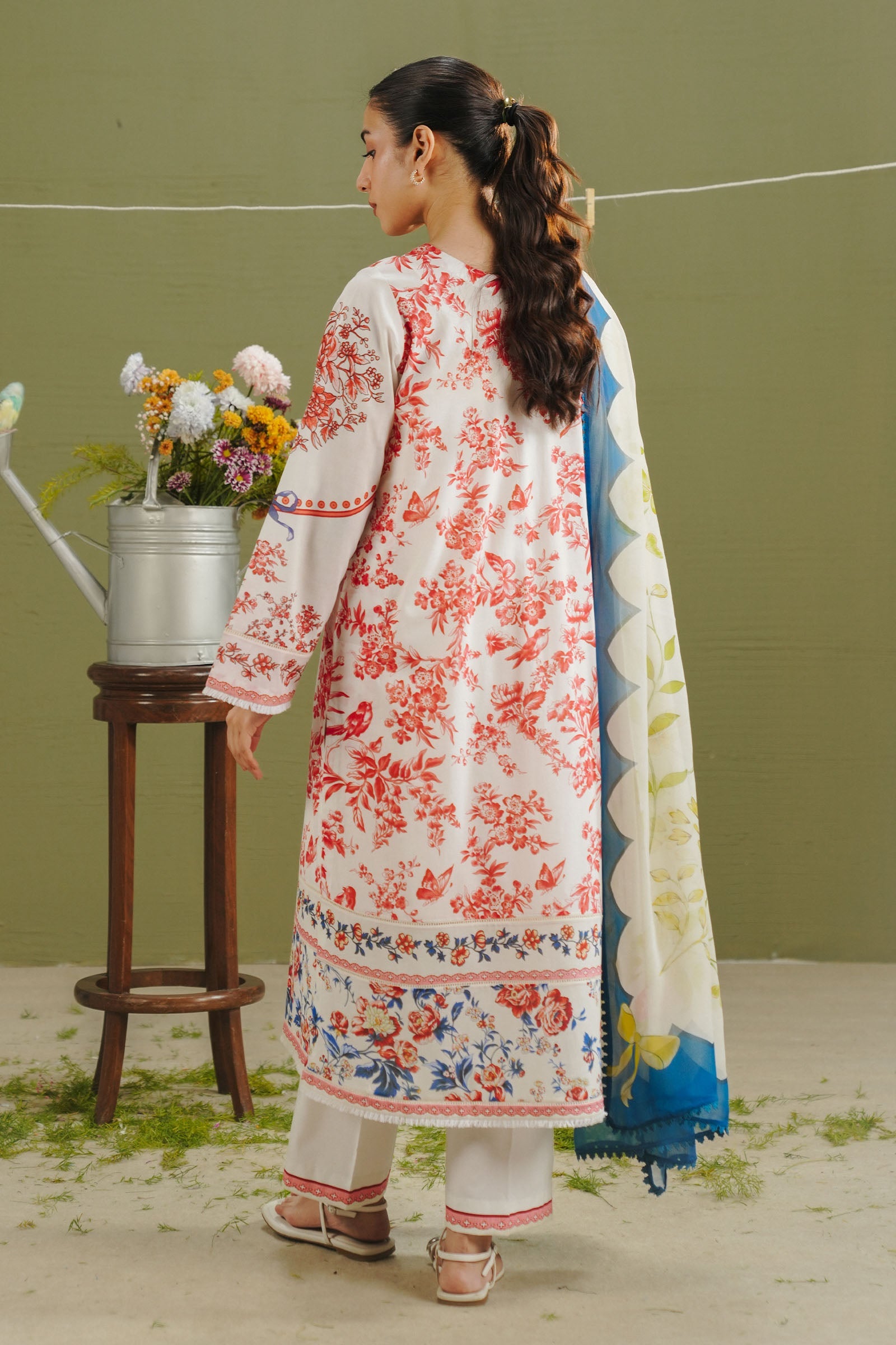 Fabric: The dupatta features a neatly arranged floral print with a blue scalloped border on pearl white. The shirt carries cherry red floral prints on a pearl white base. The trouser is finished with a pink lace border on pearl white. Digital Printed Chiffon Dupatta 2.50 Mtrs Digital Printed Lawn Shirt 3.30 Mtrs Digital Printed Cambric Trouser 2 Mtrs |
