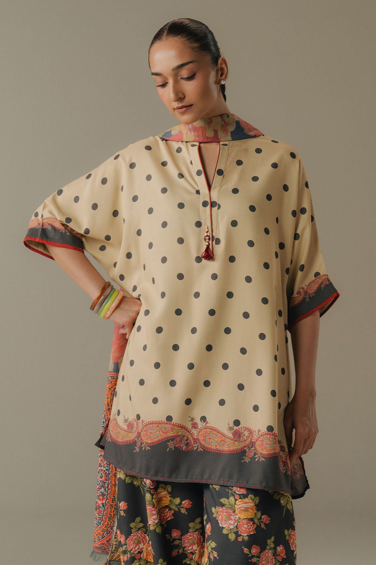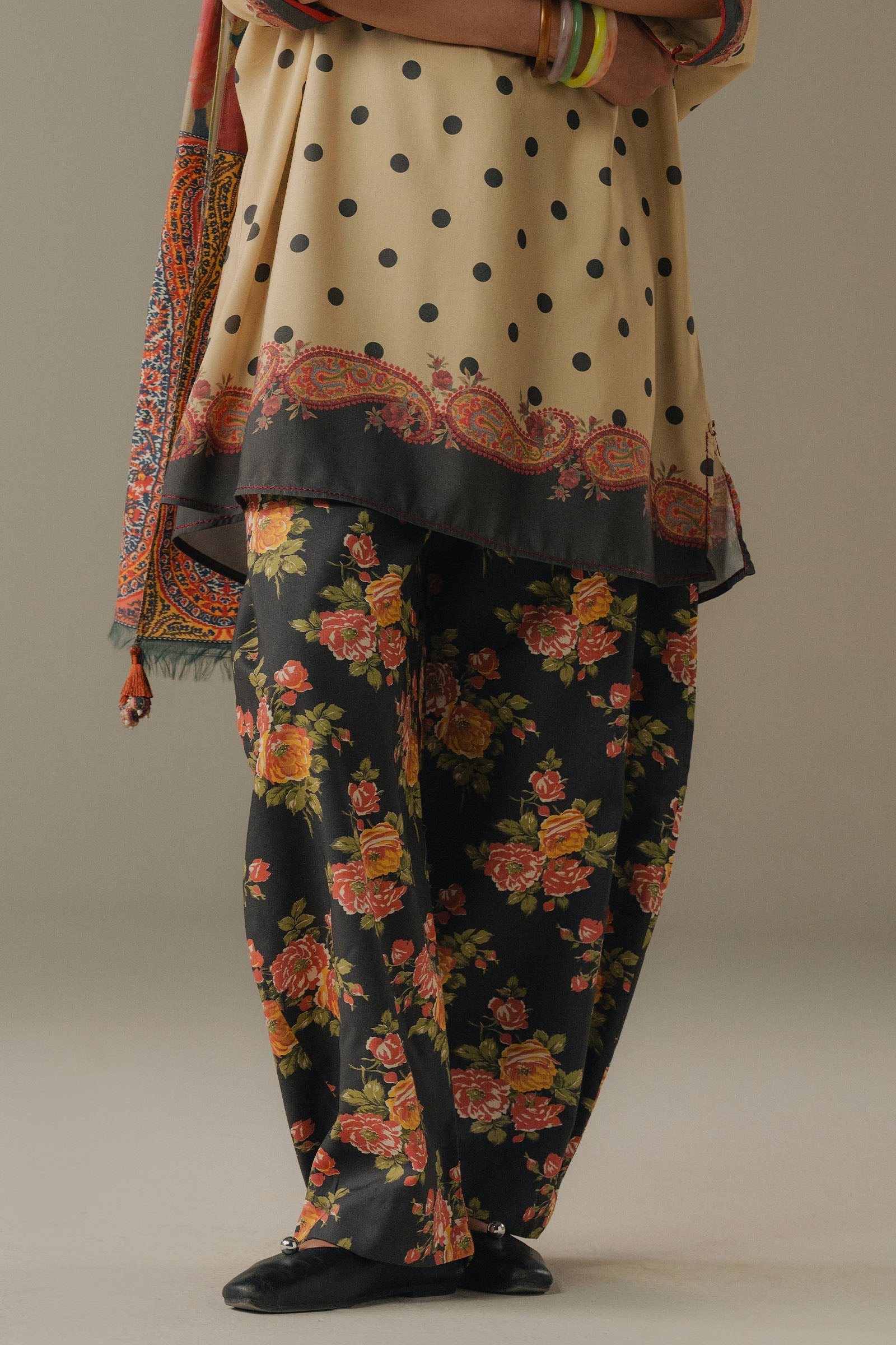 Summary: Embrace winter elegance with this Pakistani suit from Zara Shahjahan's Coco Prints Winter Edit. The ensemble features a sophisticated beige kameez crafted from high-quality linen, ensuring warmth and comfort throughout the Fall/Winter season. The shirt is beautifully adorned with a timeless black polka dot pattern, offset by a contrasting paisley and floral border that adds a touch of traditional artistry. This unstitched ethnic wear piece offers a blend of modern and classic design, making it an ideal choice for daily wear or casual social events.