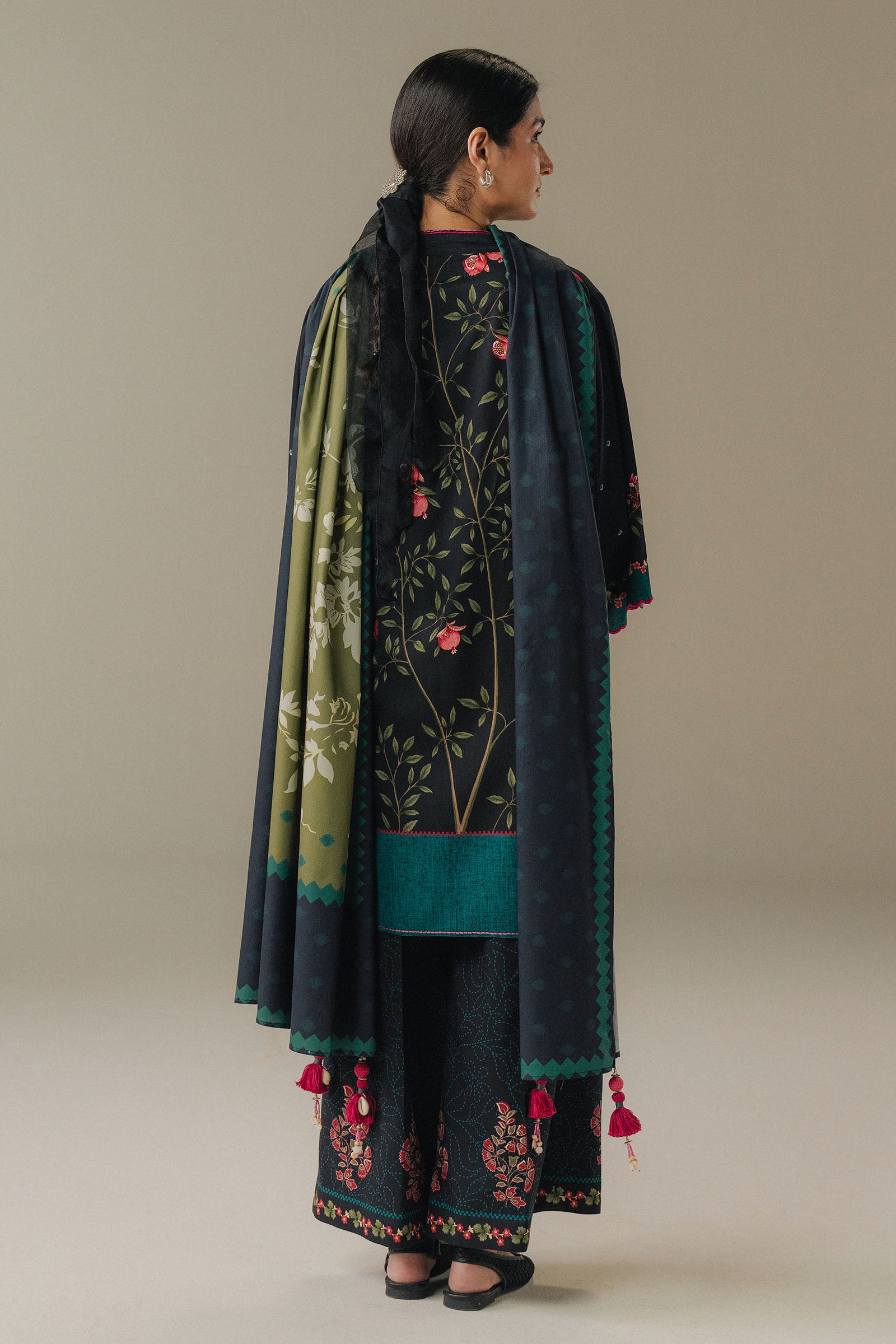 Summary: Embrace winter elegance with this stunning Pakistani suit from Zara Shahjahan's 'Sienna Field' collection. The ensemble features a sophisticated black kameez, beautifully crafted from high-quality linen. Inspired by modern chintz patterns, the shirt showcases a delicate floral vine print that adds artistic flair. The rich linen fabric makes this a perfect Fall/Winter outfit, providing comfort and a graceful silhouette. This black Pakistani dress is a versatile choice for formal wear or elevated evening events. A timeless piece of ethnic wear, it's perfect for creating a chic, contemporary look.