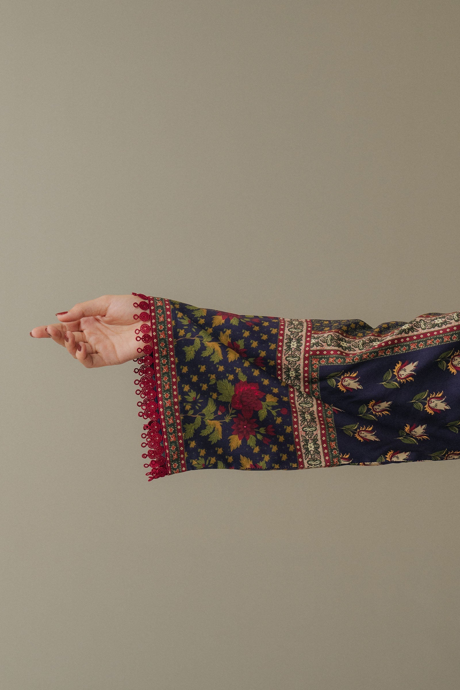 Fabric: A mulberry purple shirt inspired by elegant chintz floral patterns, paired with matching mulberry purple trousers featuring a fusion of oggy motifs and chintz-inspired detailing. The ensemble is completed with a self-mulberry purple shawl, creating a cohesive, graceful look that radiates richness and understated sophistication. Digital Printed BFC Shawl 2.5 Mtrs Digital Printed Linen Shirt 3 Mtrs Digital Printed Linen Trouser 2.3 Mtrs |
