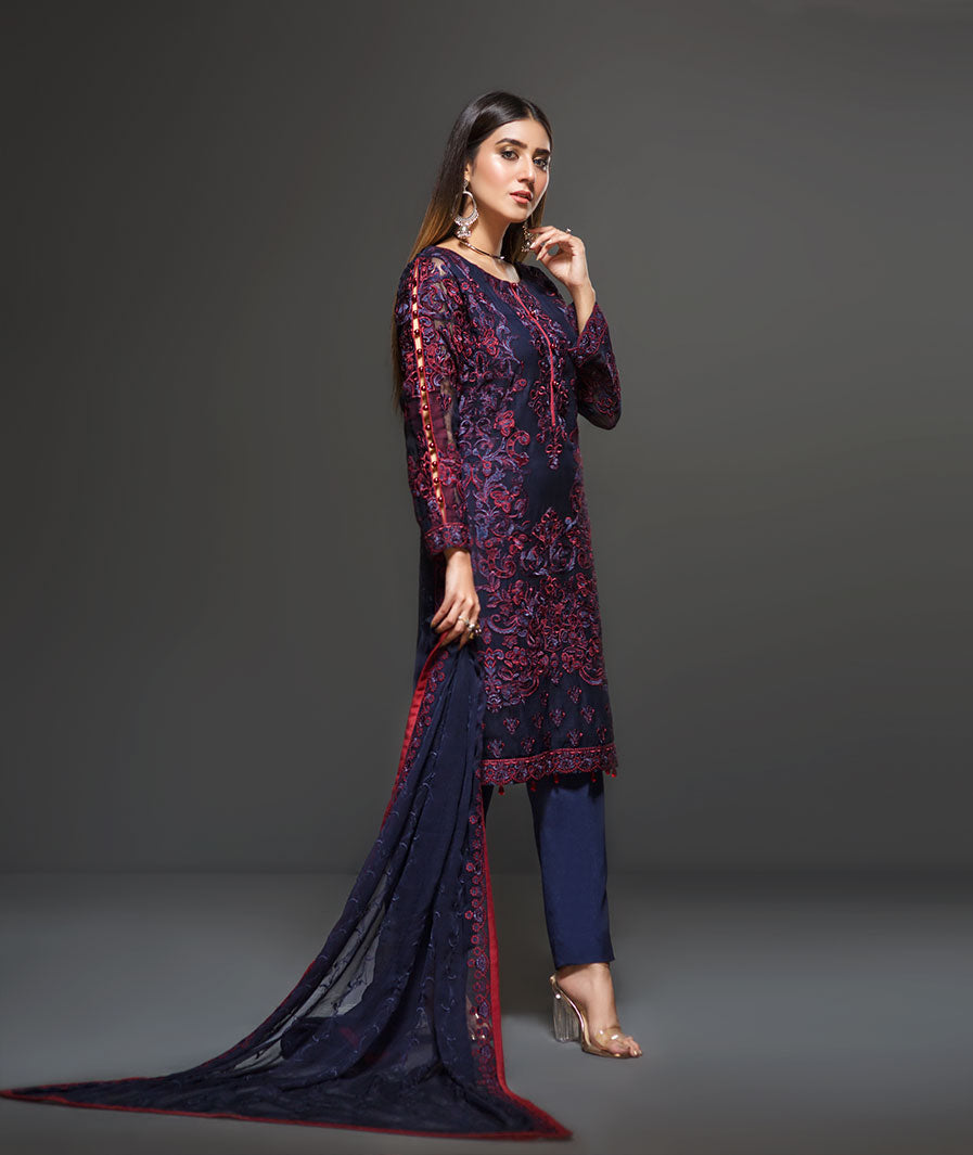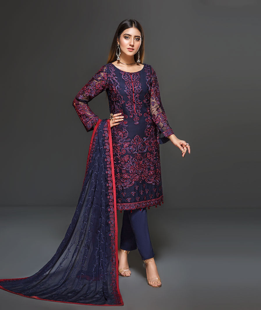 Fabric: The deep blue surface has been brought to life with the indulgence of complementing hues of red and blue. Paired with a beautifully embroidered floral border dupatta ensembles to makes a perfect pair and an effortless formal look. Shirt Front: Embroidered Chiffon Shirt Back: Embroidered Chiffon Sleeves: Embroidered Chiffon Dupatta: Embroidered Chiffon Dupatta Border: Two-Side Embroidered Front & Back Lace: Embroidered Silk Sleeves Lace: Embroidered Silk Trouser: Dyed Grip |