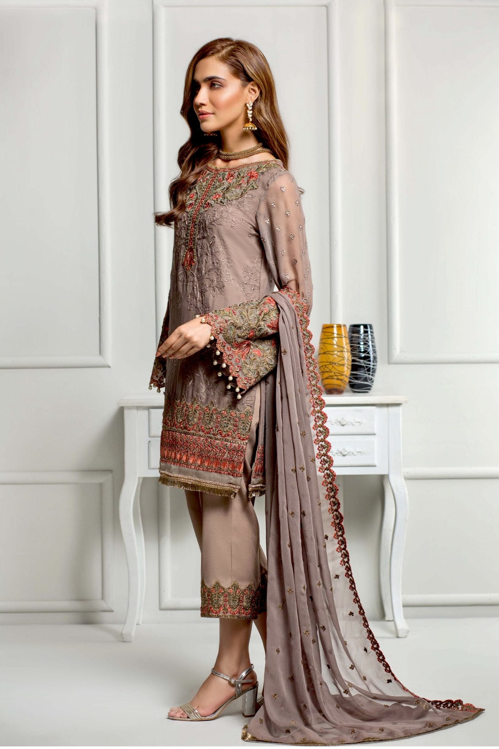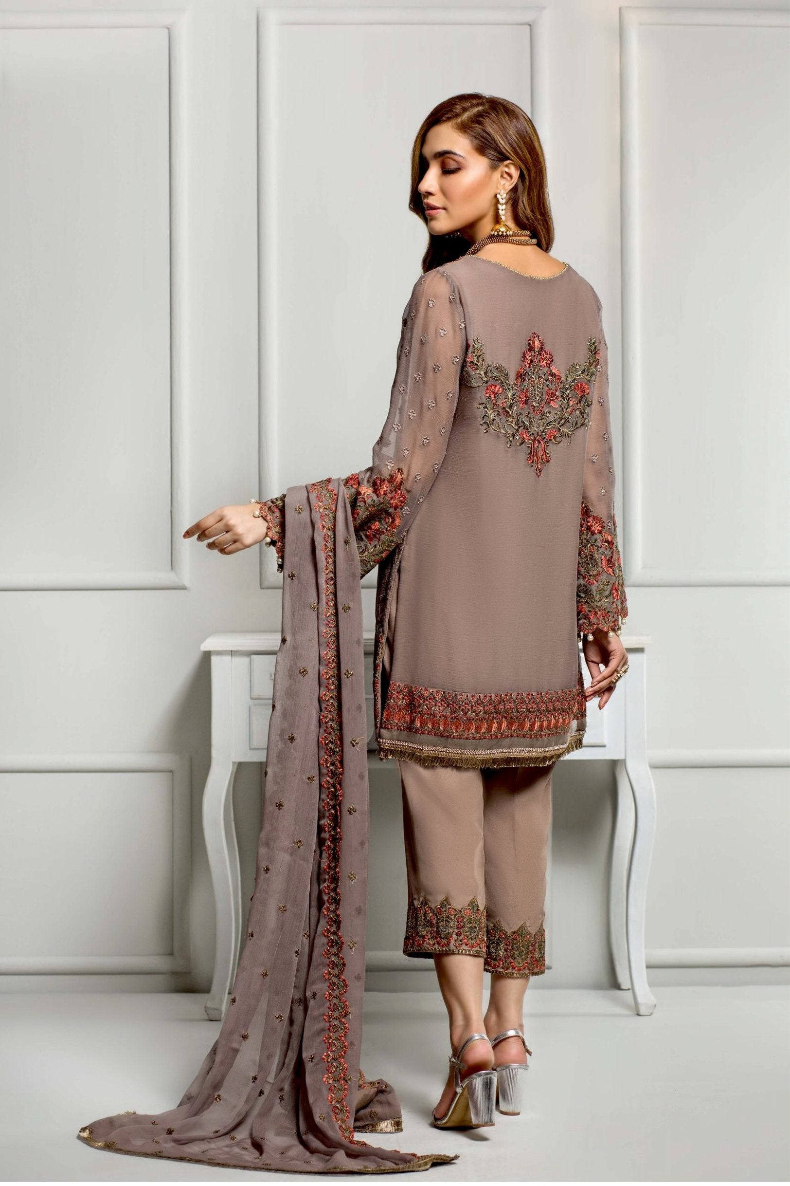 Fabric: Rendered in a contrasting glorious color palette, this design features an exquisite traditional stitch to create an aura of cultural iconography. This subtle and alluring design is a ready to go look on any formal occasions where you wish to stand out with your style statement. Shirt Front: Embroidered Chiffon Shirt Back: Embroidered Chiffon Neckline: Embroidered Patch Sleeves: Embroidered Chiffon Dupatta: Embroidered Two Side Border Front & Back Lace: Embroidered Sleeves Lace: Embroidered Patch Trouser Lace: Embroidered Lace Trouser: Dyed Grip |