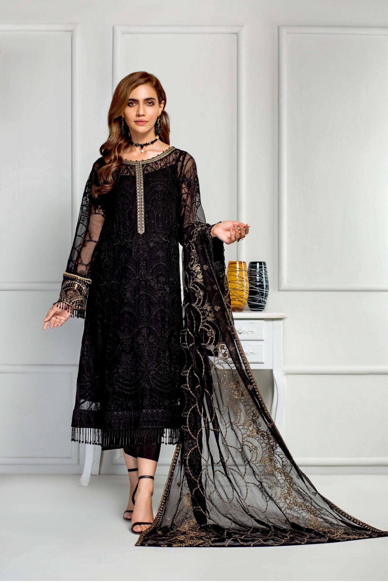 Fabric: An indigenous design featuring an array of exquisite stitches on an overall canvas of same tone of blooming rich black. Layered over an ebony trouser and paired with a rich contrasted border dupatta, this design is a classic and precious keepsake that will remain part of your wardrobe forever. Shirt Front: Embroidered Chiffon Shirt Back: Embroidered Chiffon Neckline: Embroidered Patch Sleeves: Embroidered Chiffon Dupatta: Embroidered Chiffon Sleeves Lace: Embroidered Chiffon Trouser: Dyed Grip |