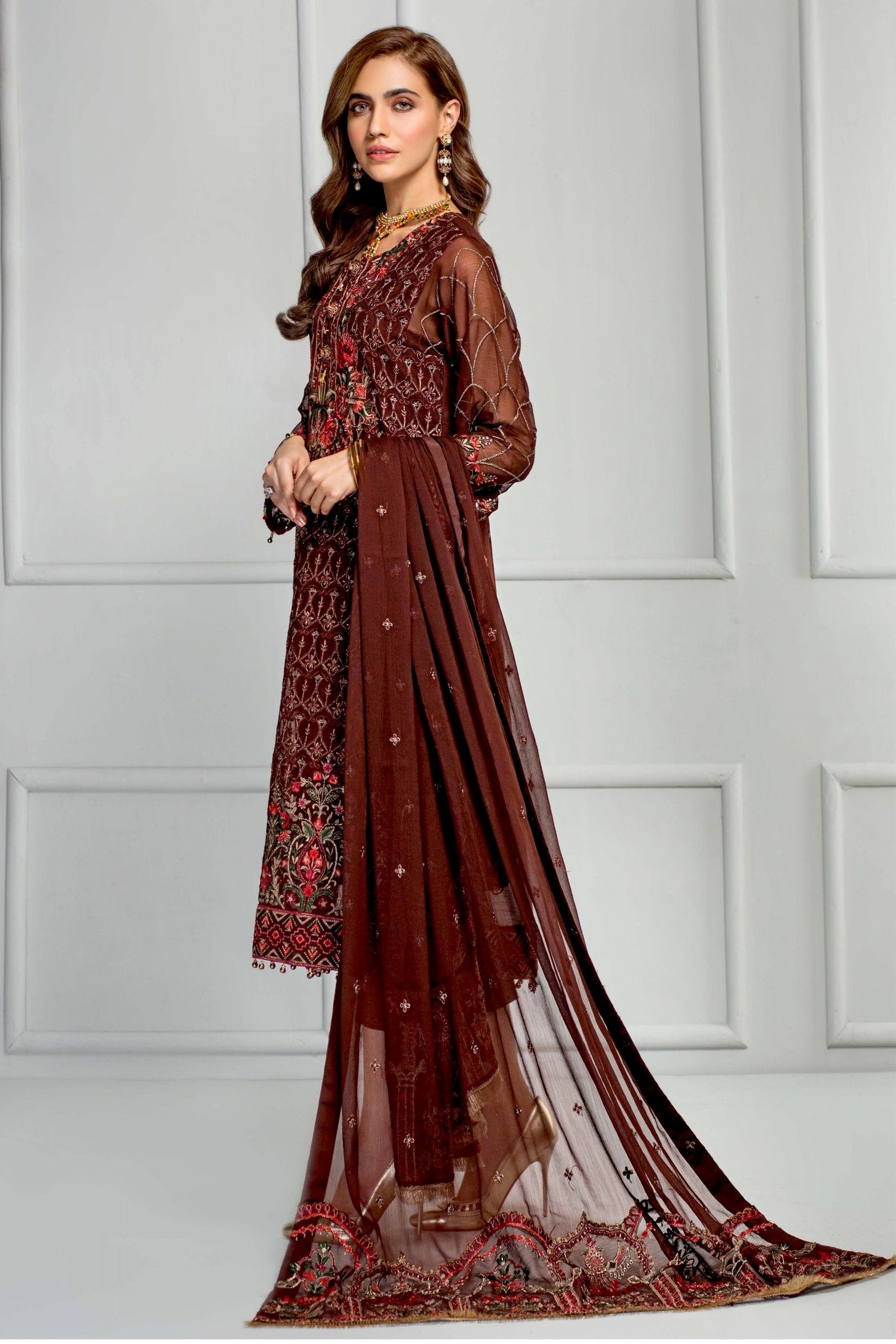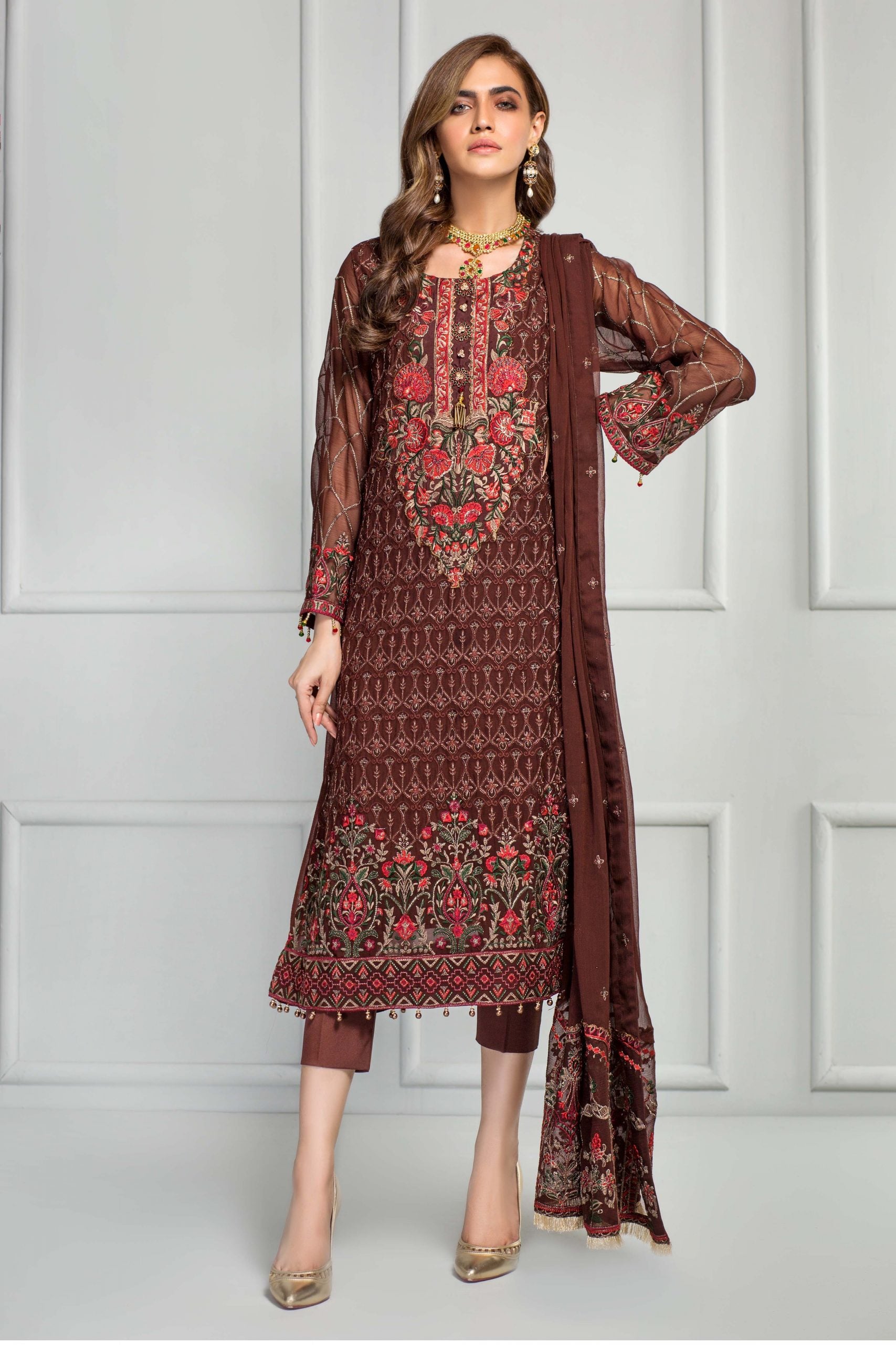 Fabric: Celestially layered with ethnic embroideries, with multi-hued flora and ornamental patterns, this spectacular design makes a bold statement. Paired with an elegantly designed chiffon dupatta this subtle ensemble is the ultimate summer look for the fashion forward woman. Shirt Front: Embroidered Chiffon Shirt Back: Embroidered Chiffon Neckline: Embroidered Silk Patch Sleeves: Embroidered Chiffon Dupatta: Embroidered Pallu Front & Back Lace: Embroidered Lace Sleeves Lace: Embroidered Lace Trouser Lace: Embroidered Lace Trouser: Dyed Grip |